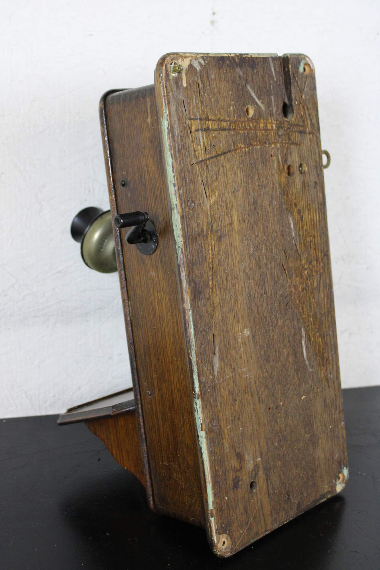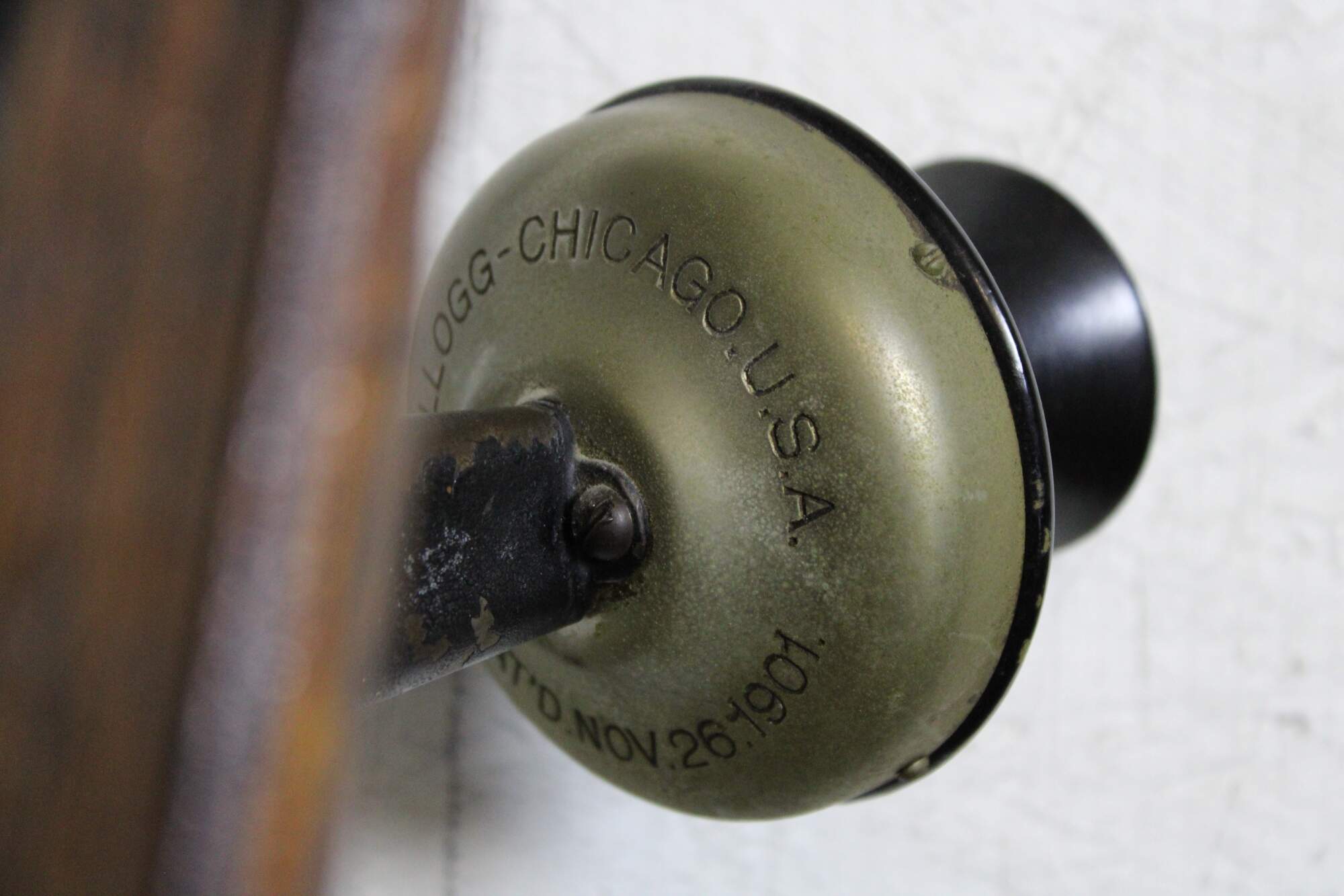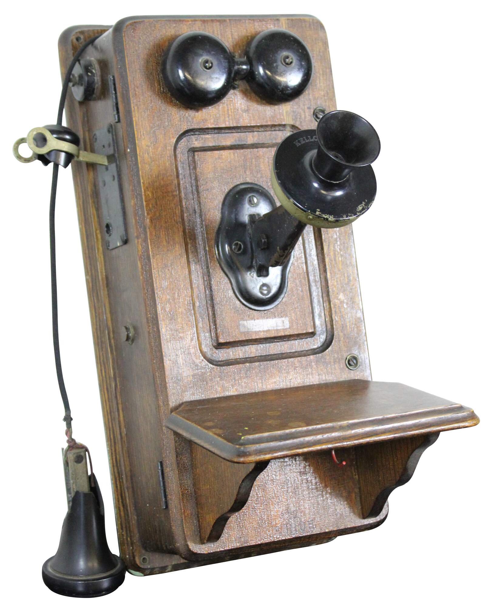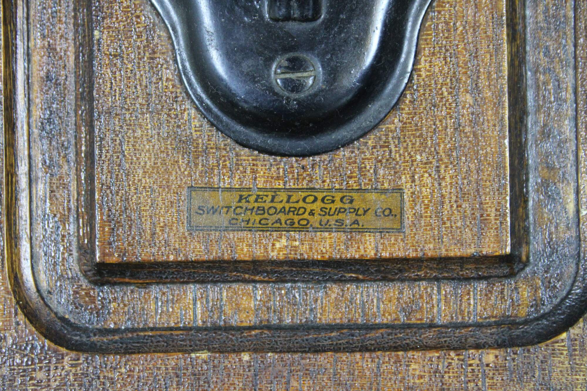 Antique early 1900s quartersawn tiger oak wall mounted telephone by the Kellogg Switchboard and Supply Company.