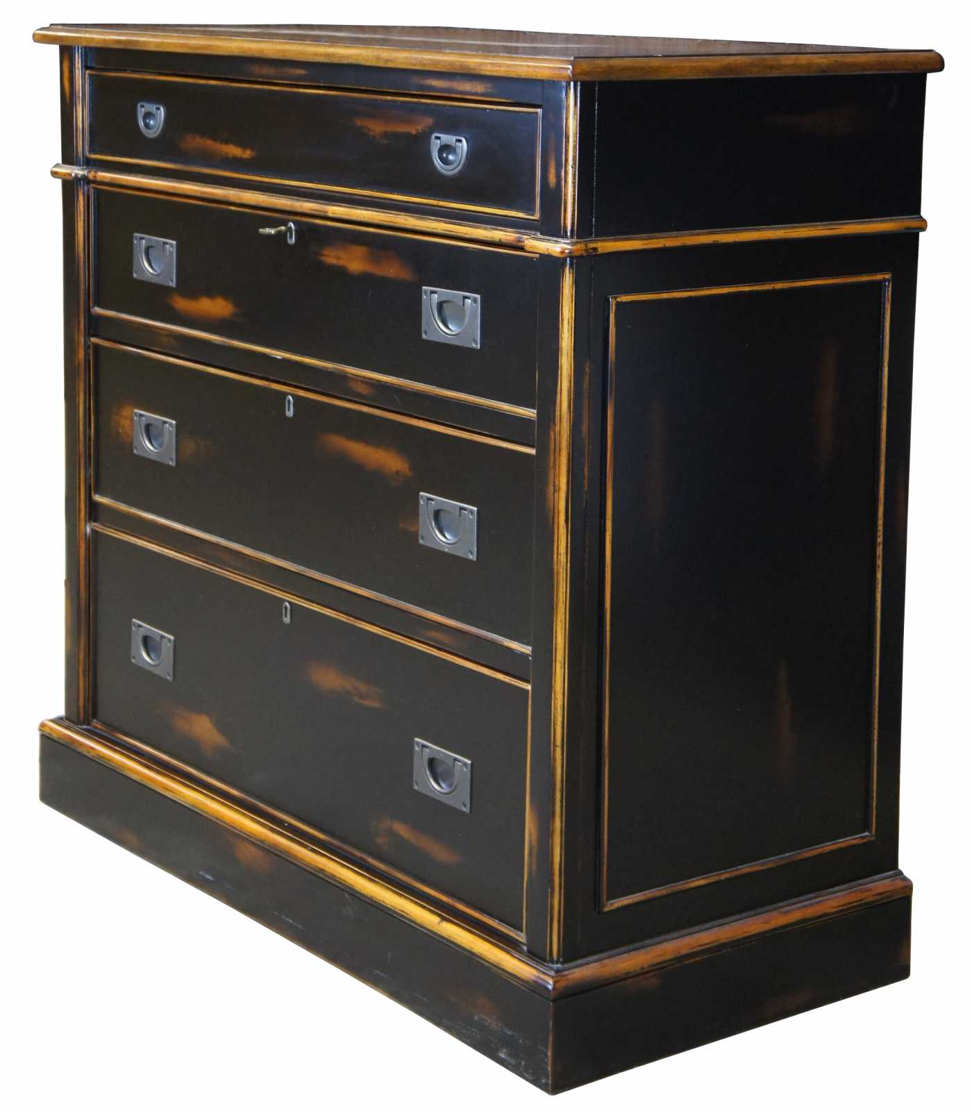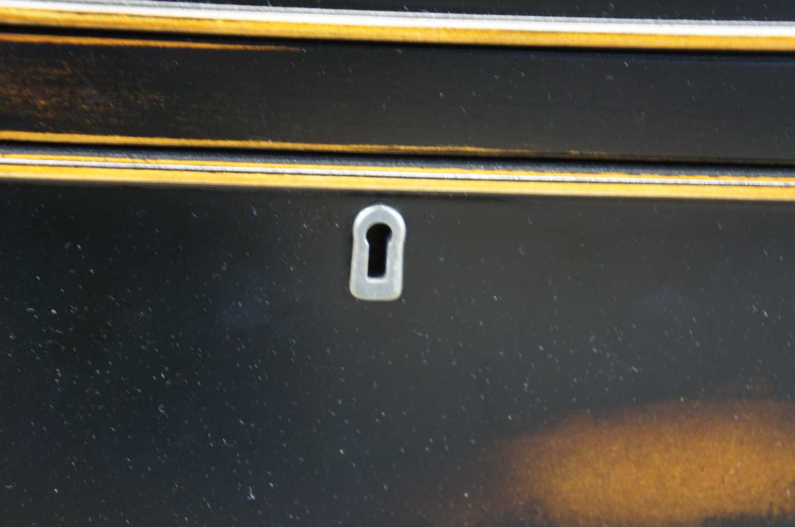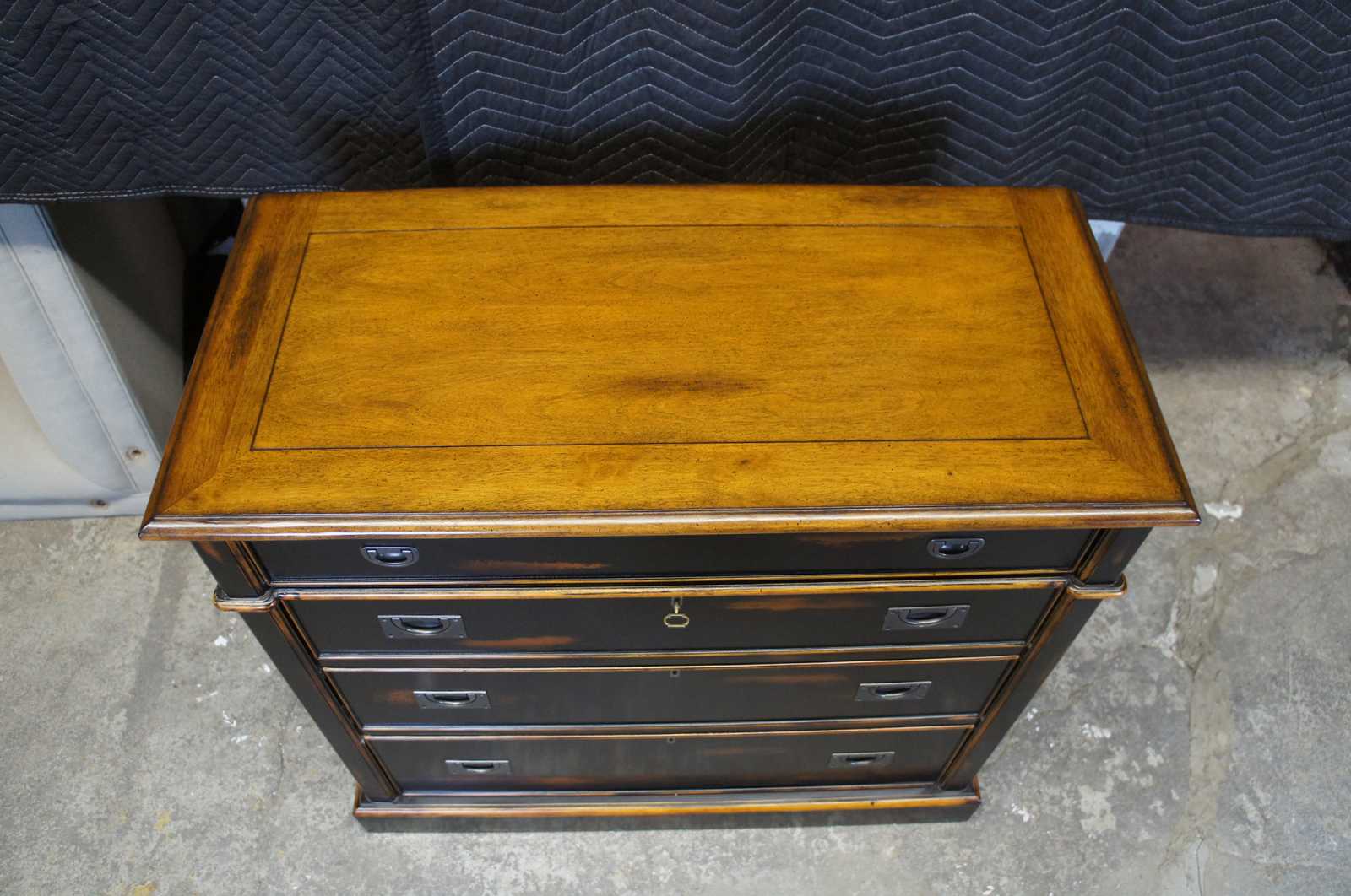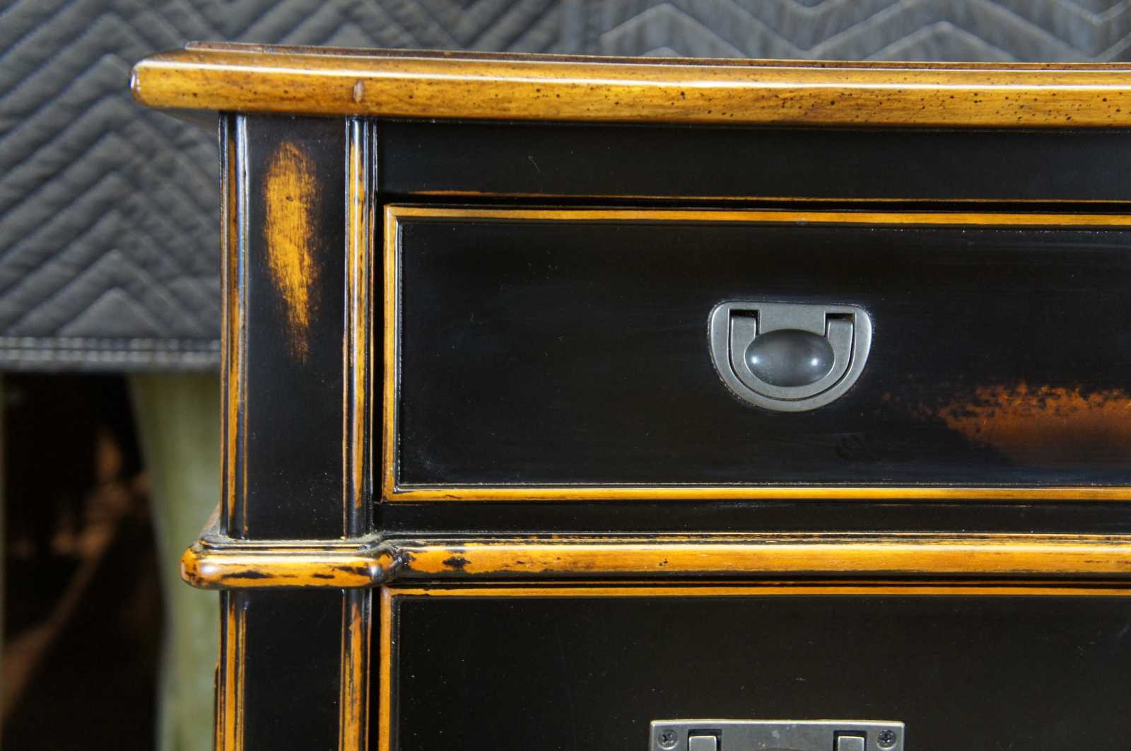 A naturally distressed dresser by Accents & Beyond. Made from birch and finished in black with a rubbed finish. Features trimmed side panneling, locks and a key. Made in North Carolina.