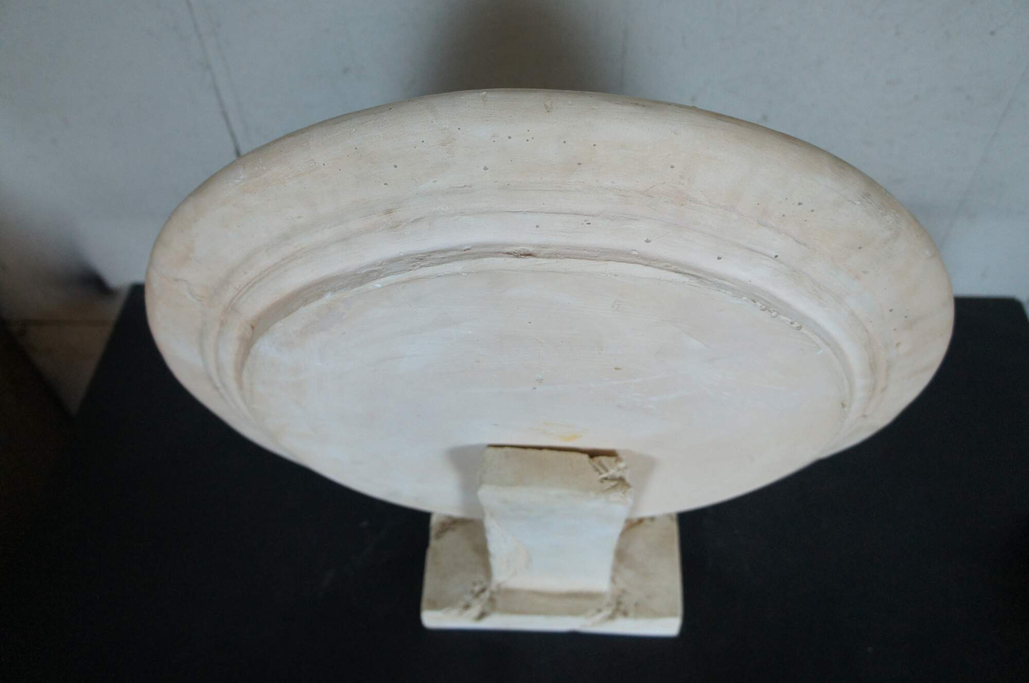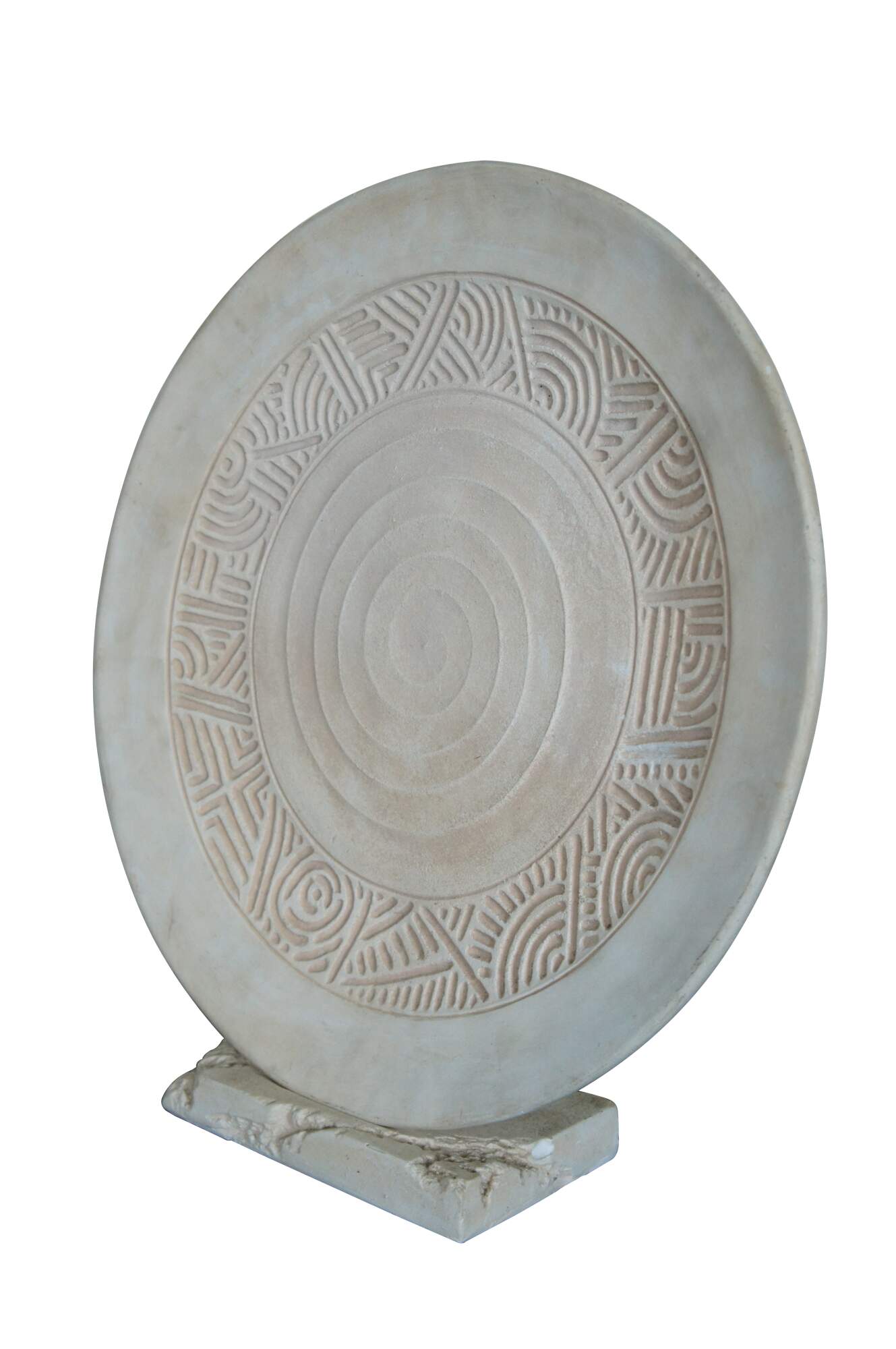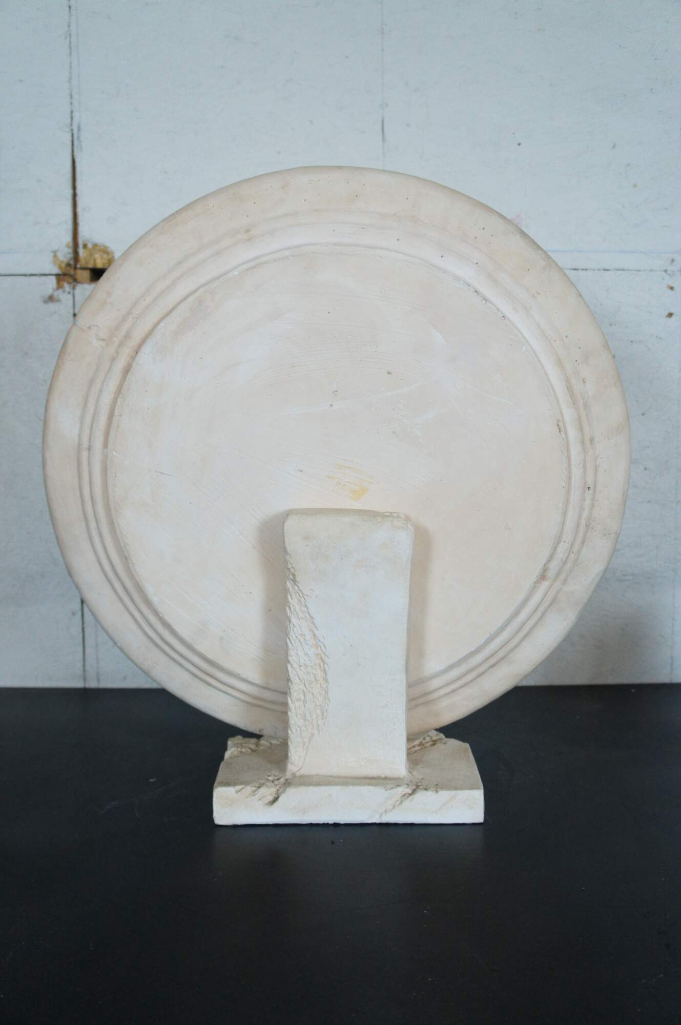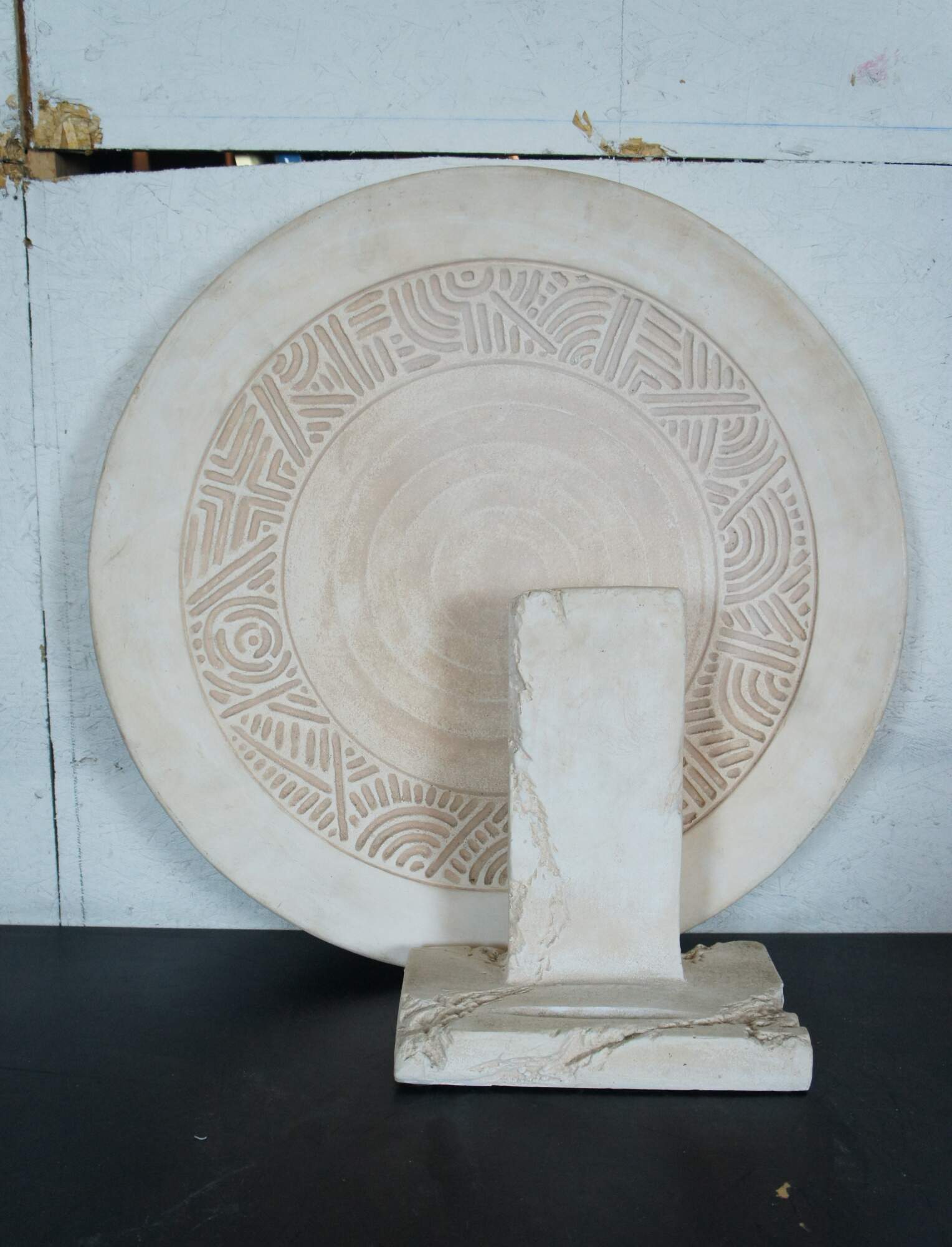 Vintage chalkware art sculpture display featuring a plate / charger / round disk with geometric patterns. Includes base / stand.