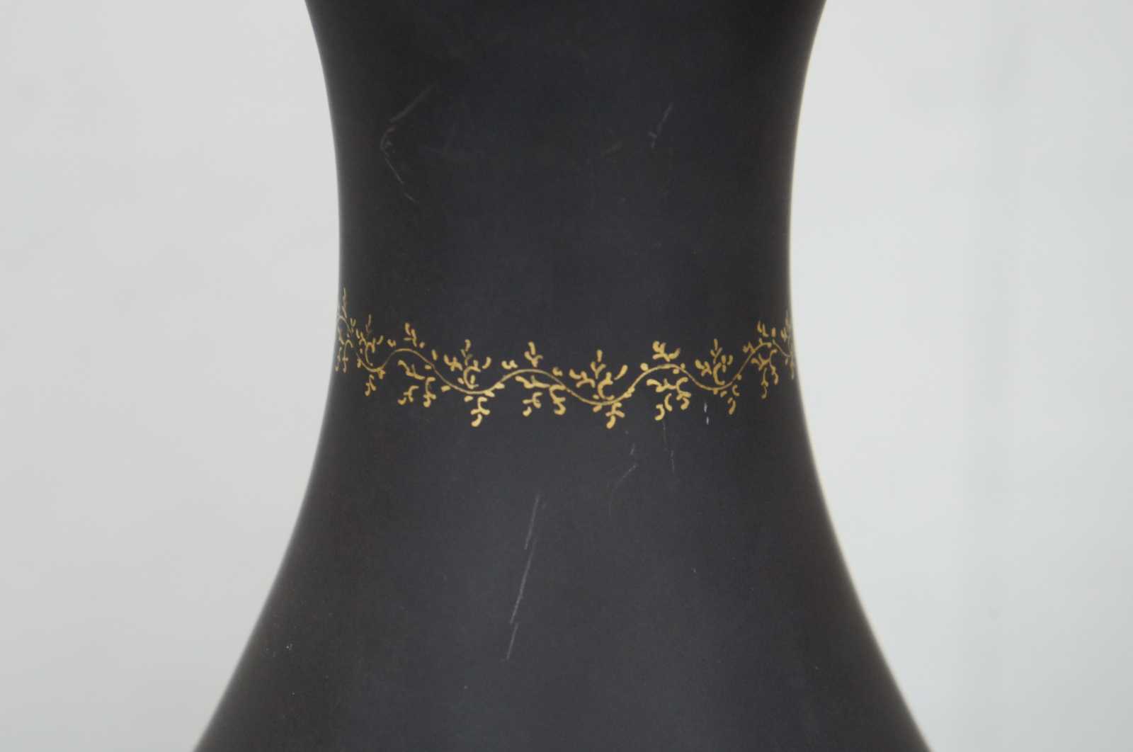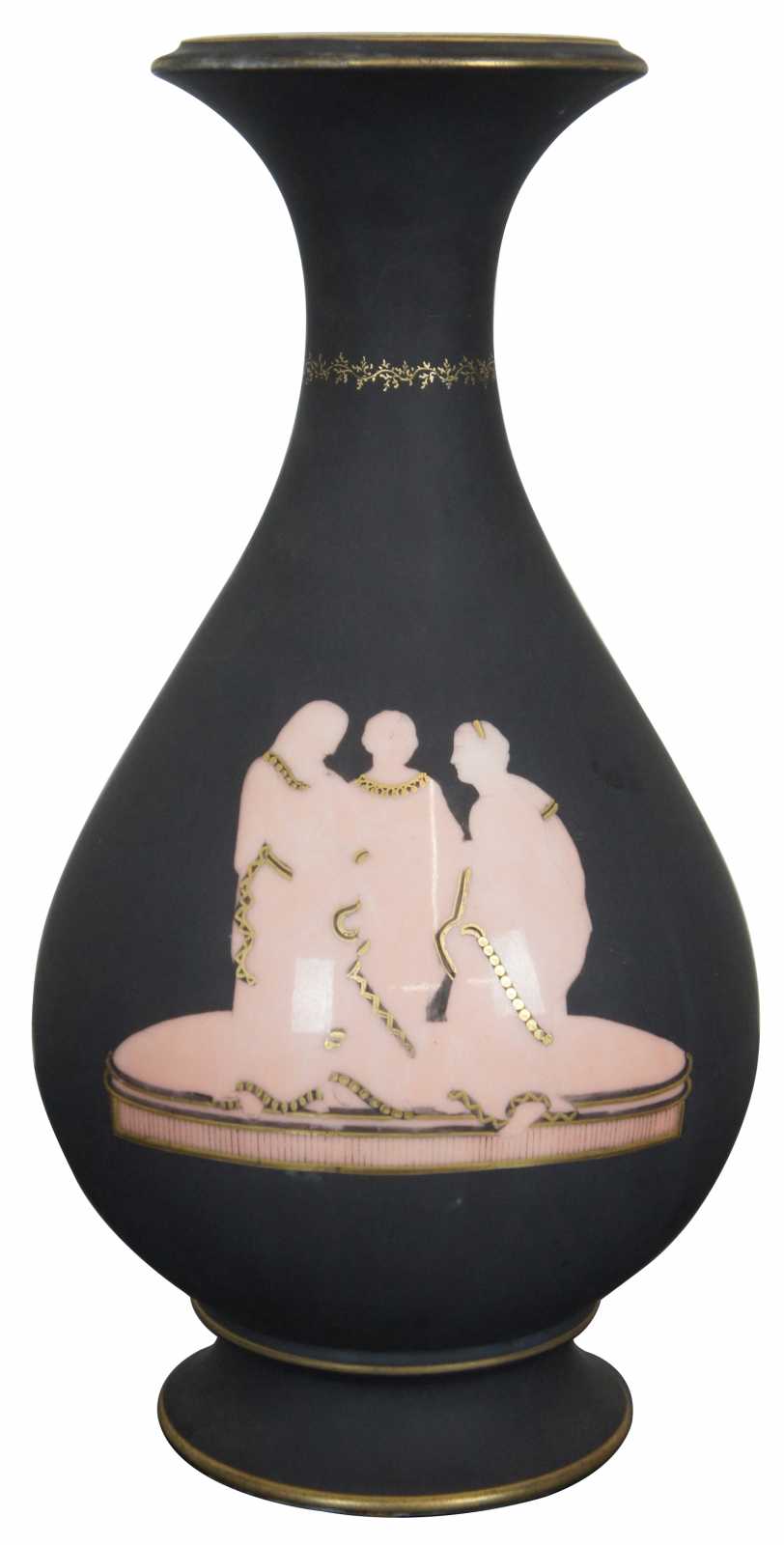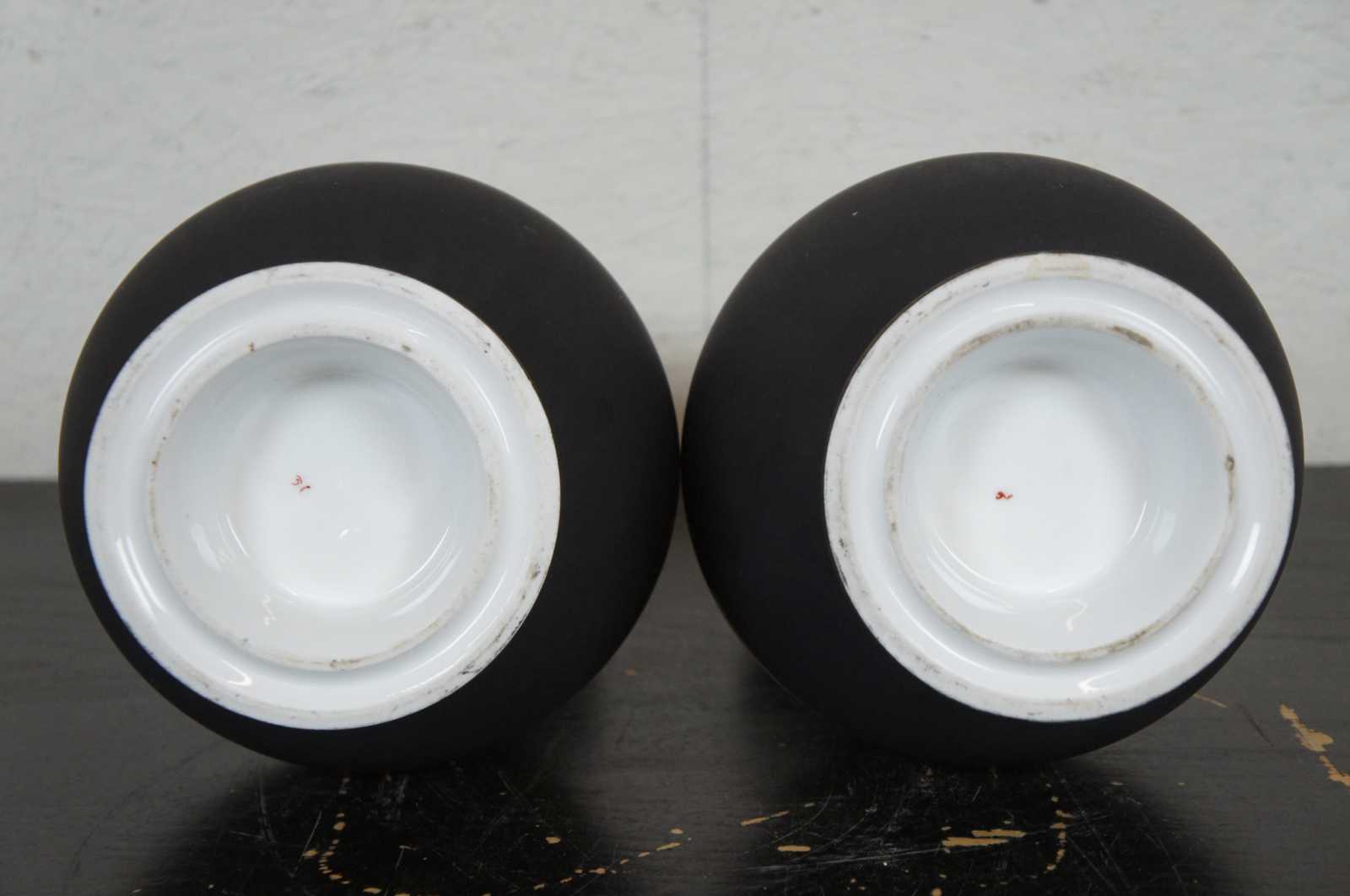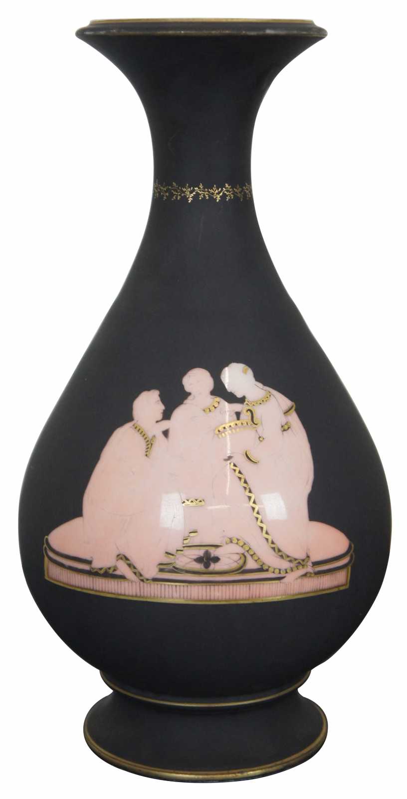 Two antique black satin finished mantel vases. Each features a Grecian shell inlaid scene along the front, trimmed in gold.