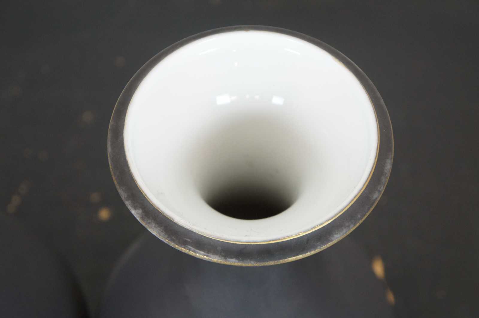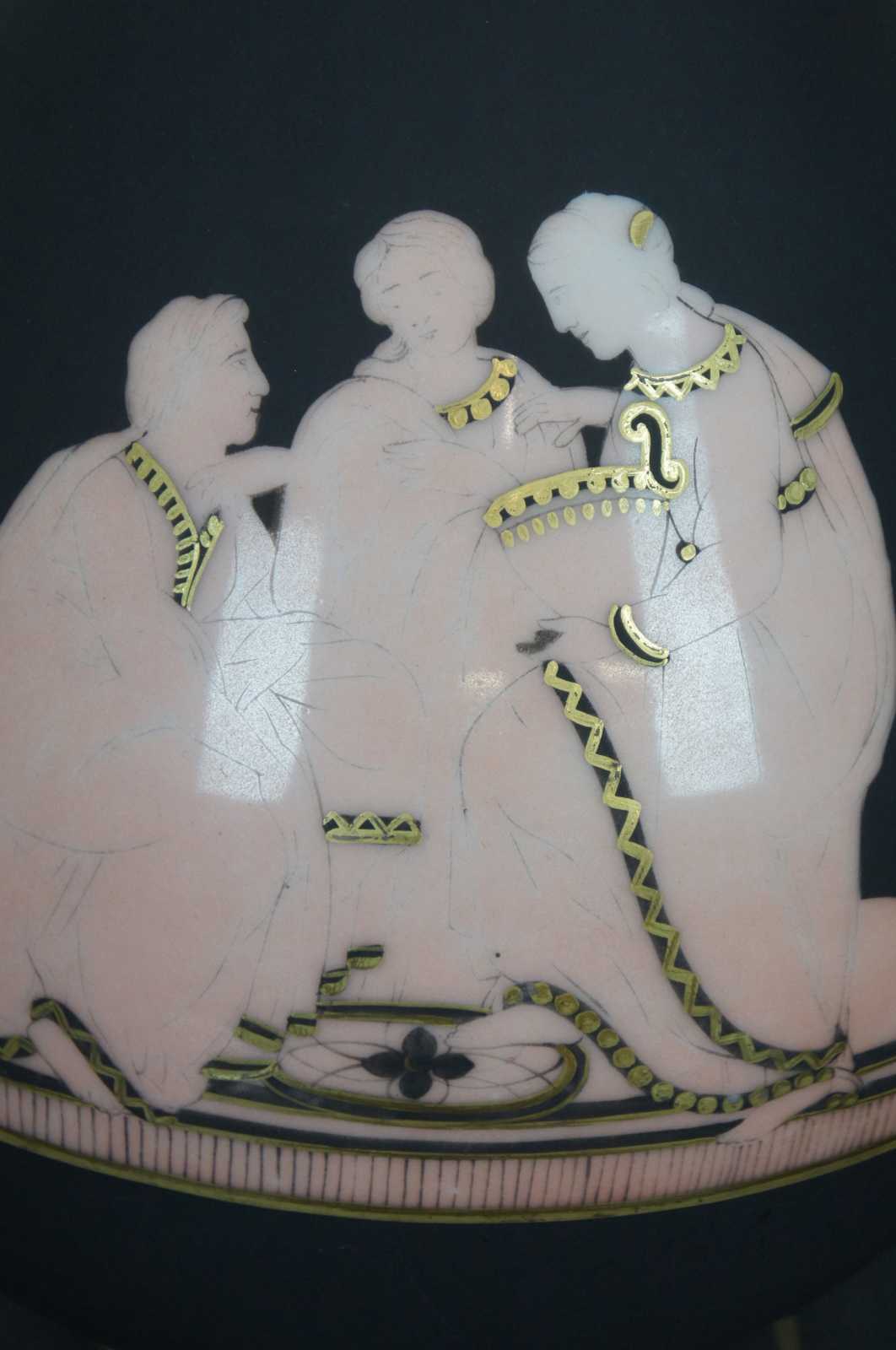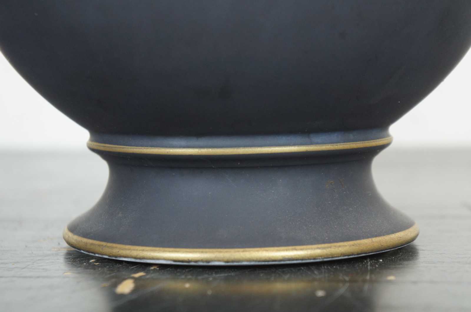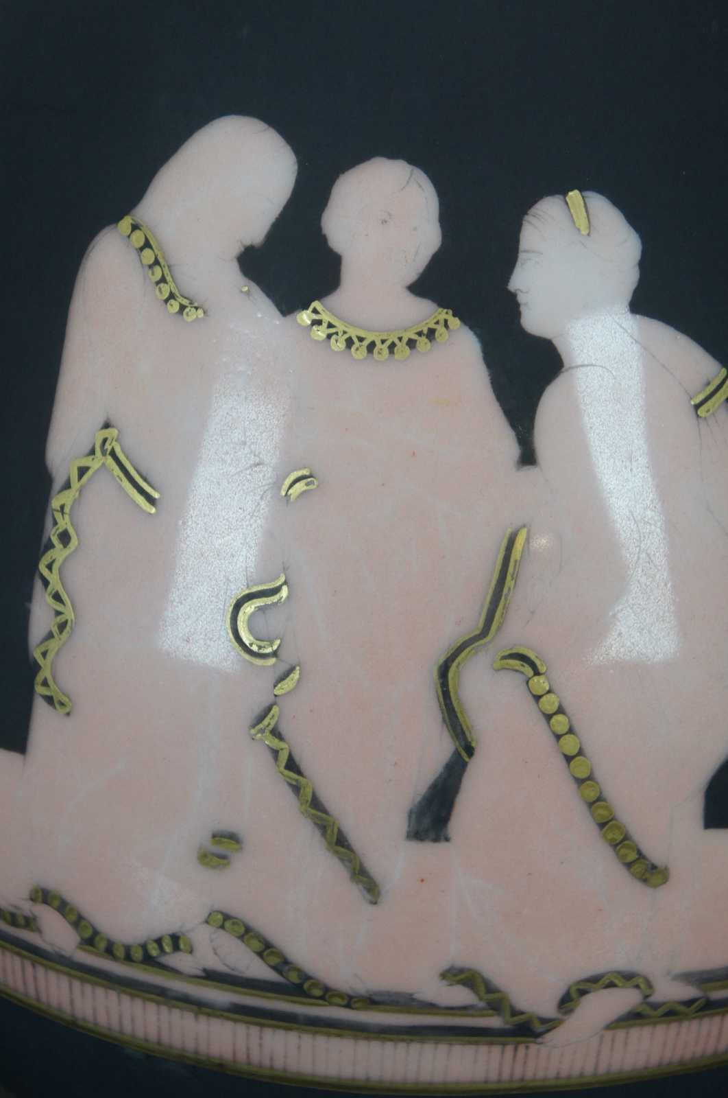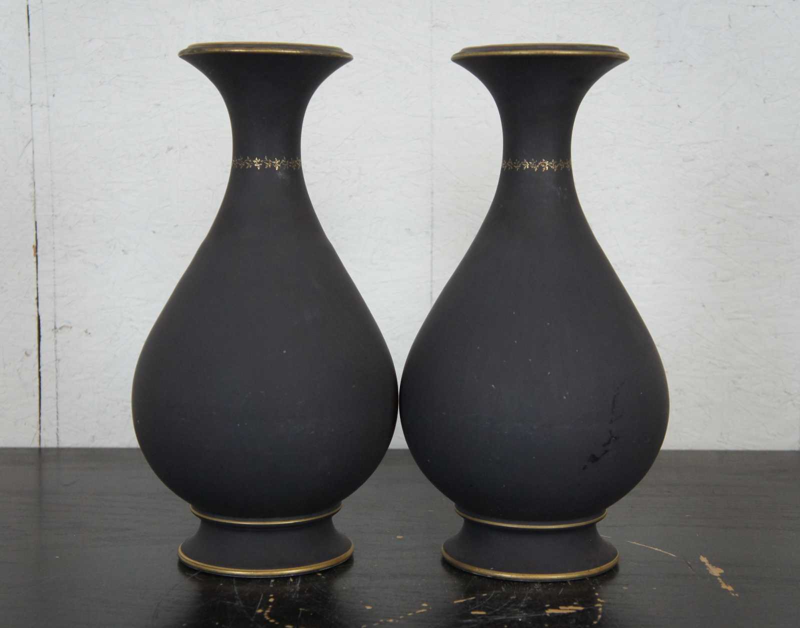 Two antique black satin finished mantel vases. Each features a Grecian shell inlaid scene along the front, trimmed in gold.