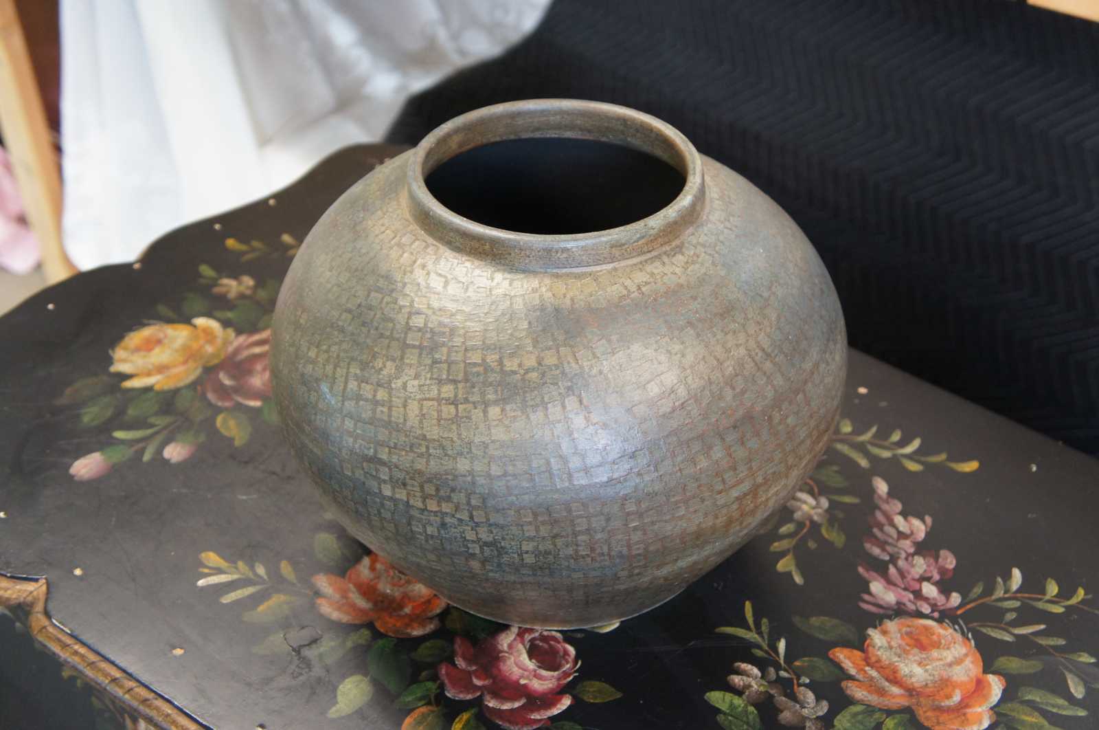 Maitland Smith green ceramic vase. Raku style with a squatty form and unique square imprint pattern.