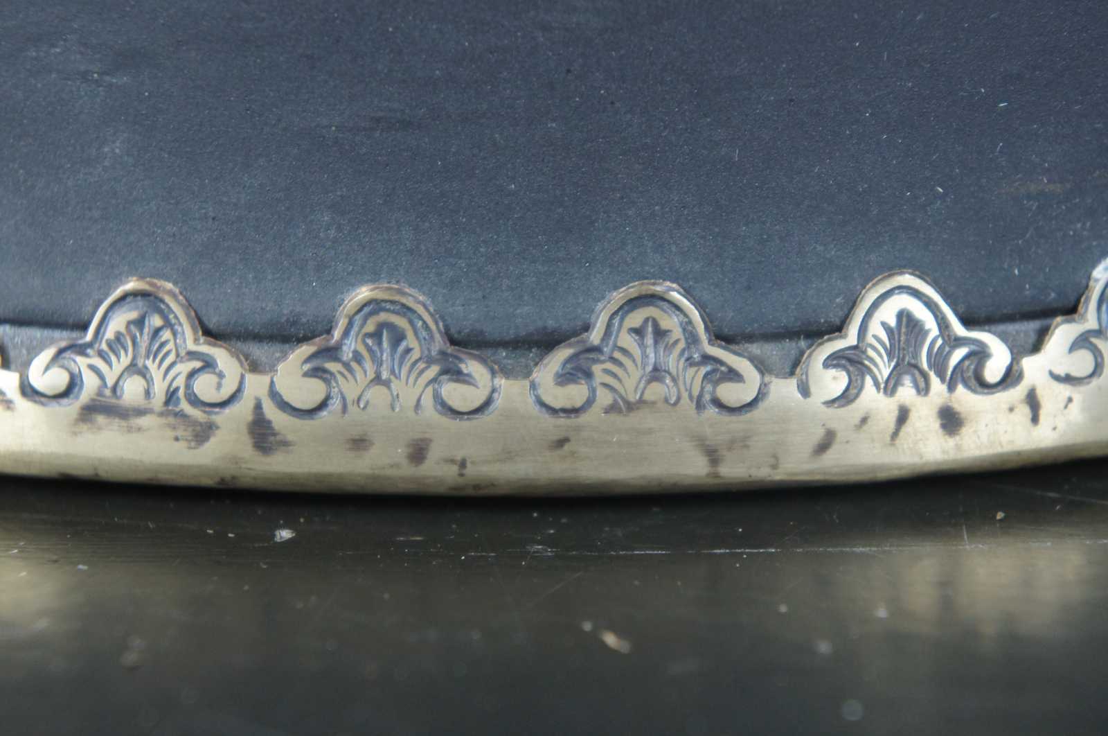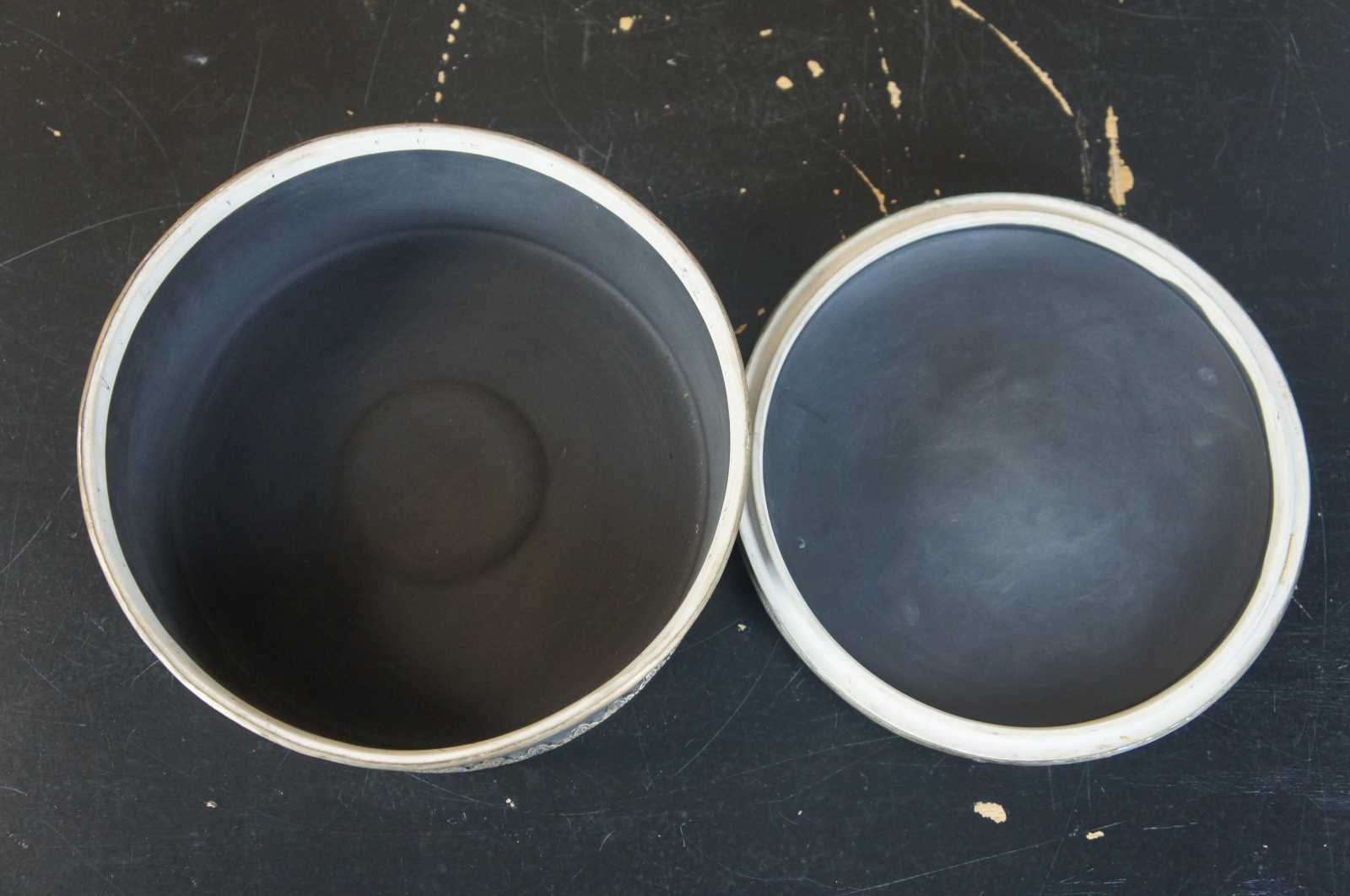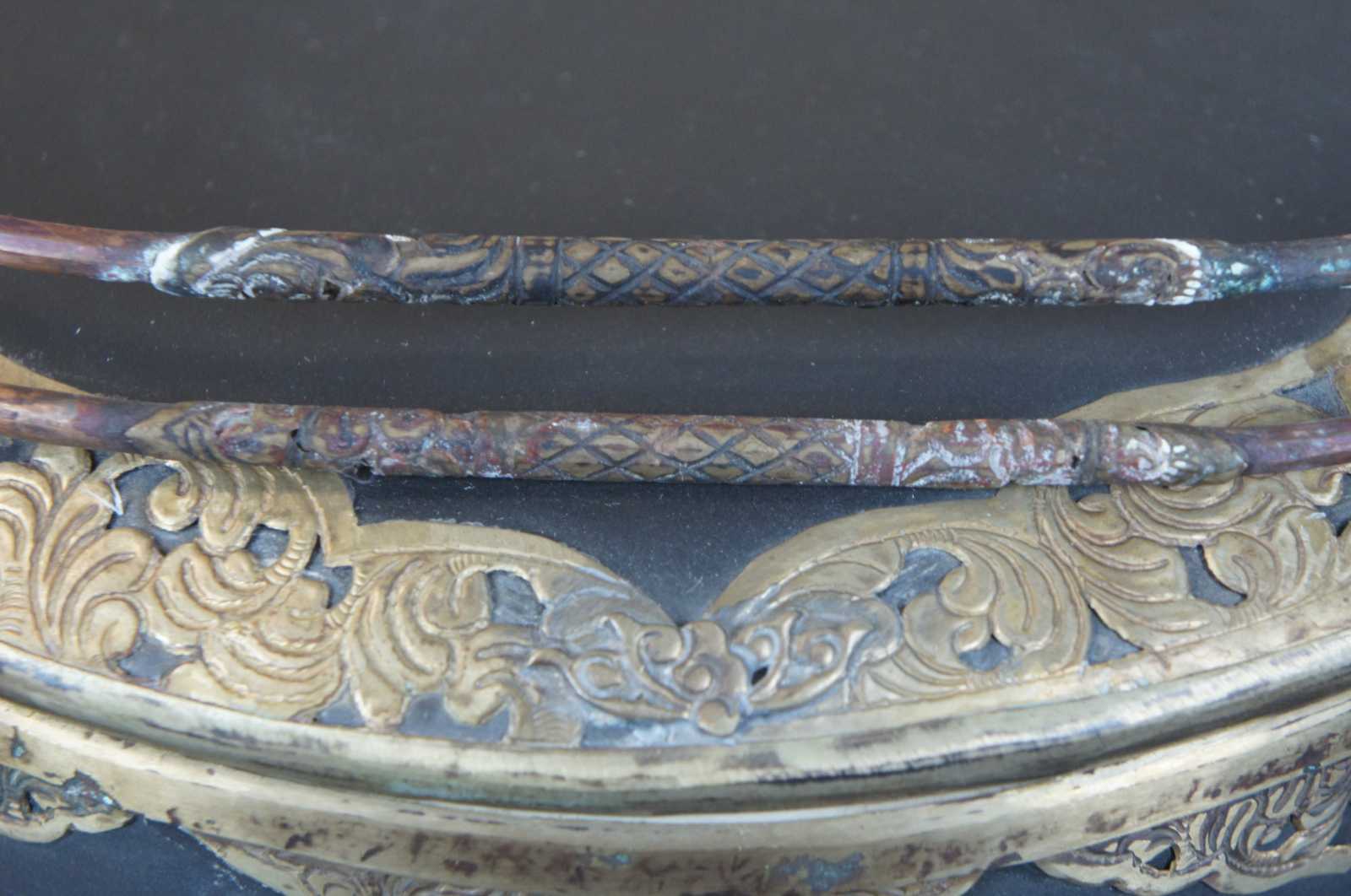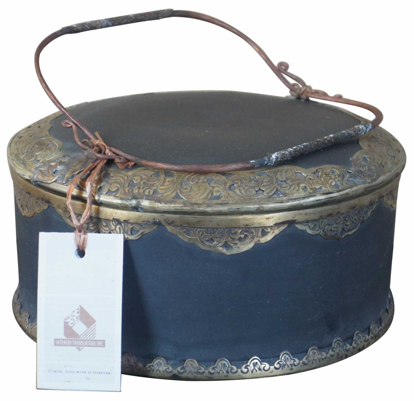 John-Richard Collection chinoiserie trinket box or dish. Made from porcelain with lid and copper handles. Features brass overlay along the base and lid. Figural bat can be seen near the handles.