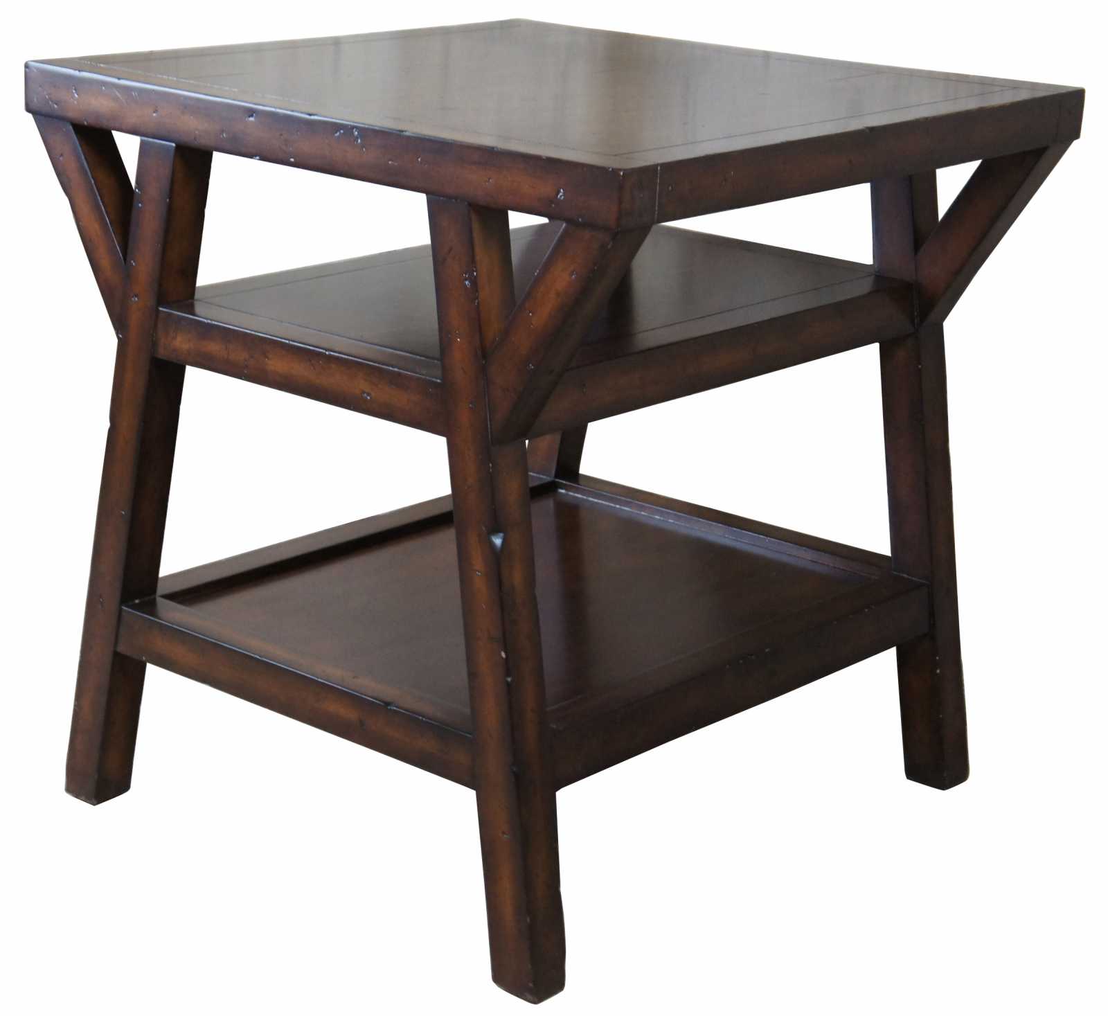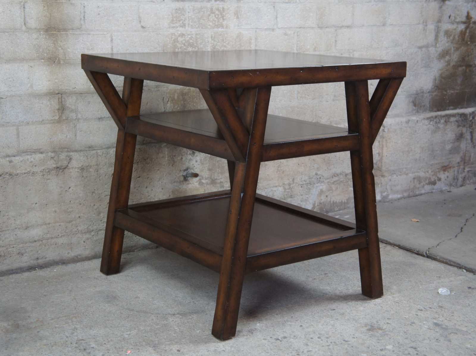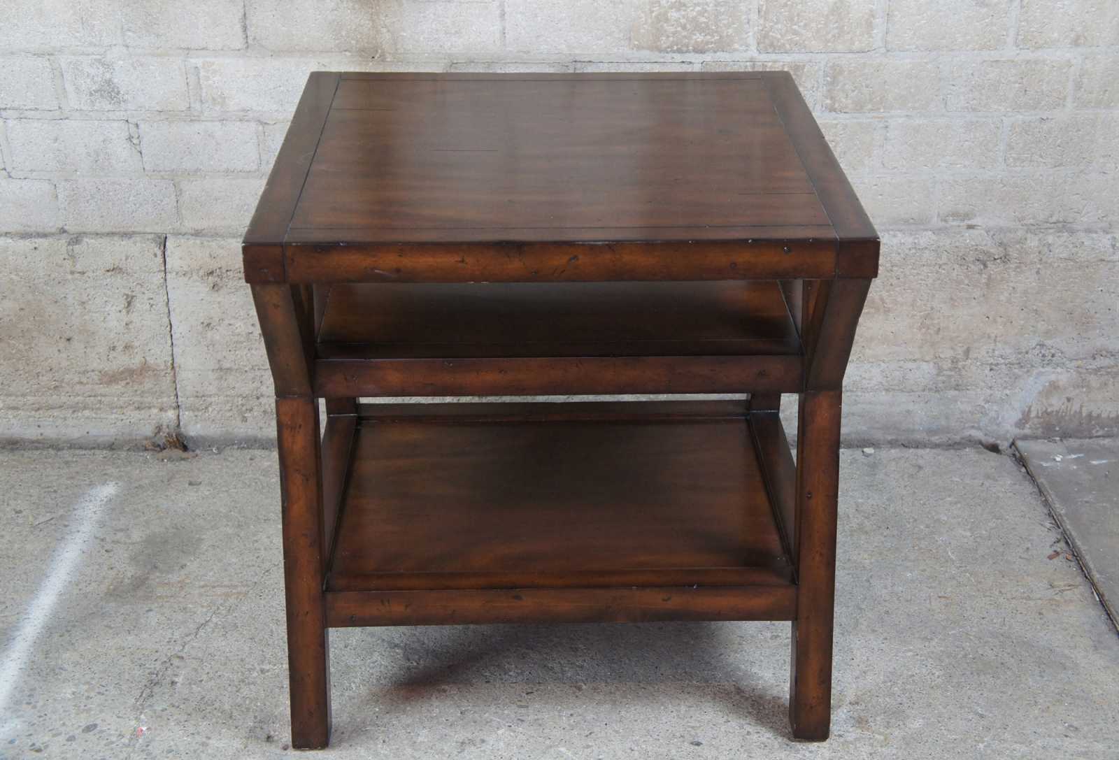 Square tiered side table by Lauren Ralph Lauren. Made from mahogany with a naturally distressed finish. Features a three tiered design with paneled top and inset lower shelf.