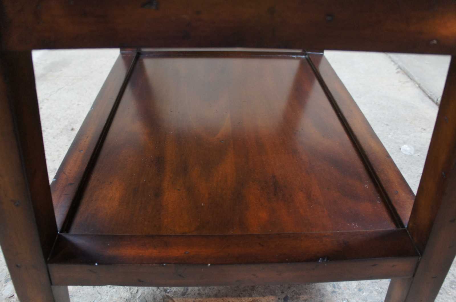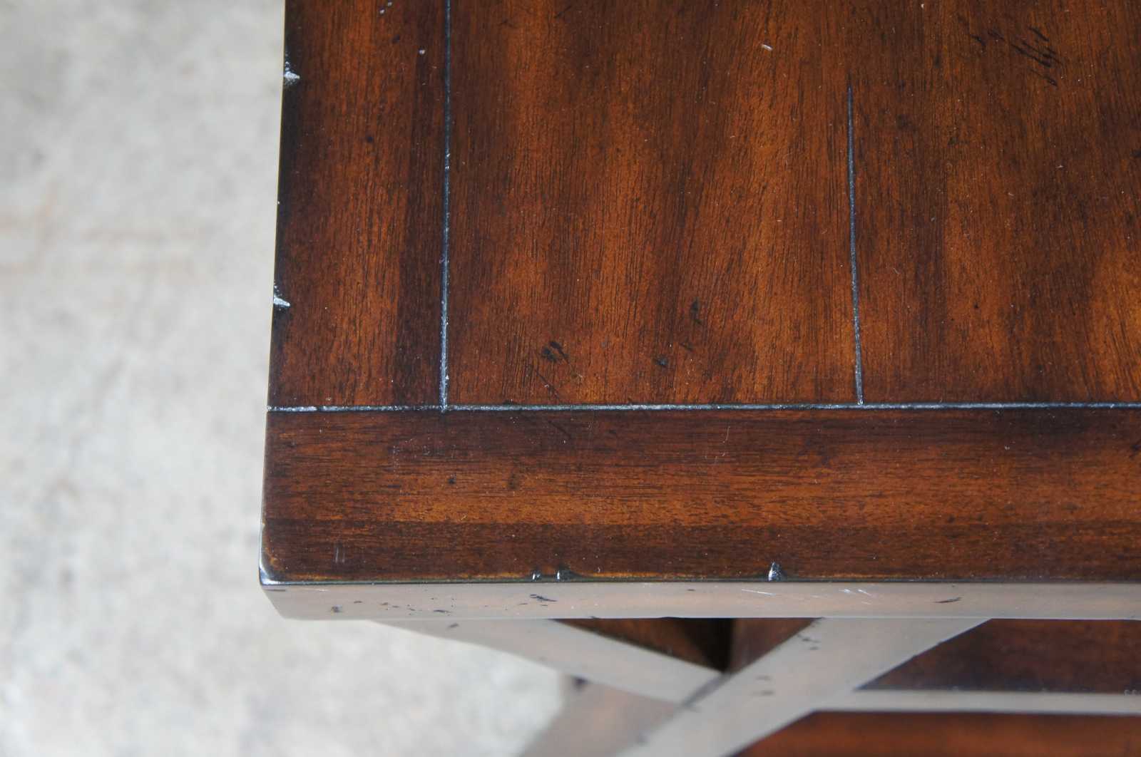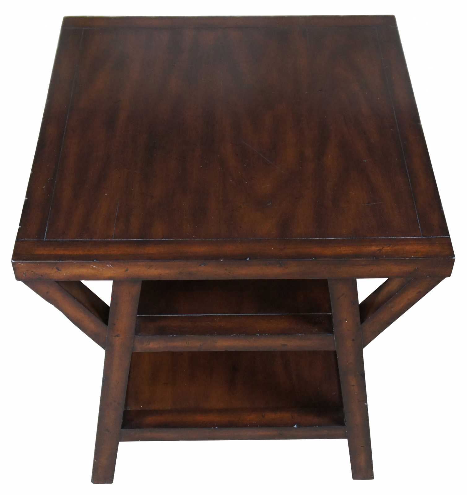 Square tiered side table by Lauren Ralph Lauren. Made from mahogany with a naturally distressed finish. Features a three tiered design with paneled top and inset lower shelf.