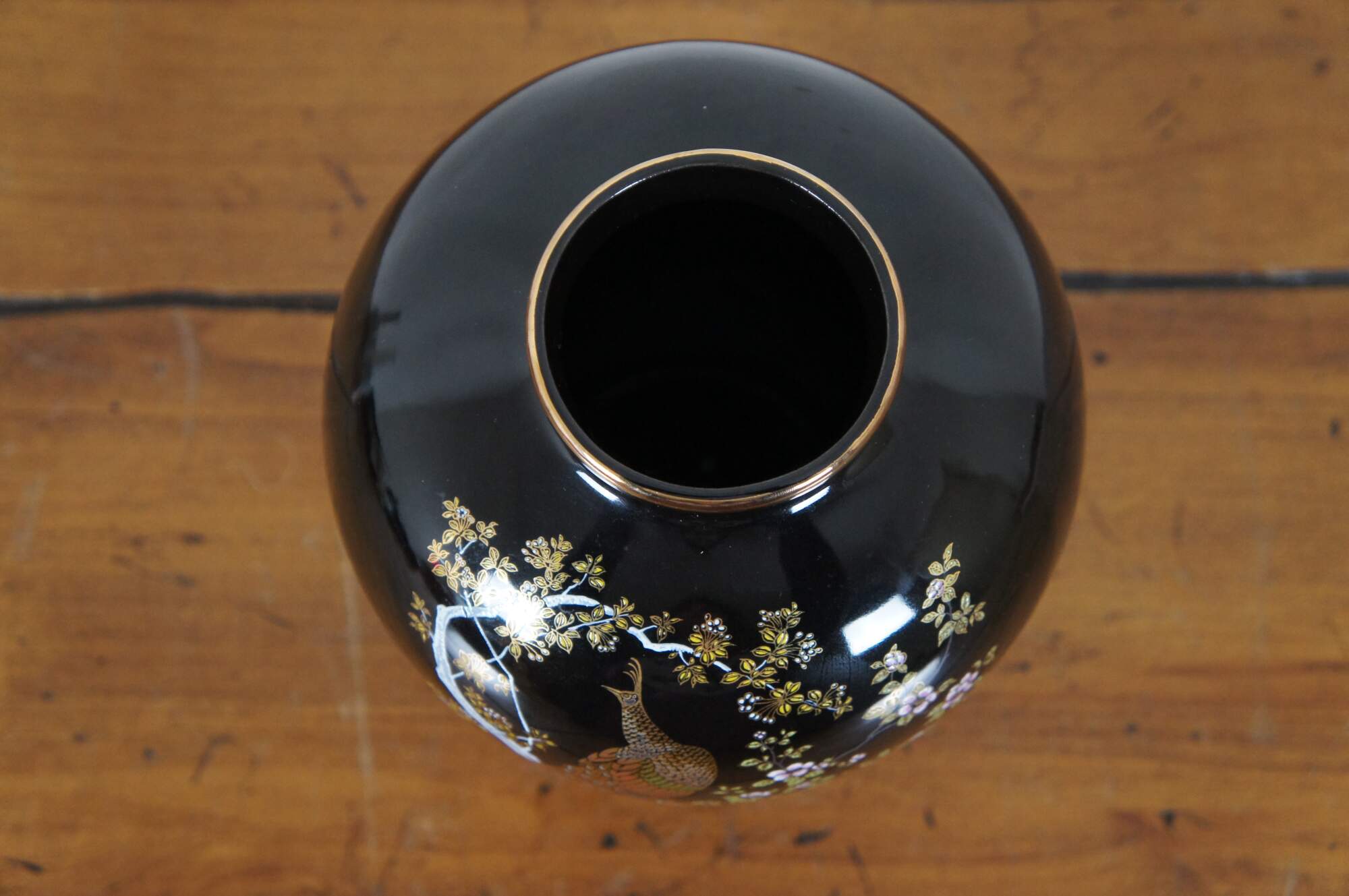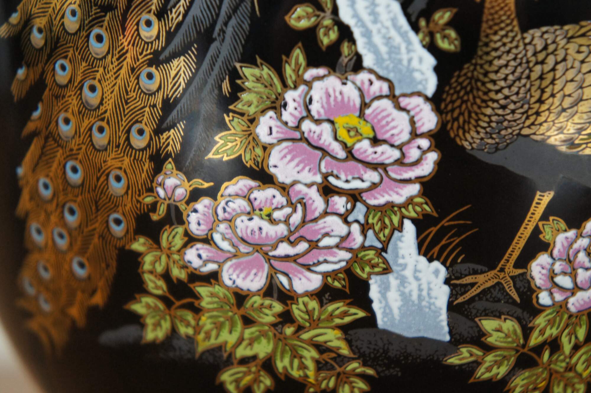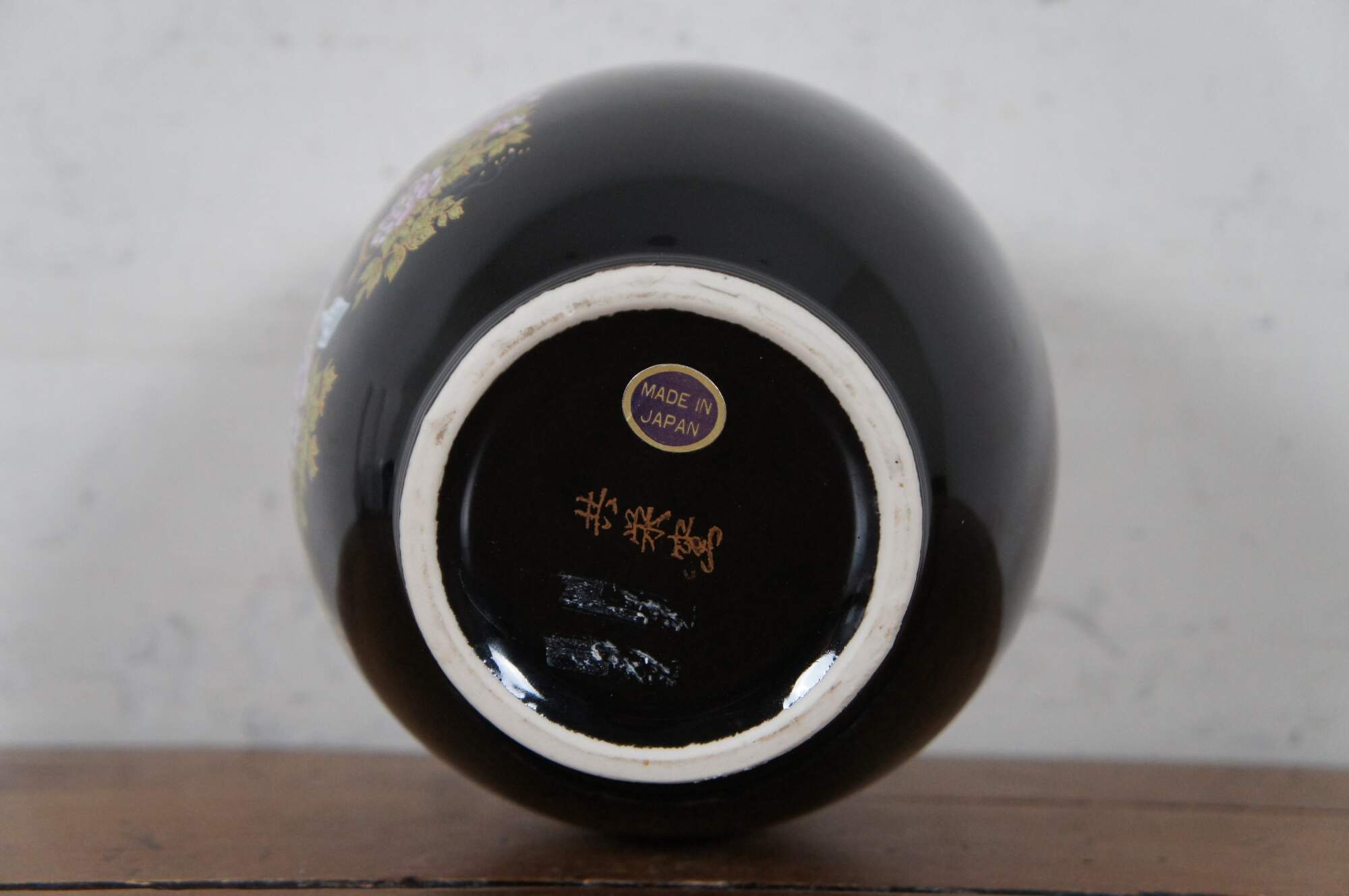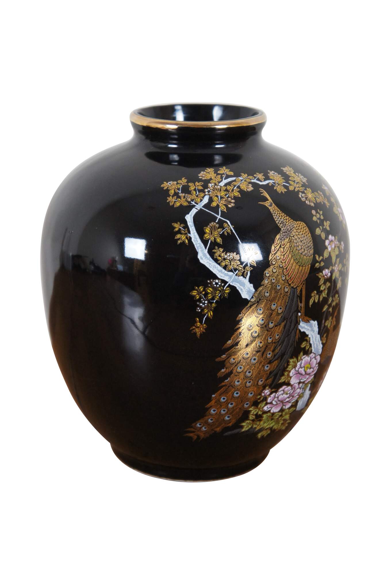 Vintage black porcelain Satsuma vase or urn featuring peacocks and cherry blossom trees. Made in Japan.