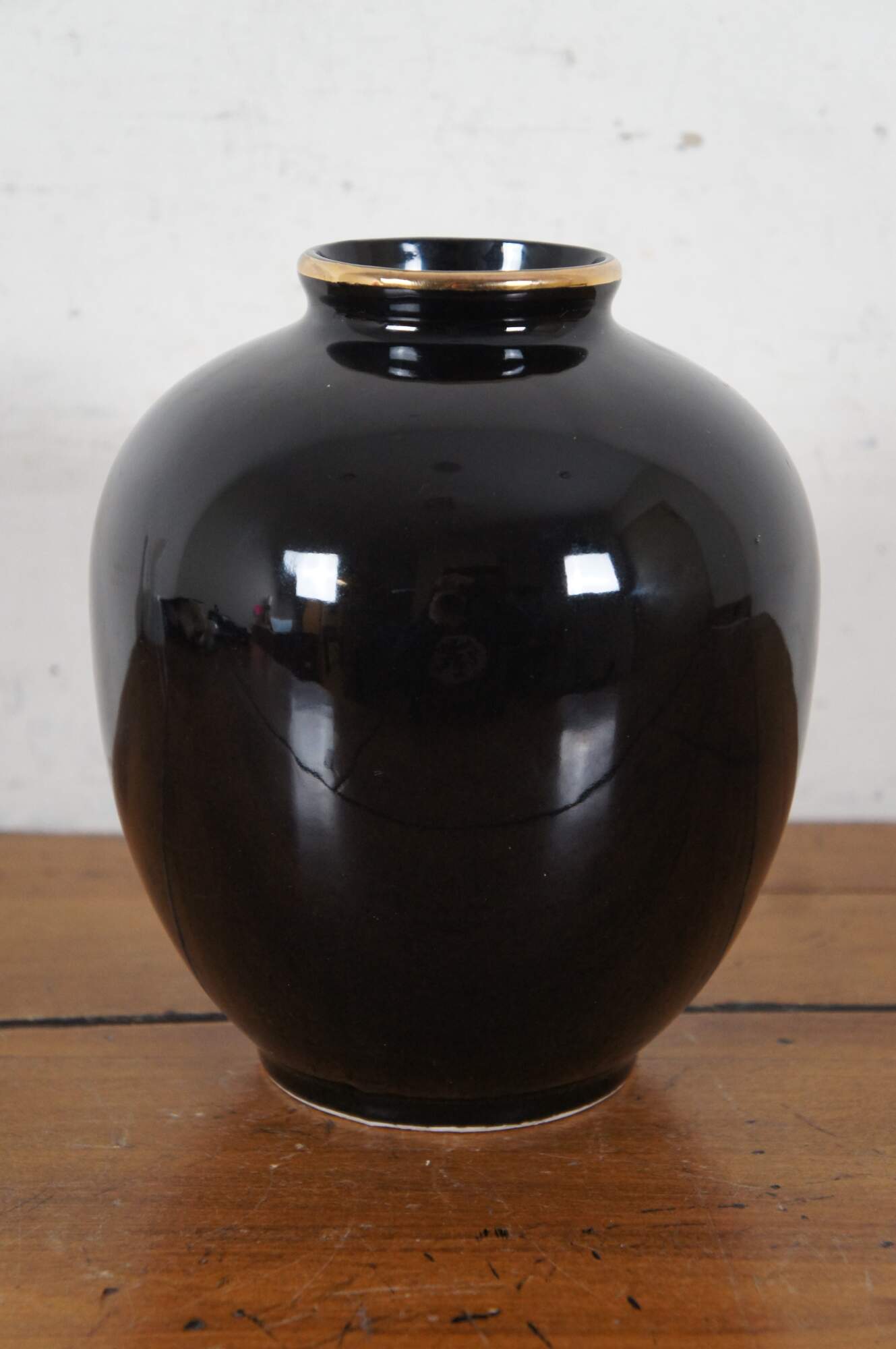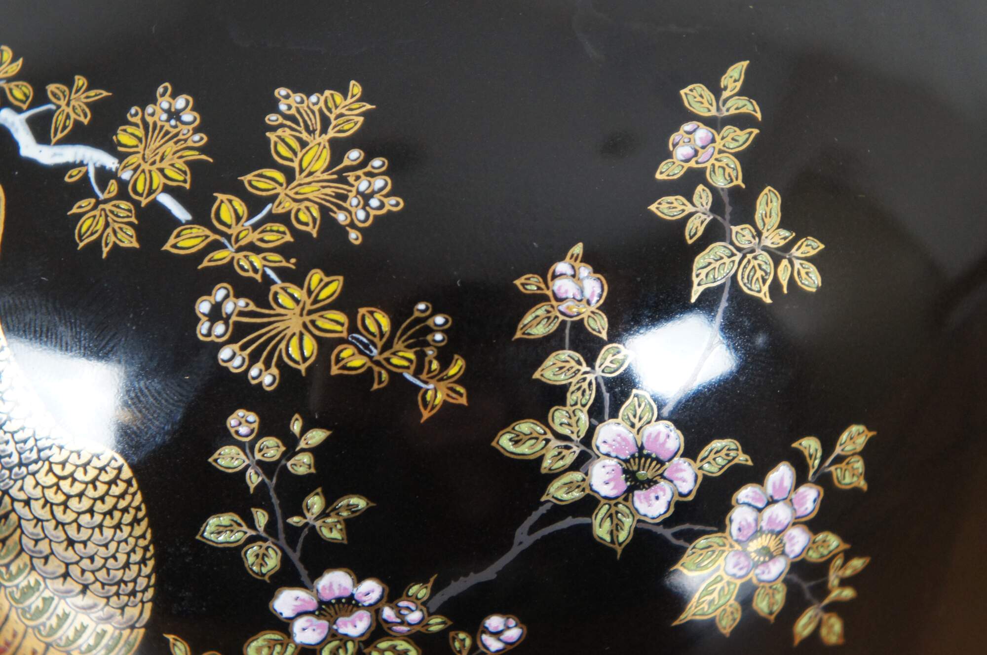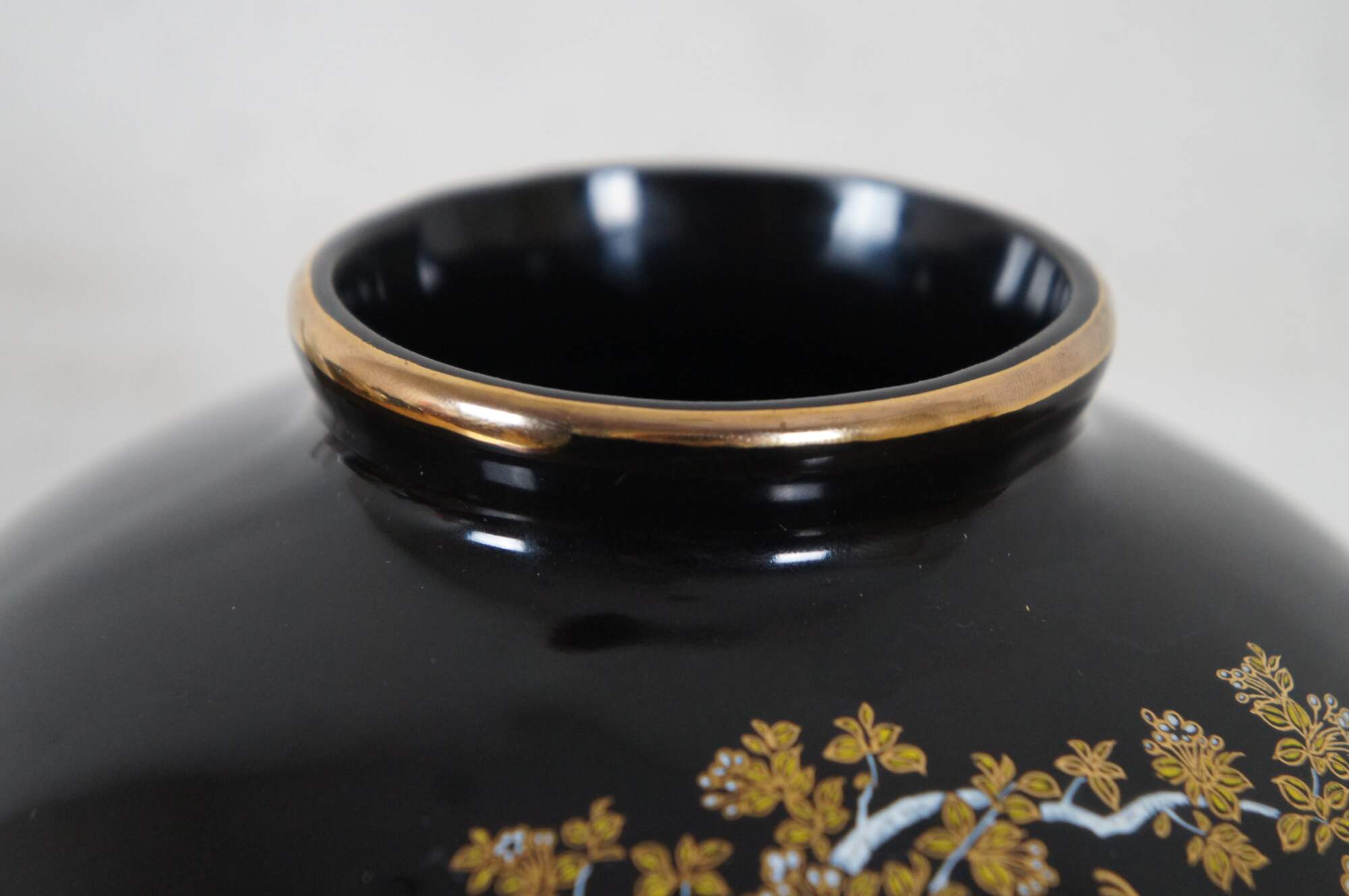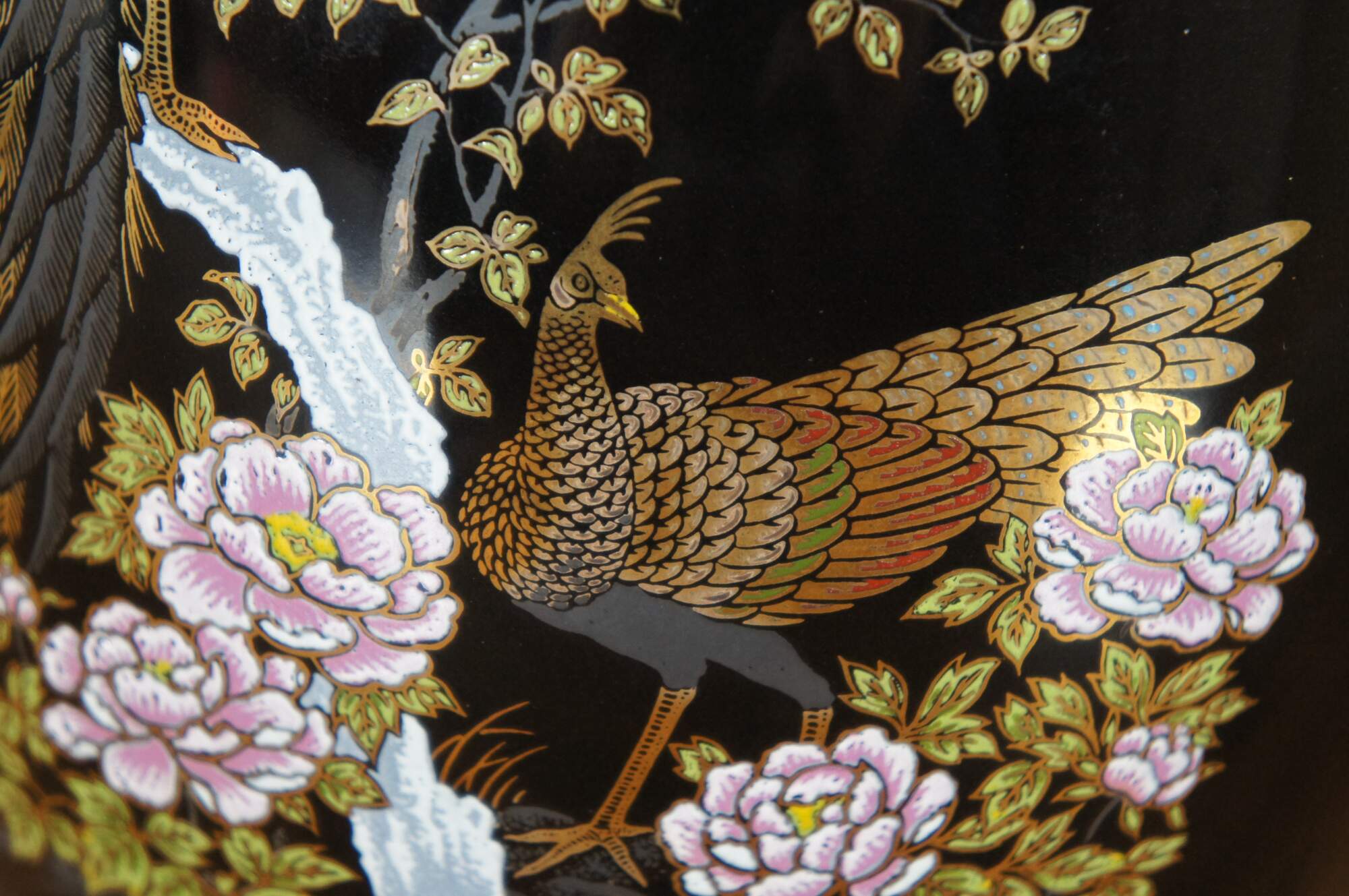 Vintage black porcelain Satsuma vase or urn featuring peacocks and cherry blossom trees. Made in Japan.