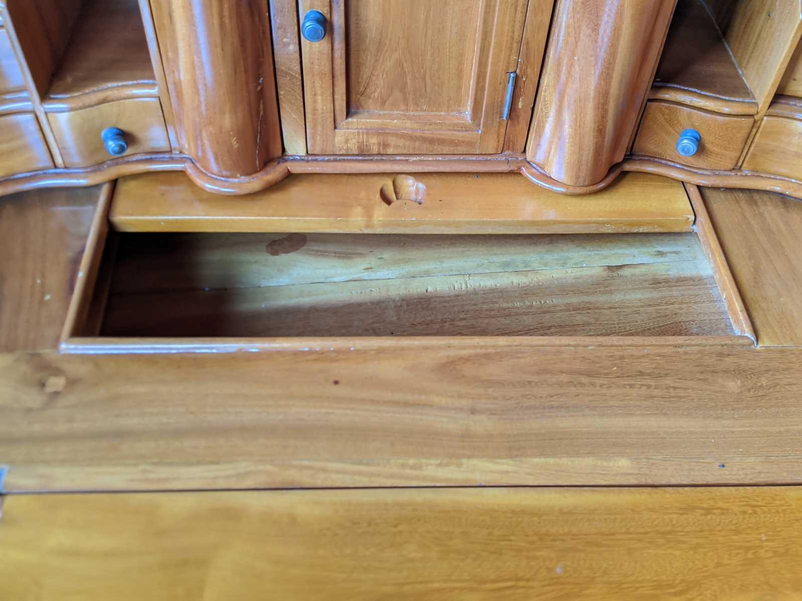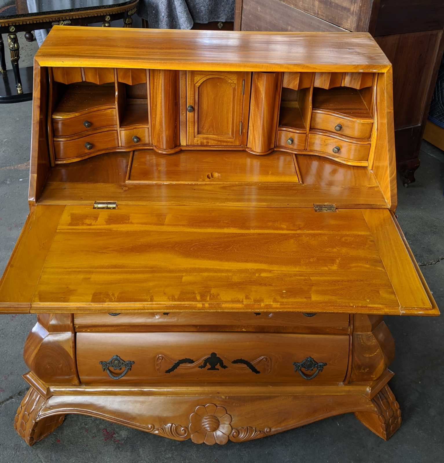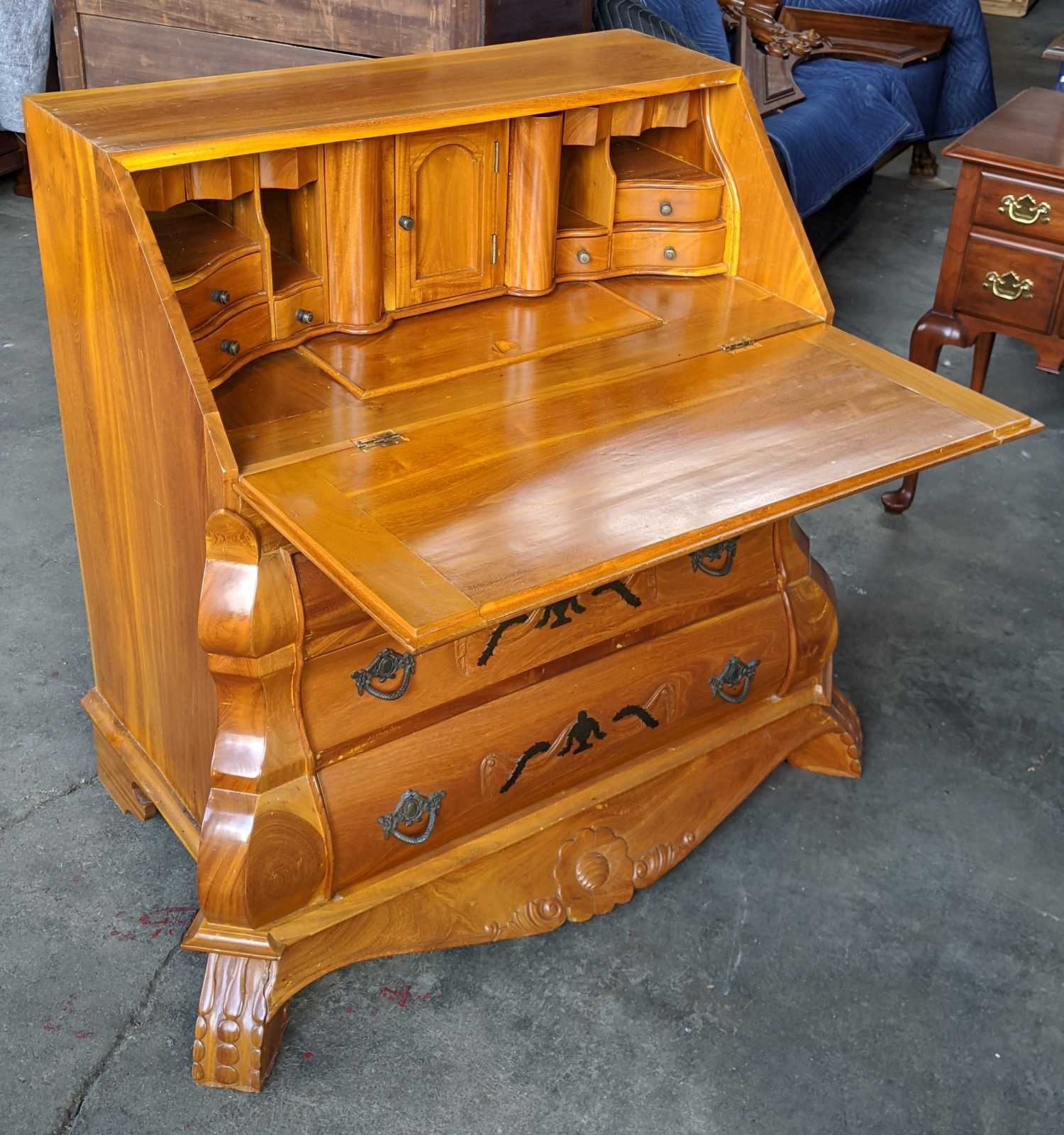 A magnificent secretary desk. Made from birch with intricately carved desk. This piece has a wonderful shine to it, grabbing attention in any room. On the inside there are some unique sliding compartments and hidden stash spots.