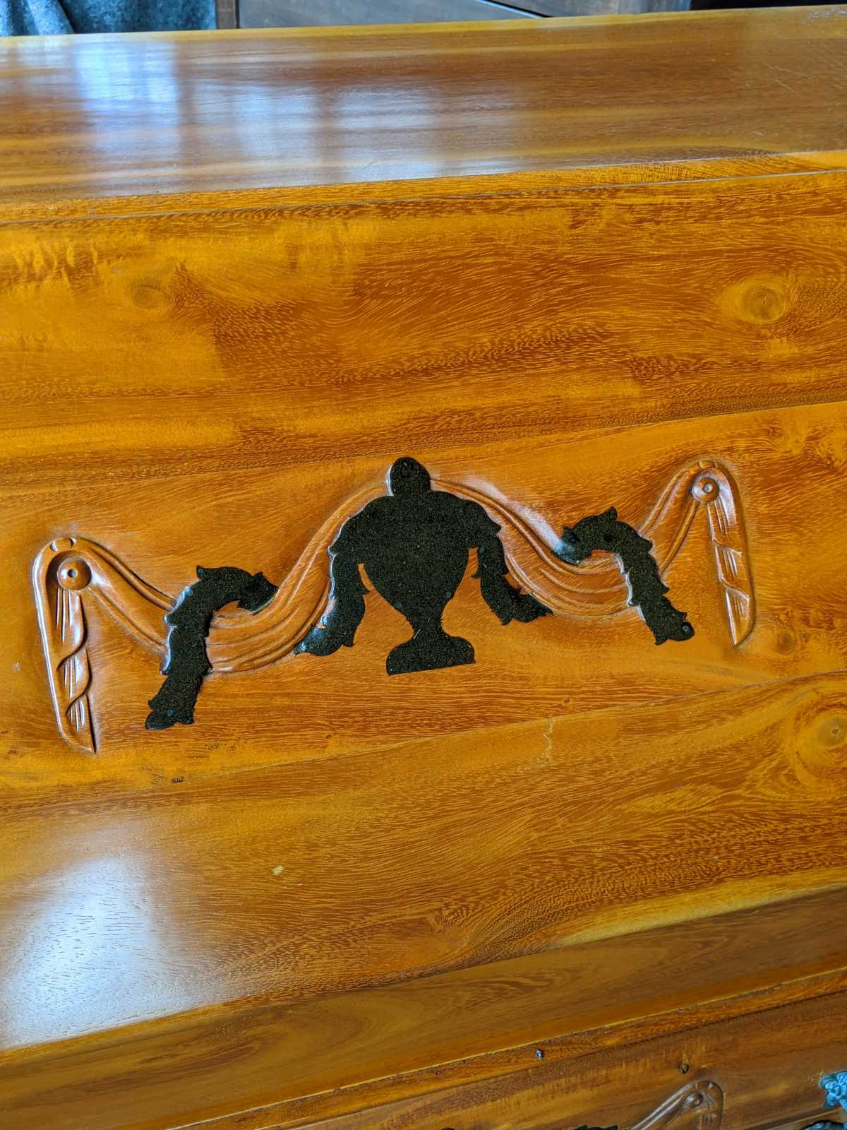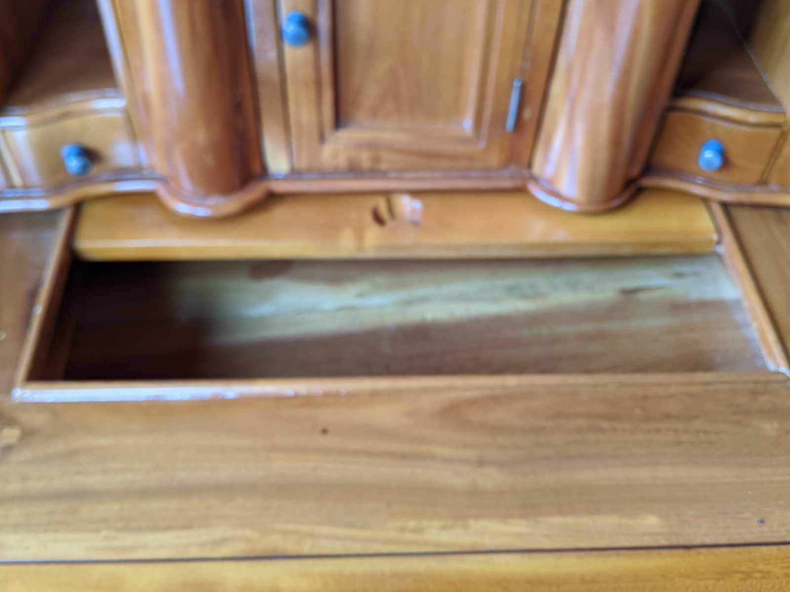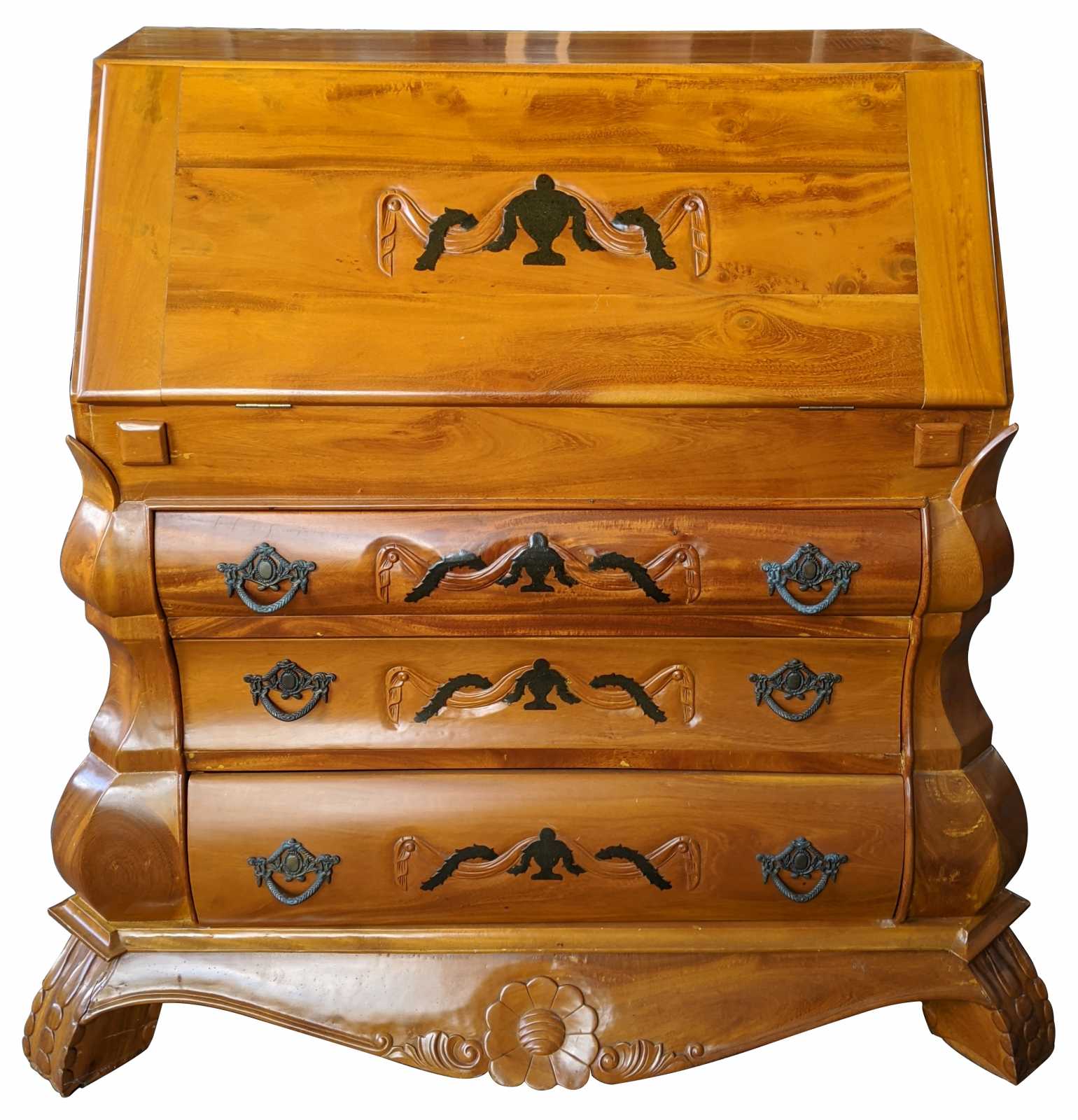 A magnificent secretary desk. Made from birch with intricately carved desk. This piece has a wonderful shine to it, grabbing attention in any room. On the inside there are some unique sliding compartments and hidden stash spots.