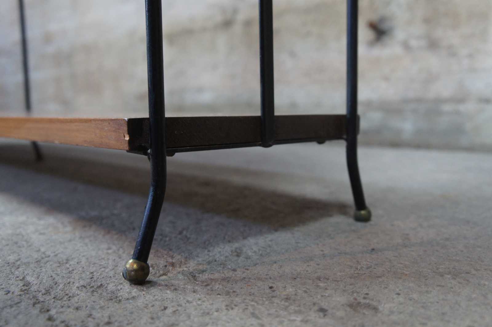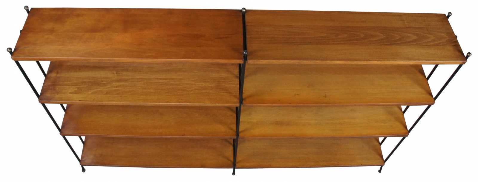 Vintage iron and walnut bookcase or library shelf. Features four tiers and eight shelves, a iron frame with walnut slab shelves.