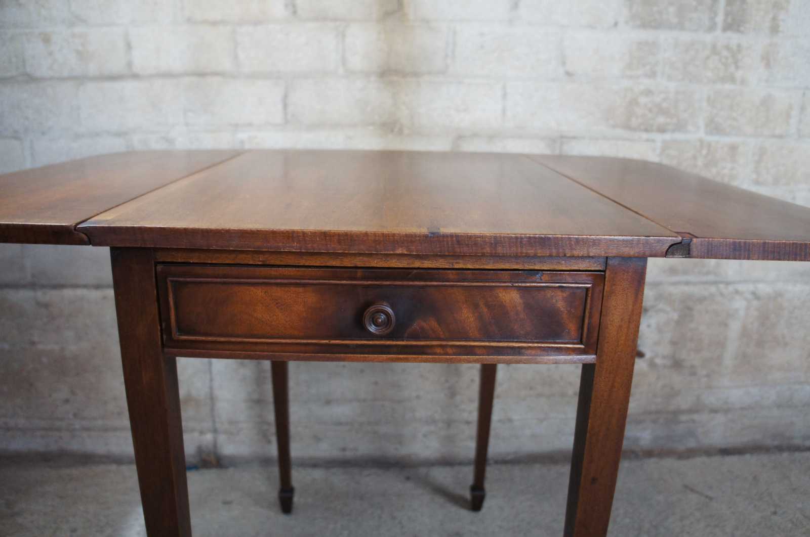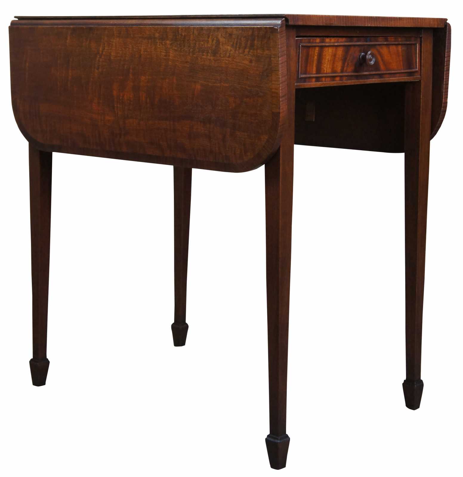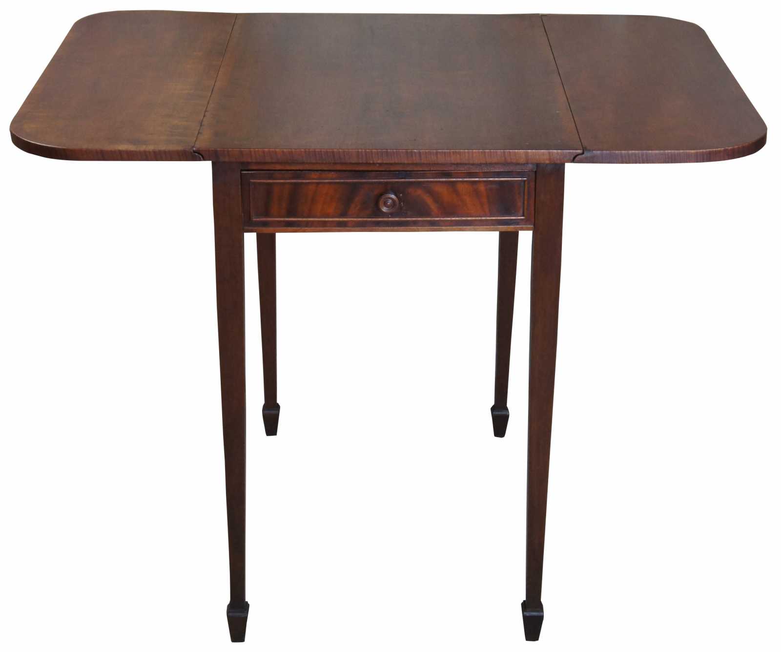 A stunning pair of antique drop leaf end tables by Imperial Furniture Co. Imperial operated out of Grand Rapids, Michigan between 1903-1954. Made from Genuine Mahogany in Sheraton Styling with Spade Feet. Each piece features a flame mahogany front drawer for storage.
