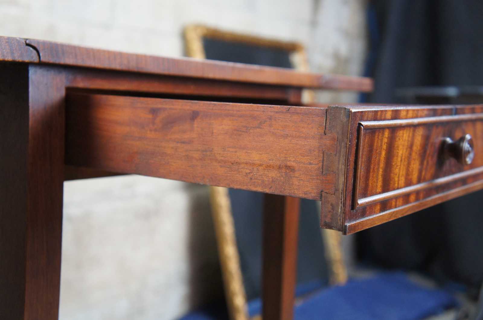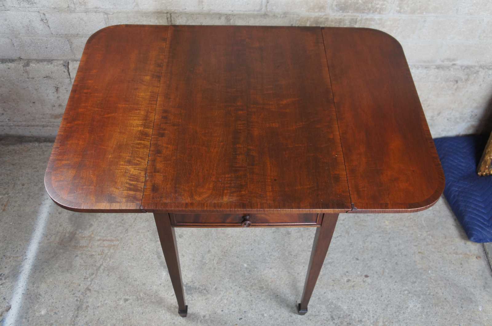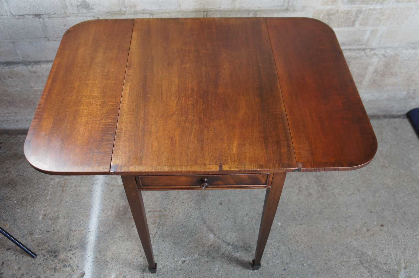 A stunning pair of antique drop leaf end tables by Imperial Furniture Co. Imperial operated out of Grand Rapids, Michigan between 1903-1954. Made from Genuine Mahogany in Sheraton Styling with Spade Feet. Each piece features a flame mahogany front drawer for storage.