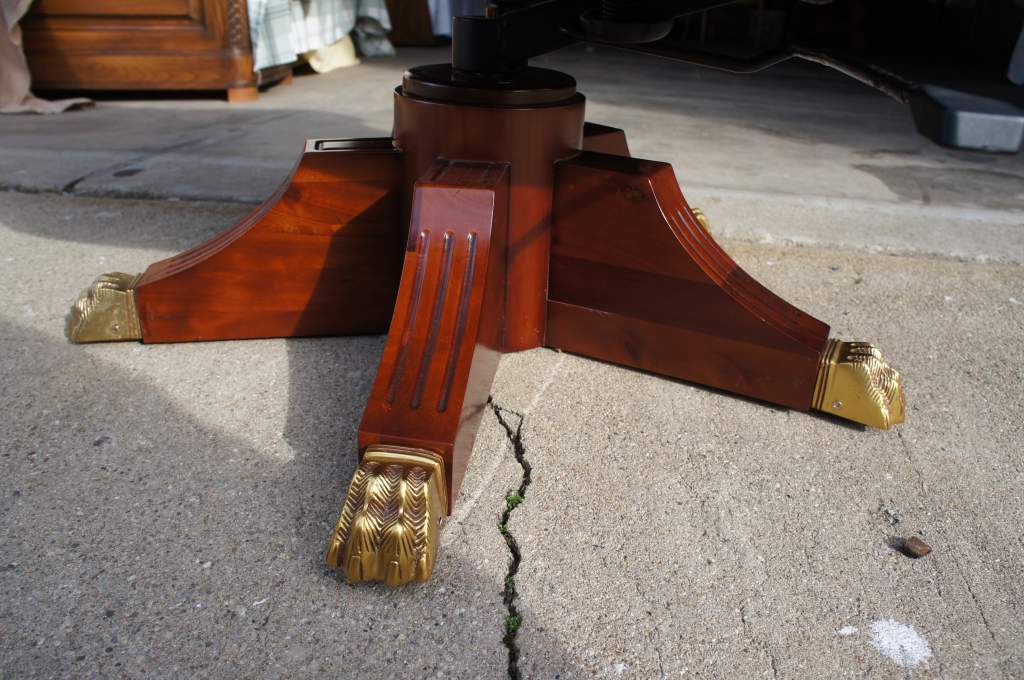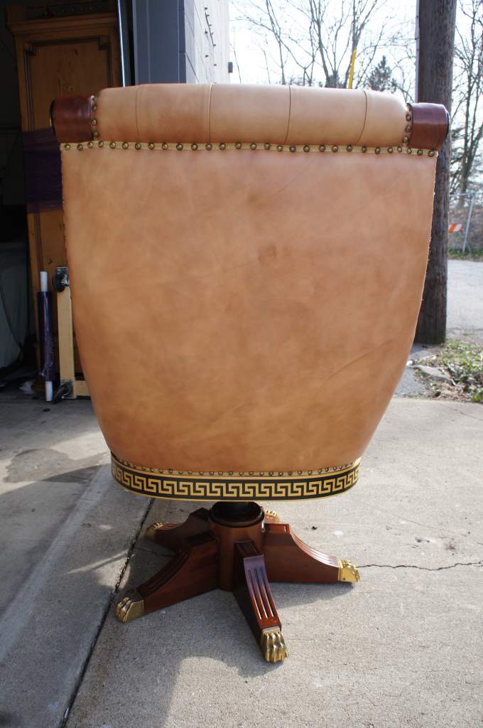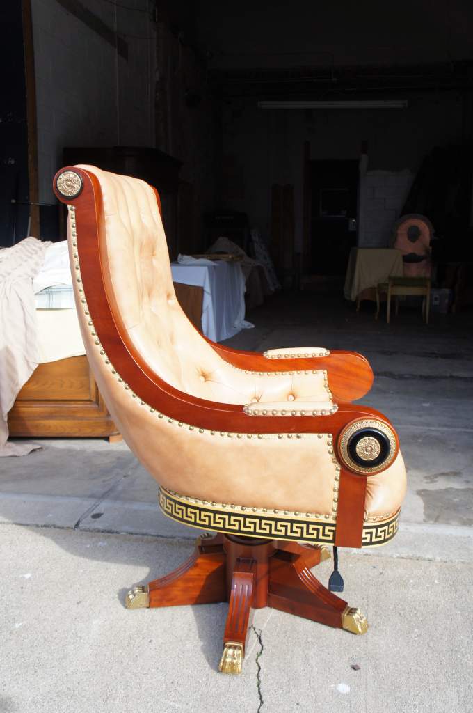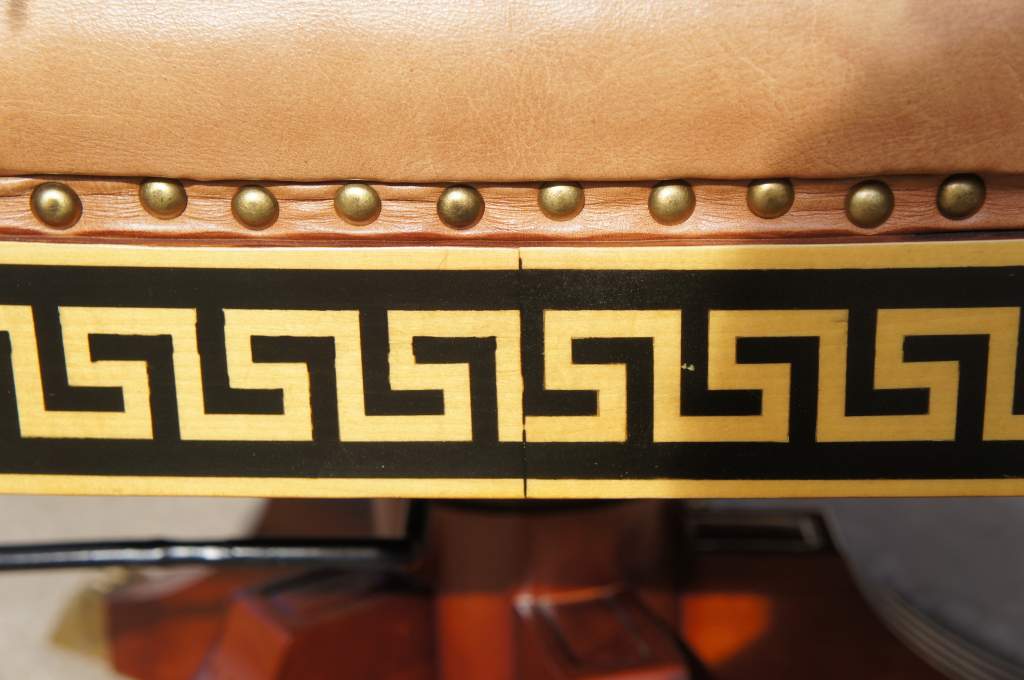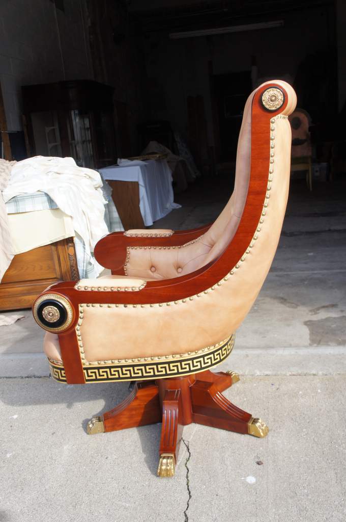 A magnificent office chair. Made from Mahogany with brass accents and black trim. The seat is leather with tufting throughout. The base of the chair has a Greek Key pattern. Matching desk available if interested. Will be hand delivered via White Glove Service