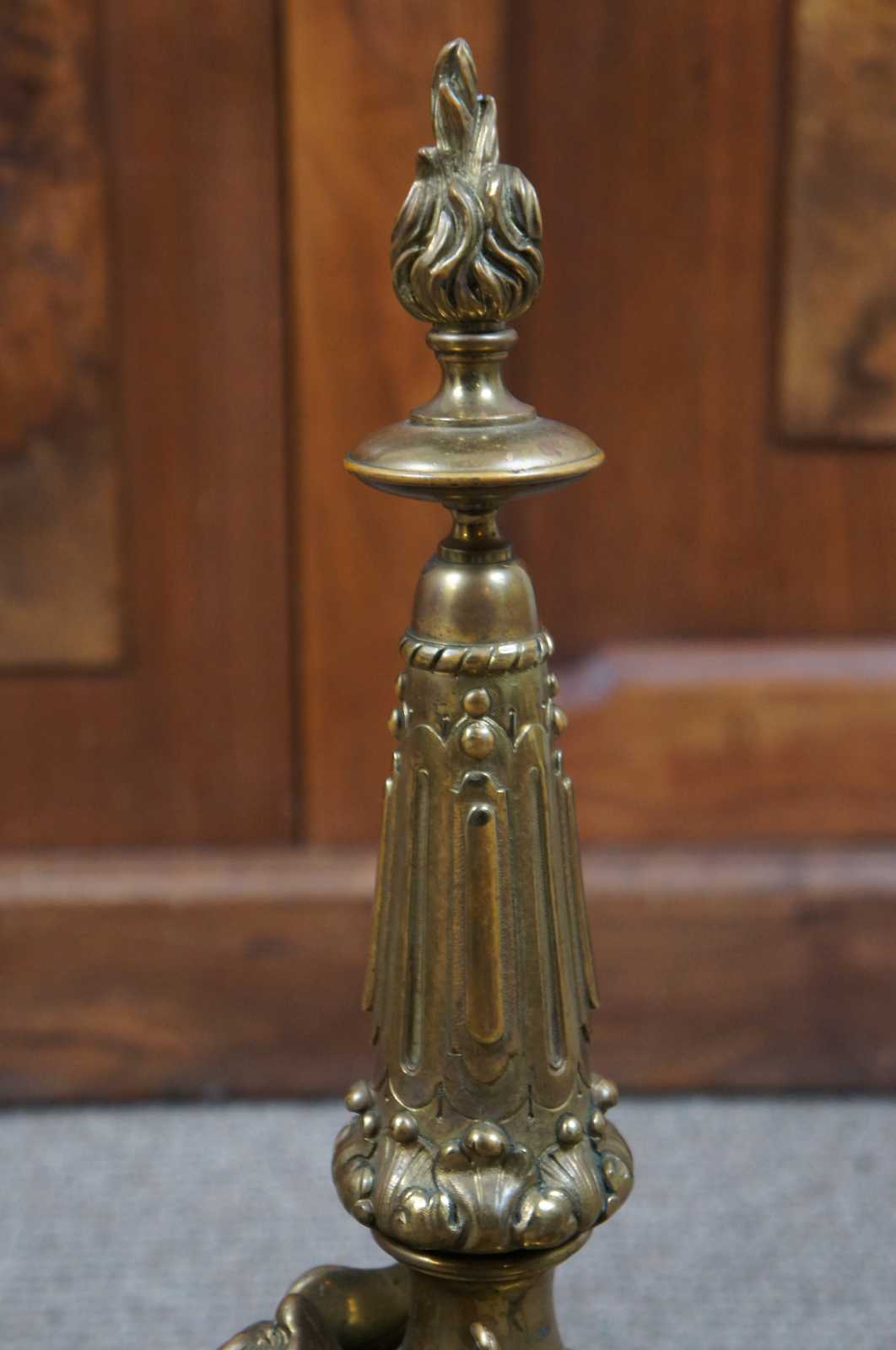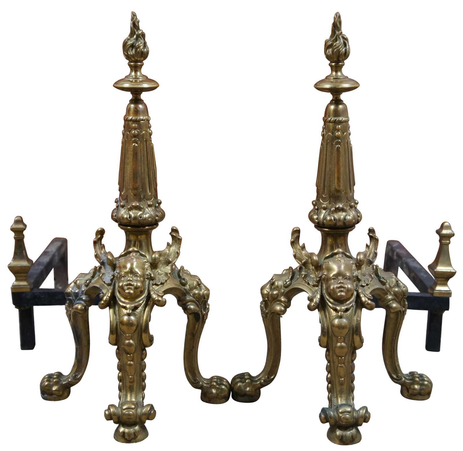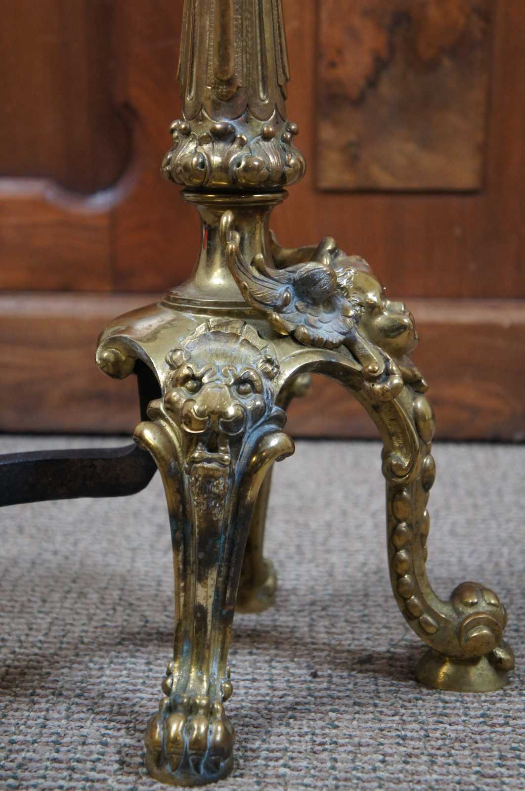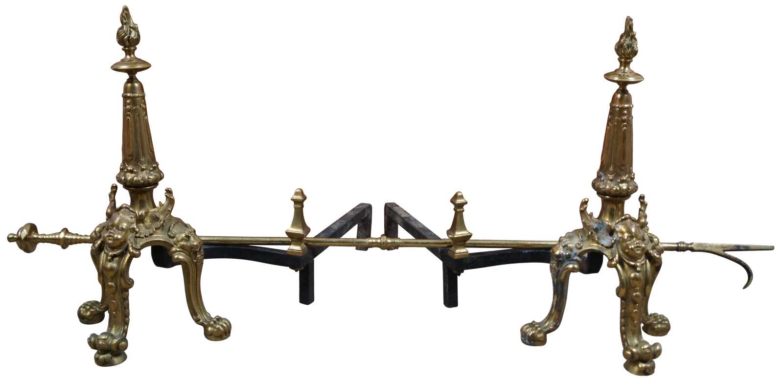 An exquisite set of English ormolu andirons & poker, circa last quarter 19th century. In the manner of French Empire or Louis XVI. Features an elaborate torchiere design over three legged paw foot base with wing cherubs and magnificent lion heads along the sides.