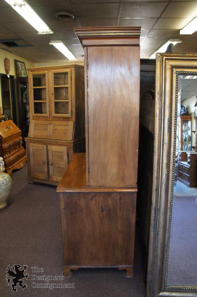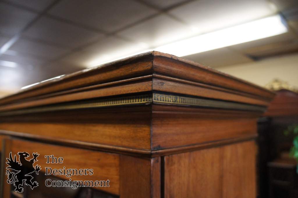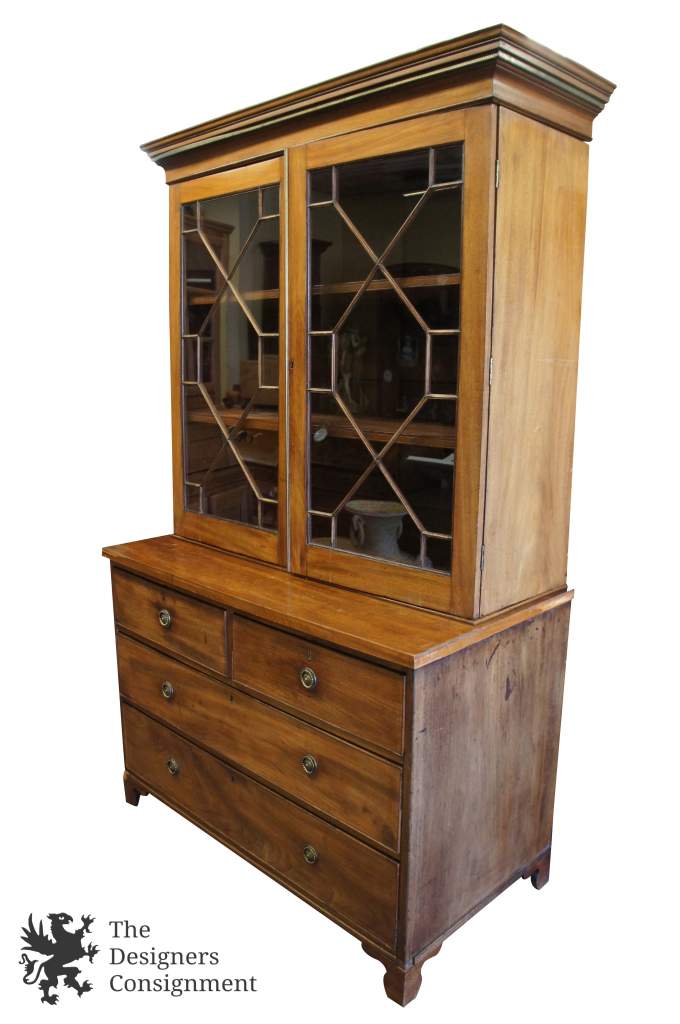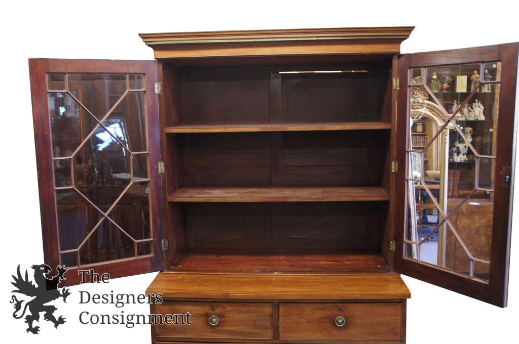 A beautiful George III 18th Century Step-Back bookcase. Made from Mahogany with fretwork along the glass doors and brass accents. A brass band can be seen along the crown. The back of the cabinet appears to say Euckyl Dentifrices in one spot as well as Southampton England. A fine addition to any collection.