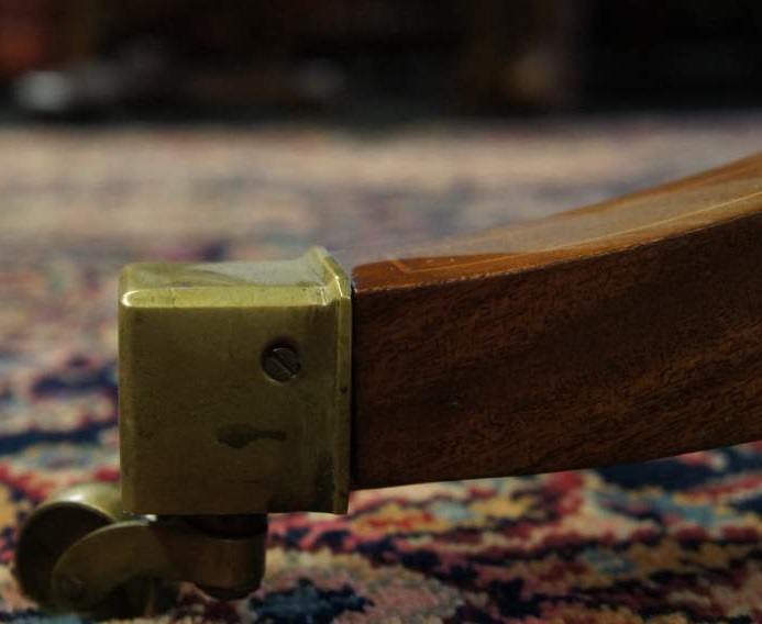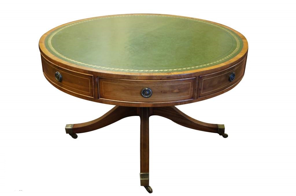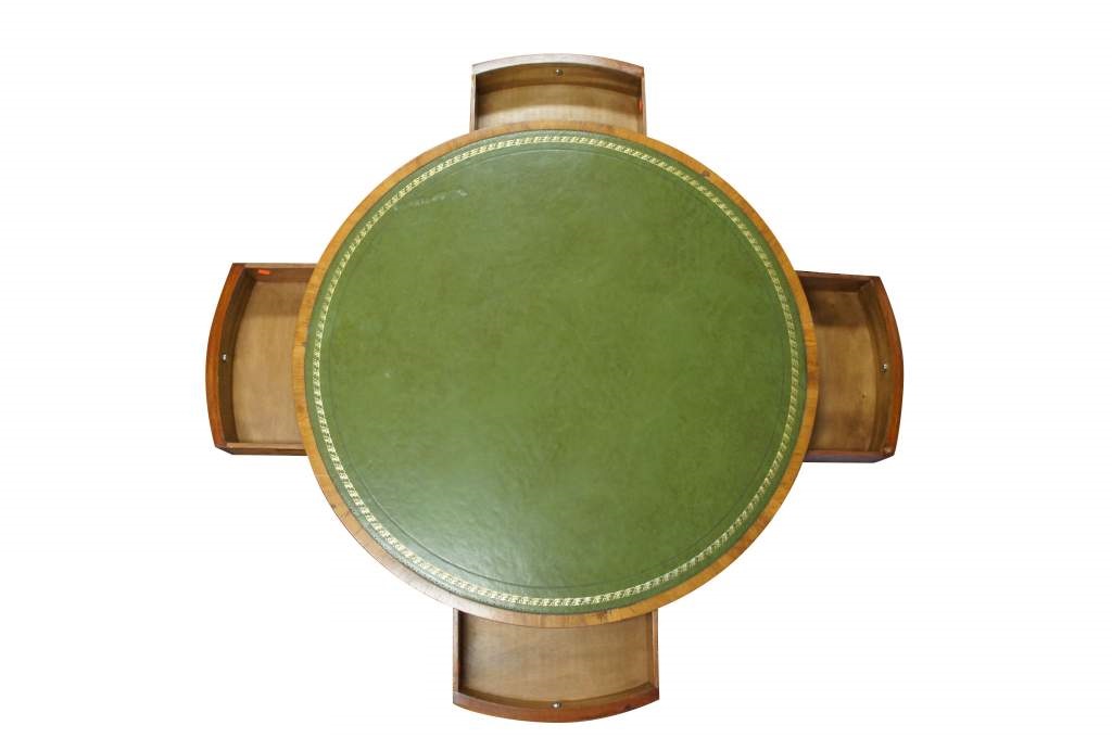A stunning early 19th Century rent table. Made from Mahogany with Tulip wood veneer and satin wood inlays. Features a green leather rotating top with gold trim. The leather was replaced at a later date. Each of the 8 drawers features brass hardware. 4 of those drawers are false. Every other opens as seen in the 3rd photograph. The beautifully contoured legs are headed with brass feet and casters. The perfect addition to any setting.