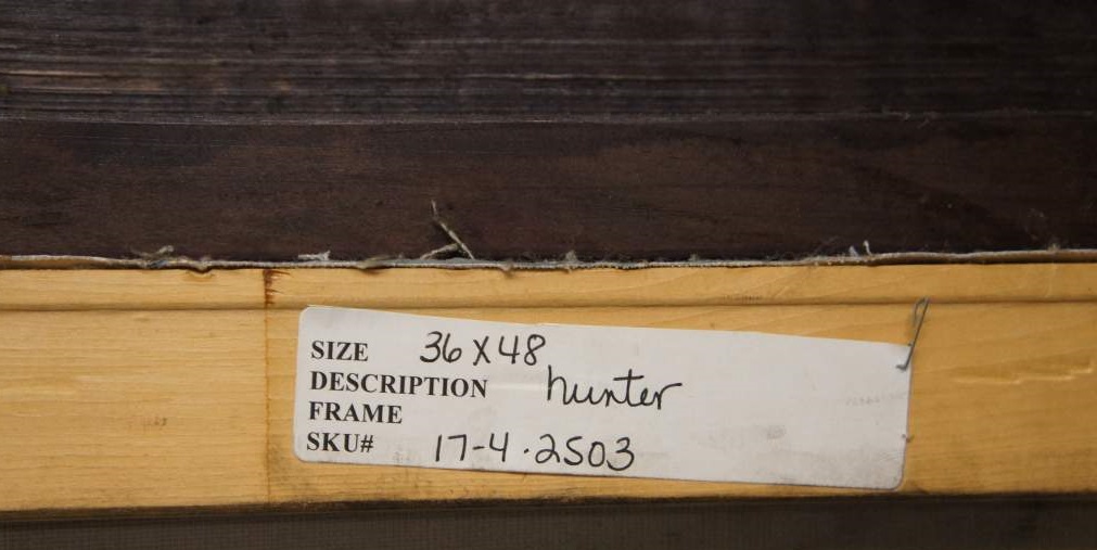 An amazing piece for any home. Titled "Hunter". Features a lad dressed in hunting attire holding two pheasants. He is holding a walking stick with his fearless dogs right by his side. Framed in a distressed dark wood-tonewith leather corners.