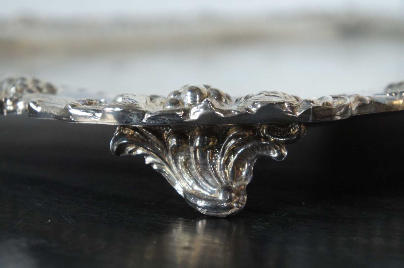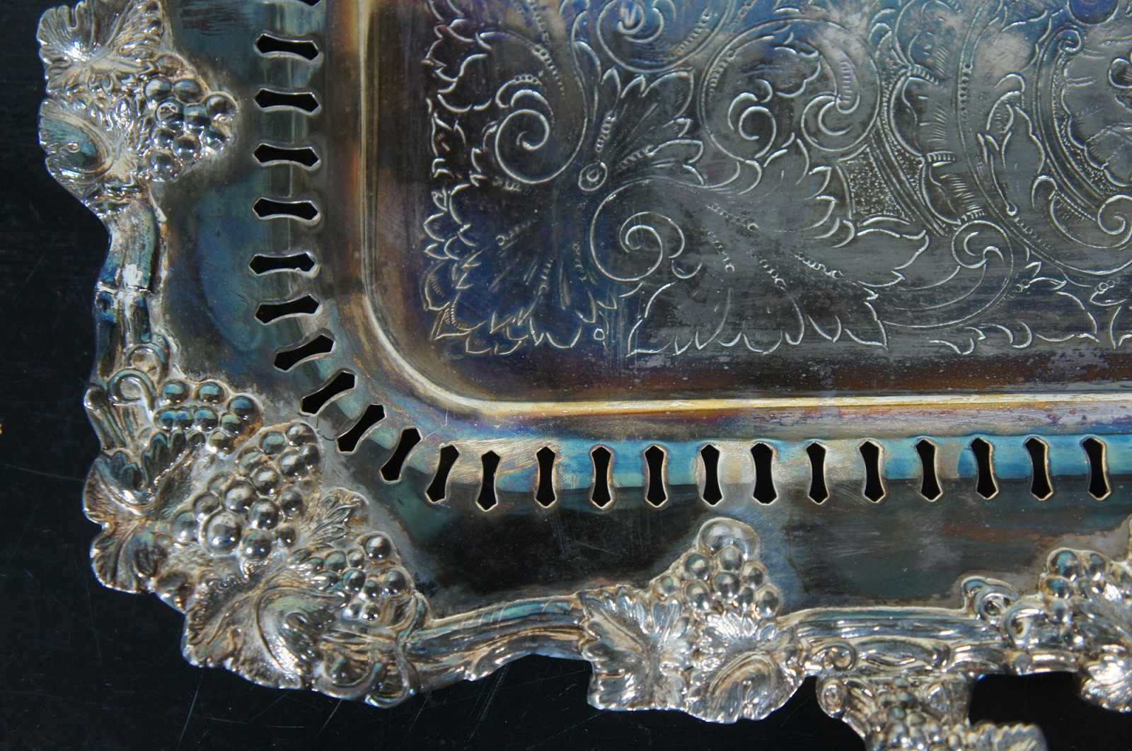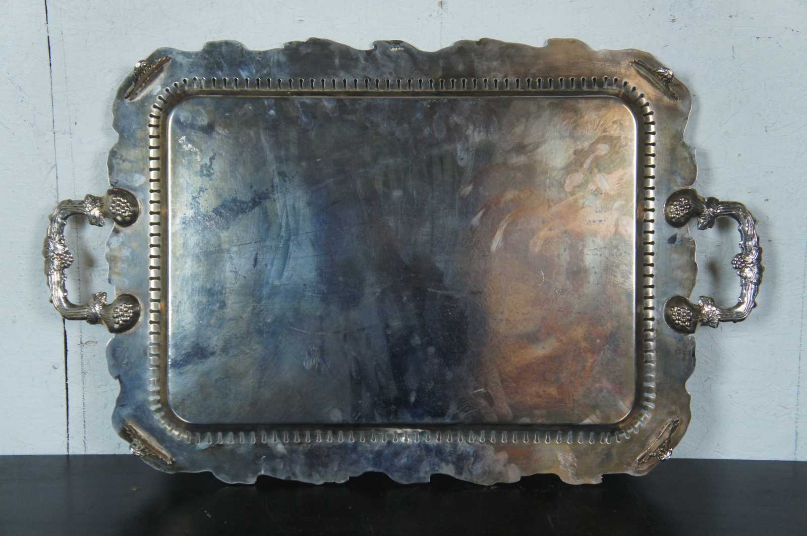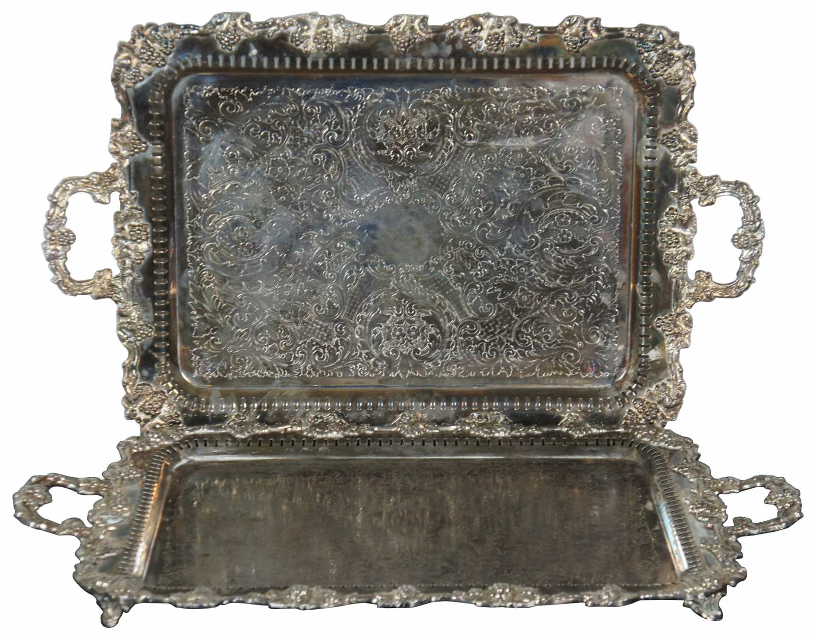 Extra large Birmingham Silver Company silverplated (silver on copper) butler tea tray or serving platter. Circa 1960s Features a scalloped floral and grape vine design with an engraved floral surface, reticulated border with handles and footed base. Two available, sold separately.