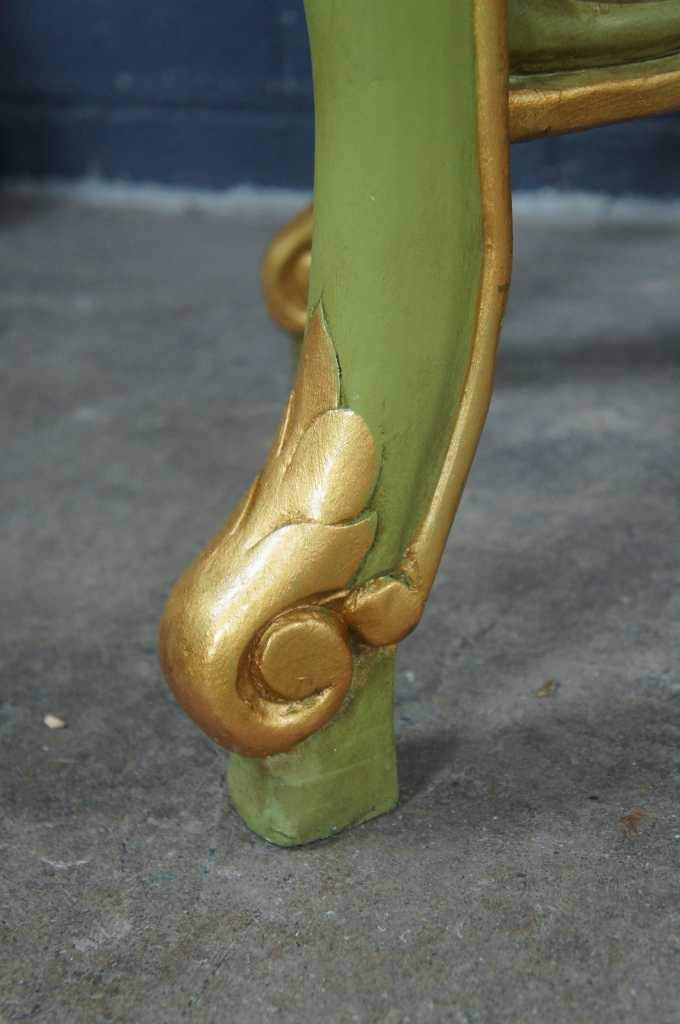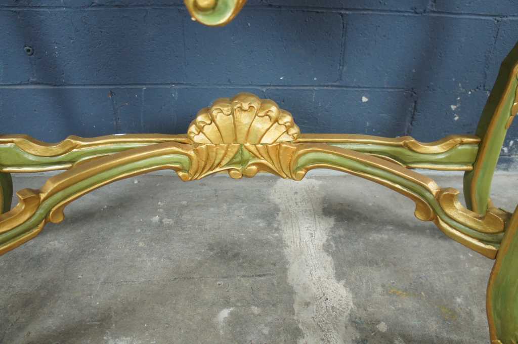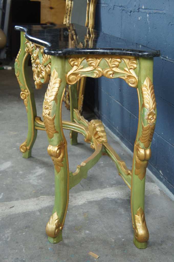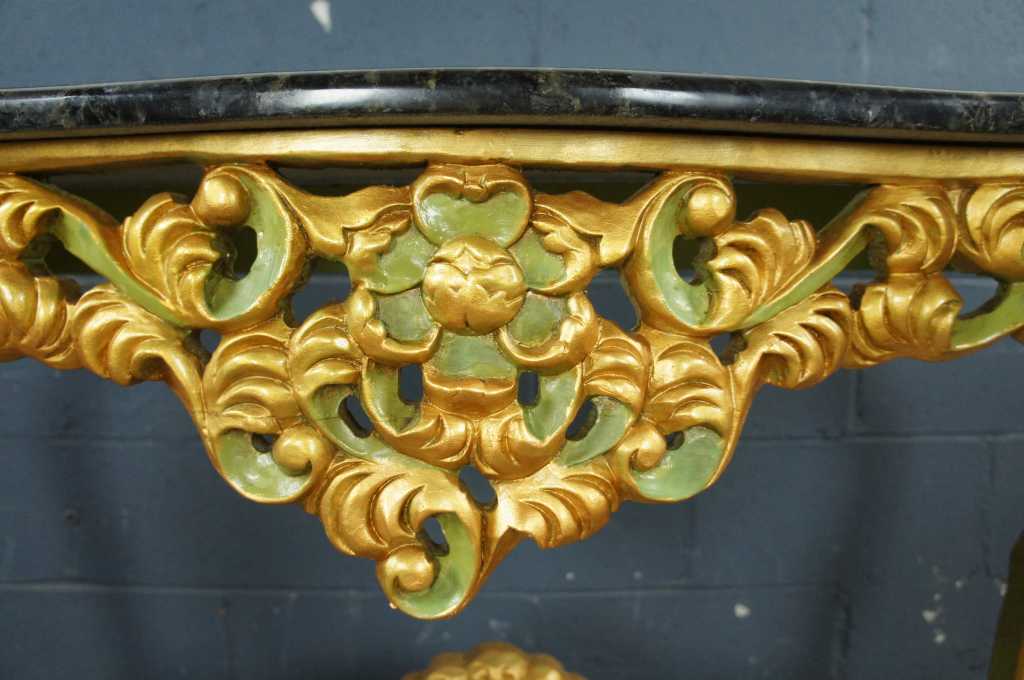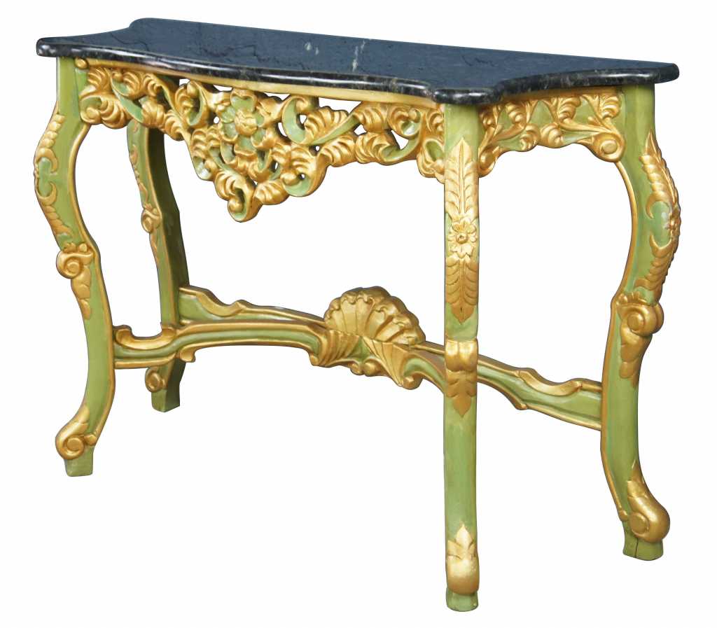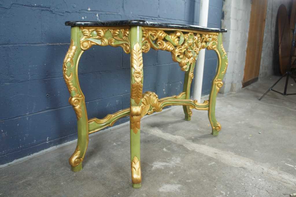 intricately detailed in gold trim. Console features a unique green tone that blends well with the granite top. Serpentine front with cabriole legs and scalloped accents.