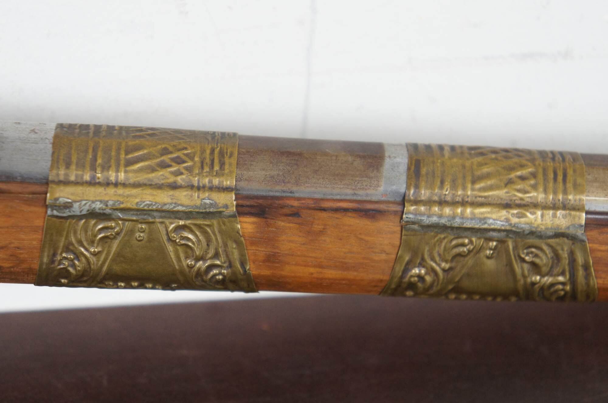 Good Overall Condition. The rifle appears to be missing the the ramrod. The flintlock mechanism does not release once the trigger is impressed, so it may need some adjustment. There appears to be a screw missing on the back of the flintlock bracket. There are some nail holes and a bore hole on the left side behind the bracket. The bone on the buttstock shows some hairlines as well as a chip.