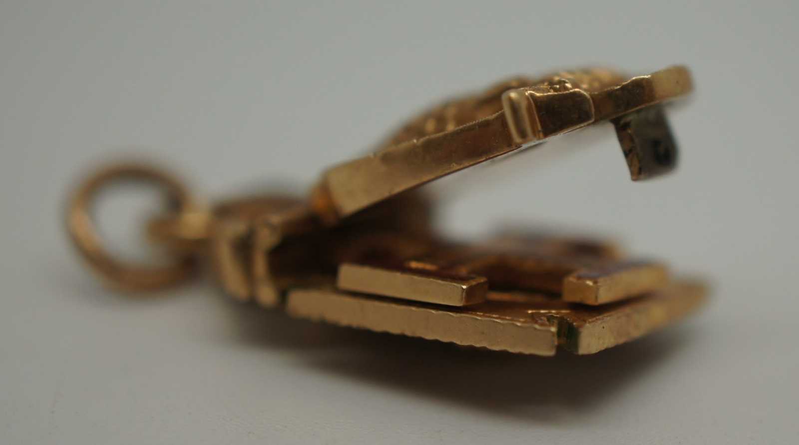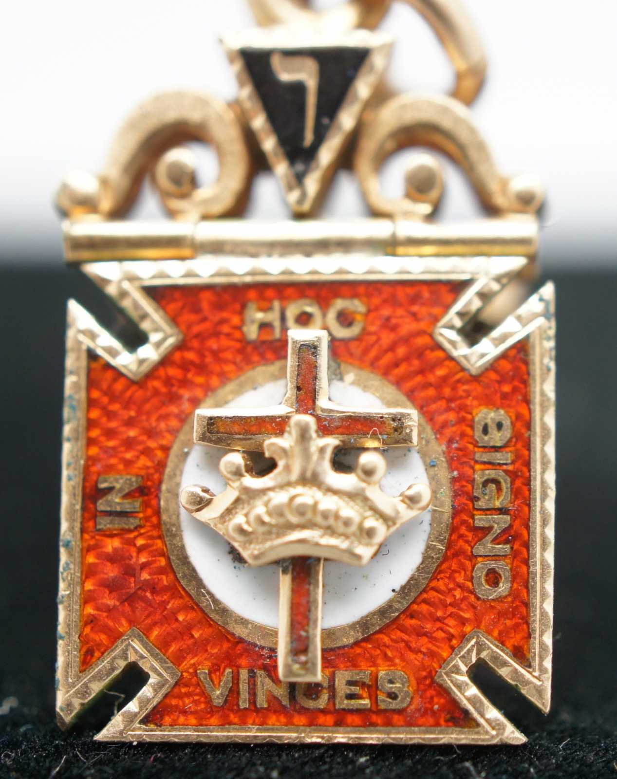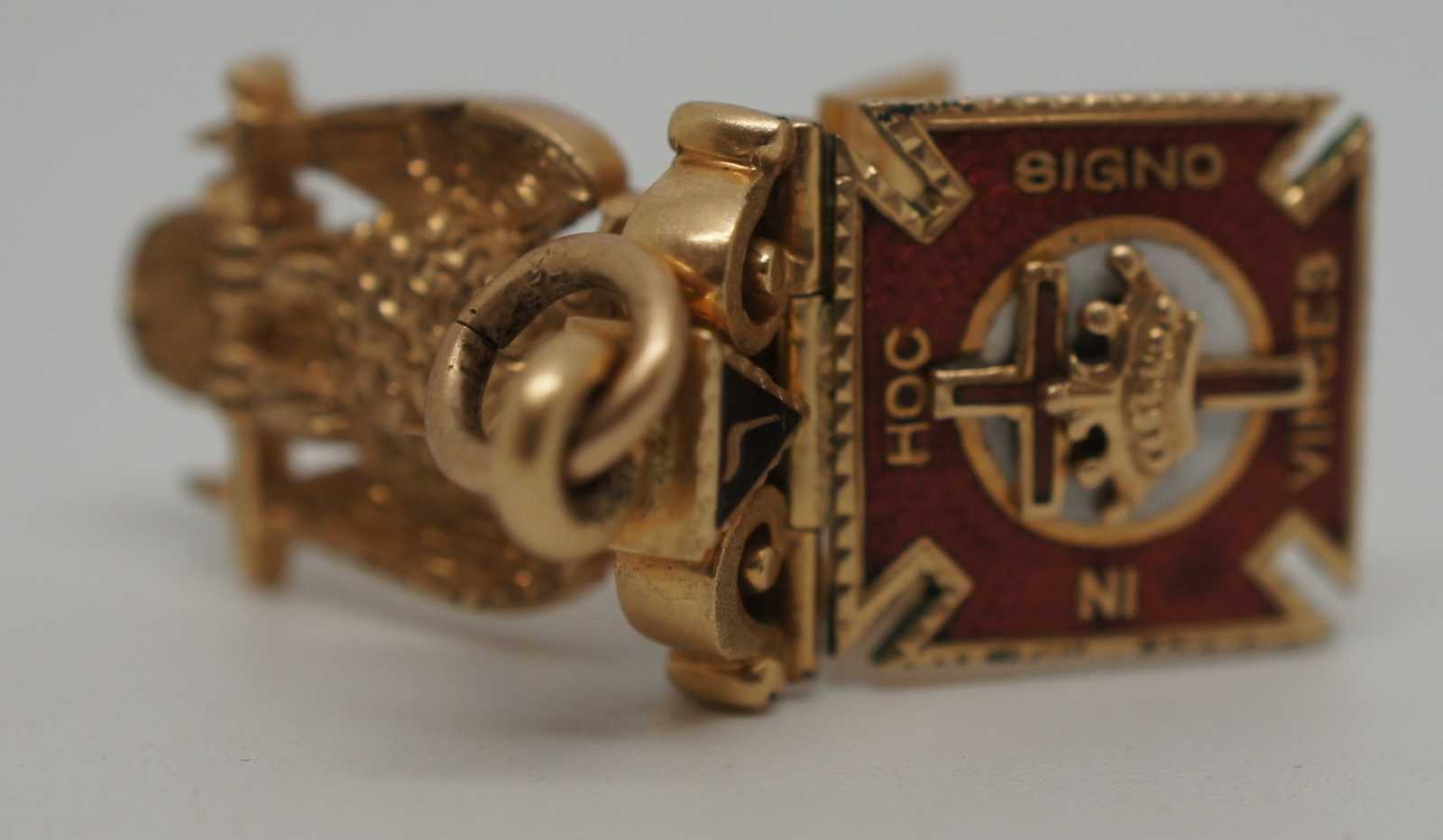 Trifold Masonic fob, charm or pendant. Features scottish rite, a double eagle, a cross and crown in enamel over 10k gold. In HOC Signo Vinces. Freemason.
