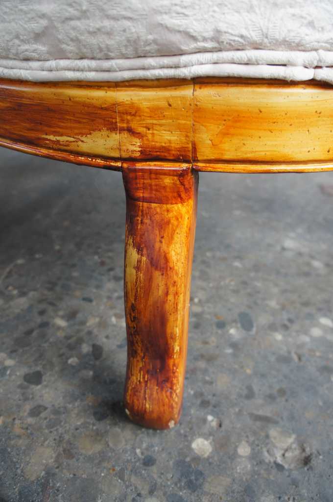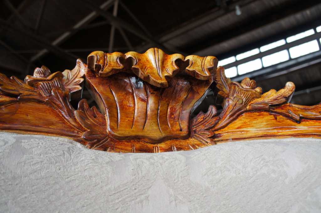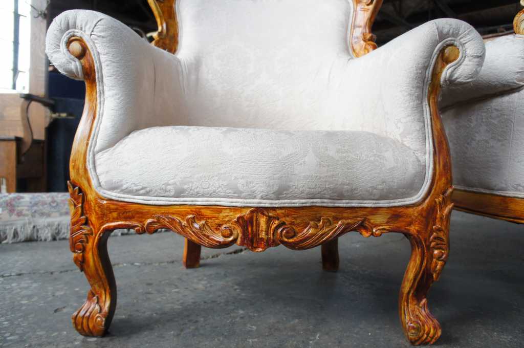 Exceptional Baroque Rococo designed club chairs. Features high relief scalloped floral carvings. Upholstered in a brocade fabric. Both chairs have the same fabric, one is tufted. The perfect statement for any setting. Matching sofa Available.