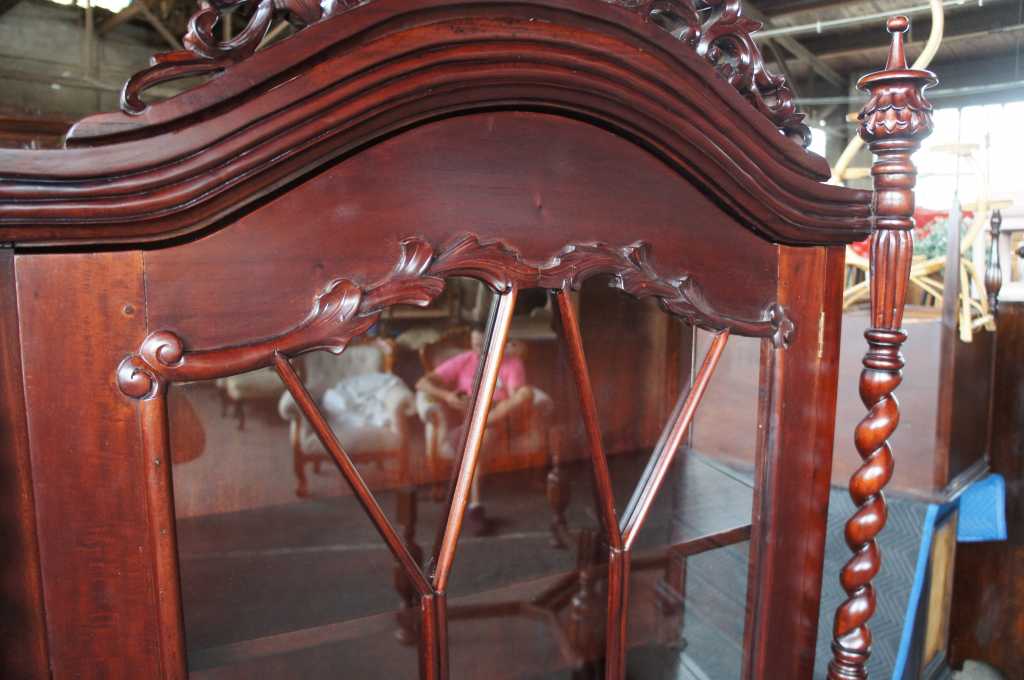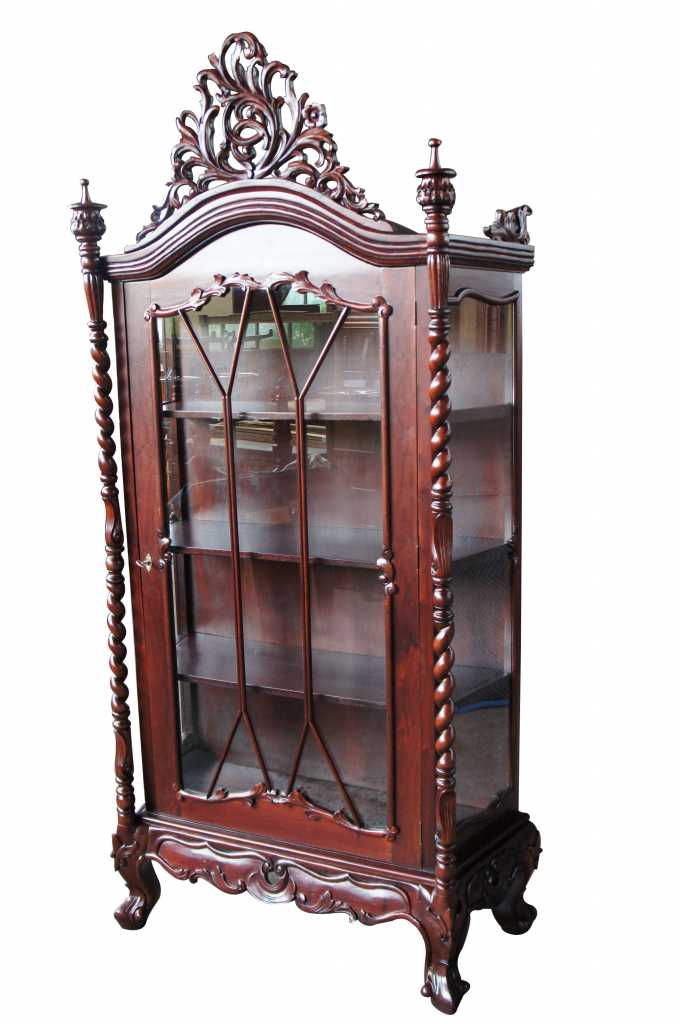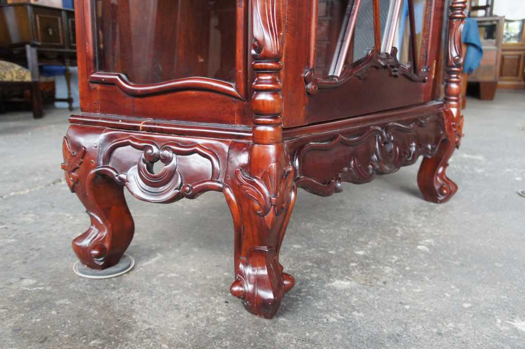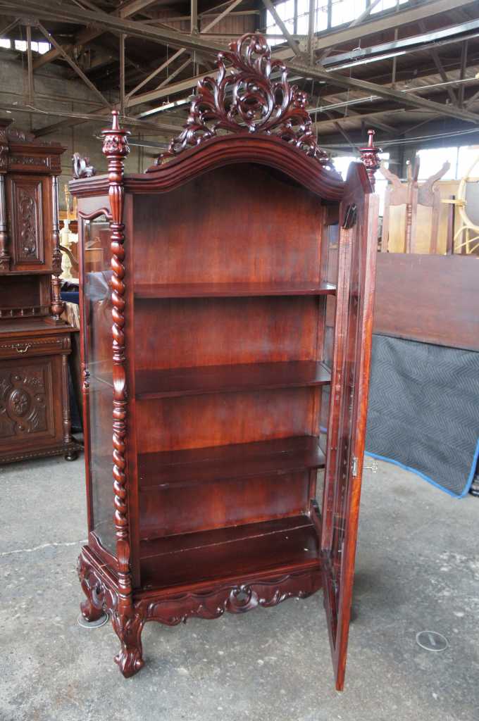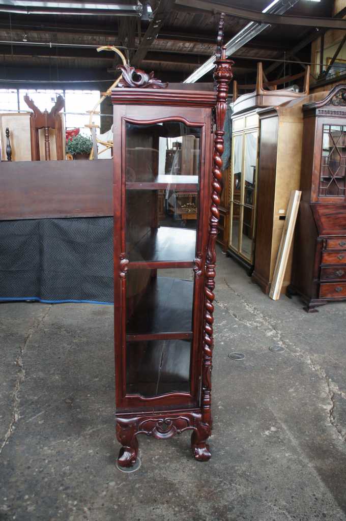 Late baroque (rococo) inspired mahogany vitrine cabinet. Beautifully carved with meticulous detail. The large door along the front is placed perfectly between two barley twist columns and opens to three fixed shelves. Upper crest removable allowing for fitment into tighter spaces.