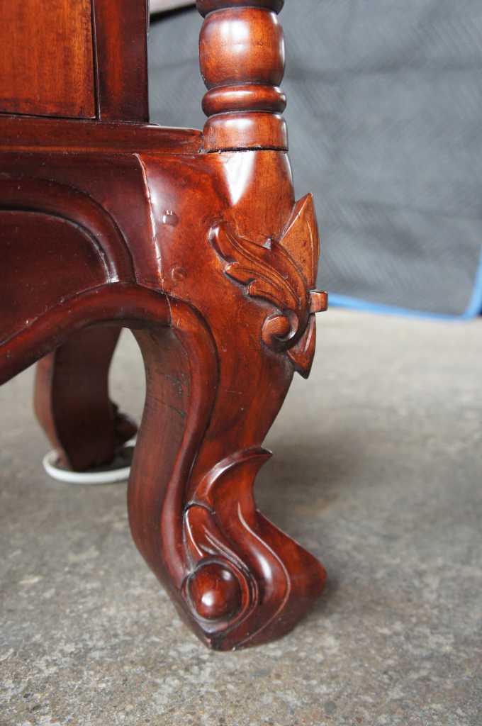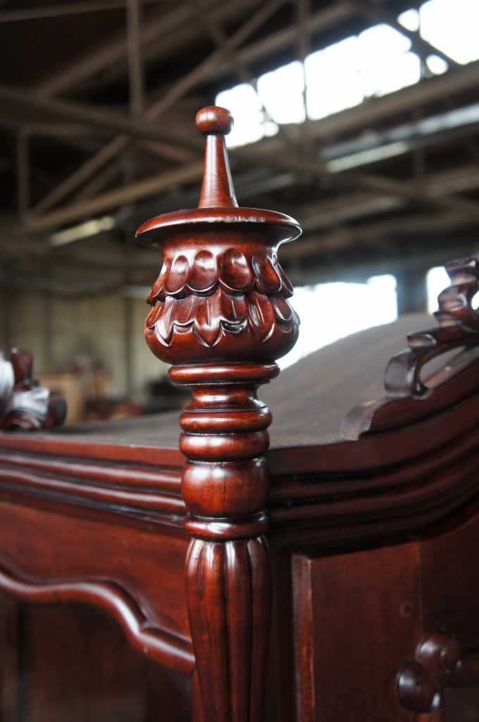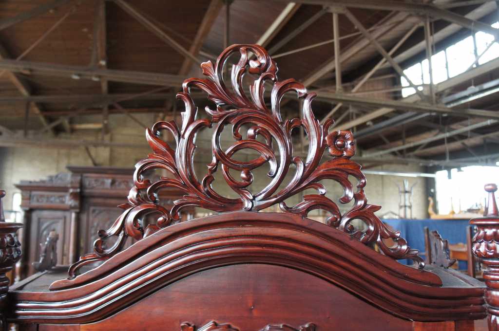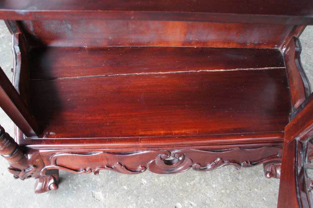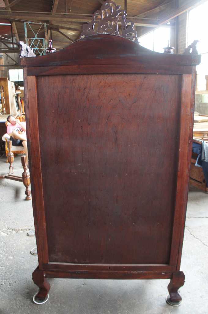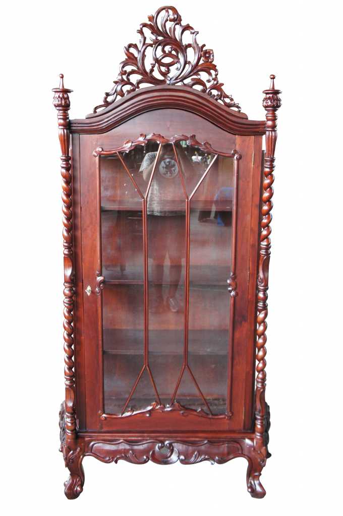Late baroque (rococo) inspired mahogany vitrine cabinet. Beautifully carved with meticulous detail. The large door along the front is placed perfectly between two barley twist columns and opens to three fixed shelves. Upper crest removable allowing for fitment into tighter spaces.