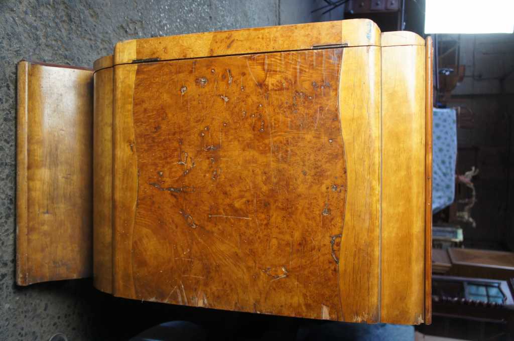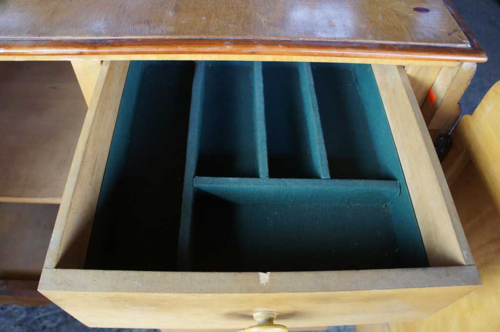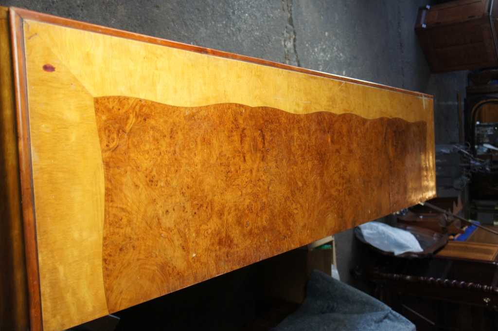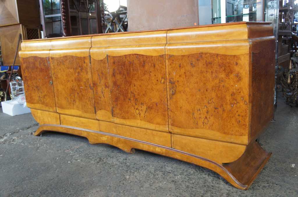 Early 20th Century Art Deco four door sideboard. Burled walnut veneer with two-tone front and waterfall top. Opens to four drawers and shelves. Includes a felt lined silverware drawer on the right side . Paper Label along the back marked "M & CIA". Matching dining table available separately.