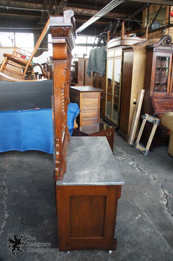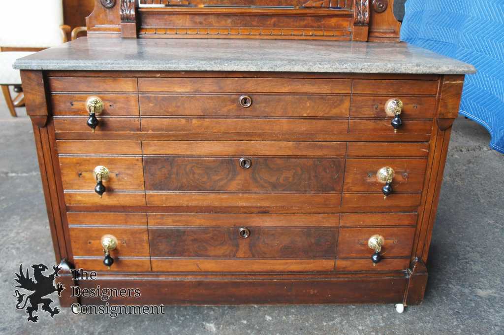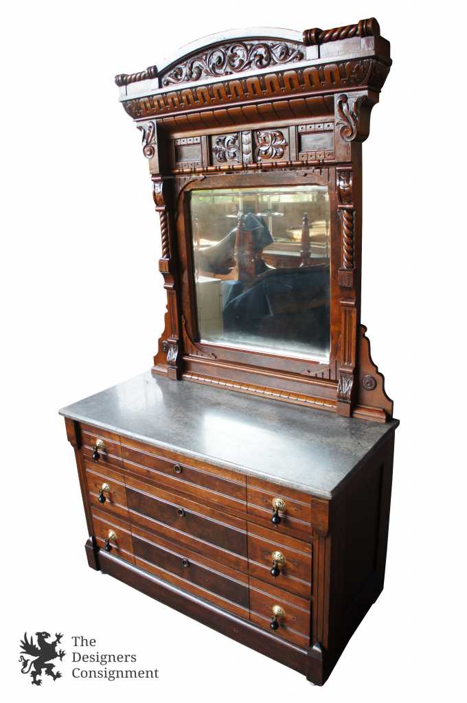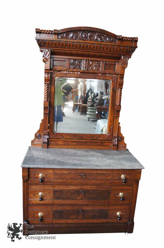 This gorgeous Victorian era Eastlake dresser comes from the aesthetic period, circa 1880s. The aesthetic movement was a late nineteenth century movement that championed pure beauty and 'art for art's sake' emphasizing the visual and sensual qualities of art and design over practical, moral or narrative considerations. Made from walnut with burled panels and meticulously carved accents. Features a high back-splash with swiveling mirror, acanthus detail and barley twist trim. Dresser features 3 drawers with brass hardware and marble top. An exquisite design that will make a great addition to any setting!