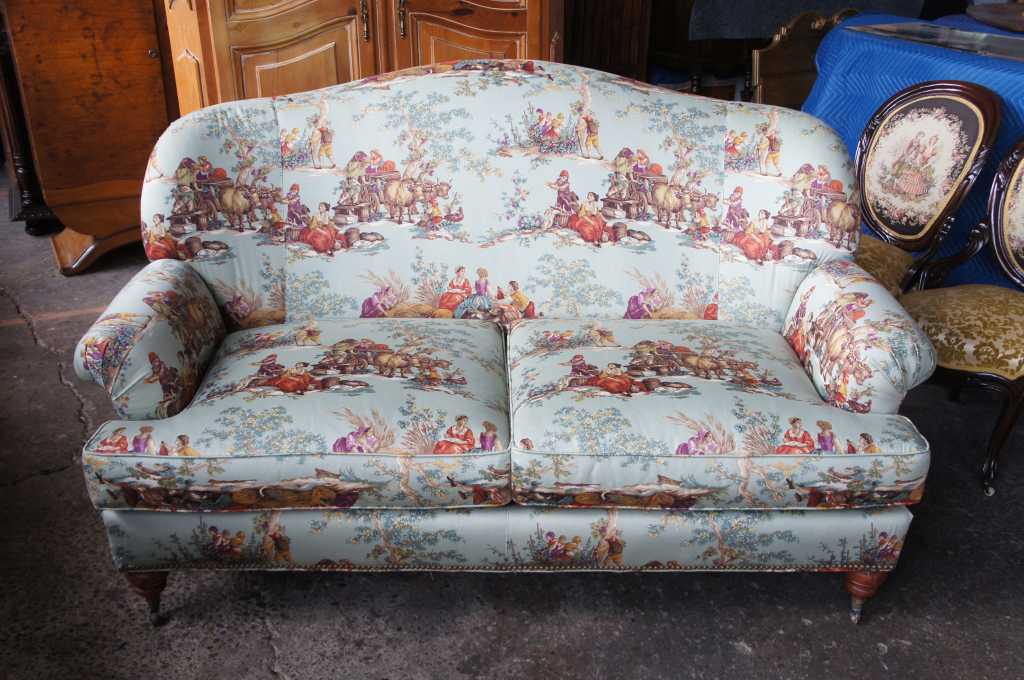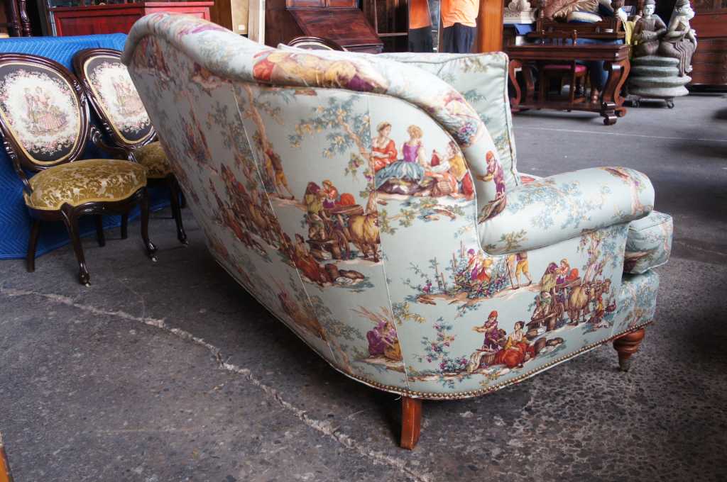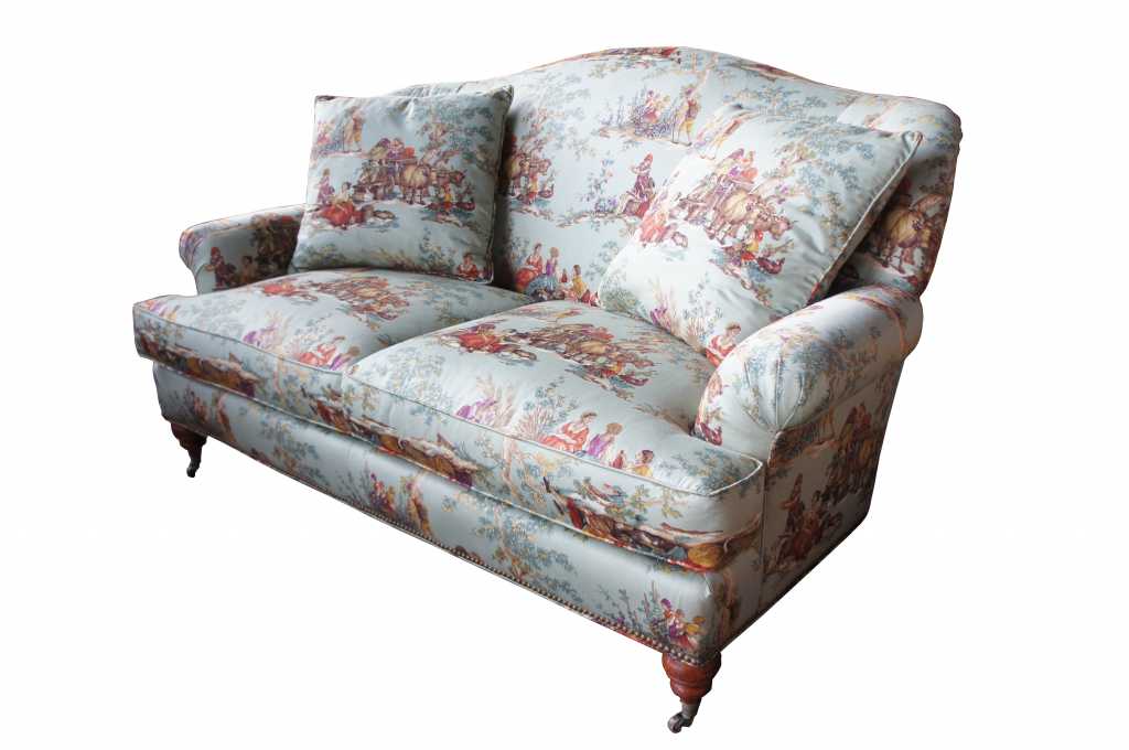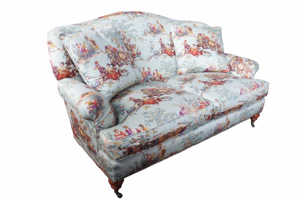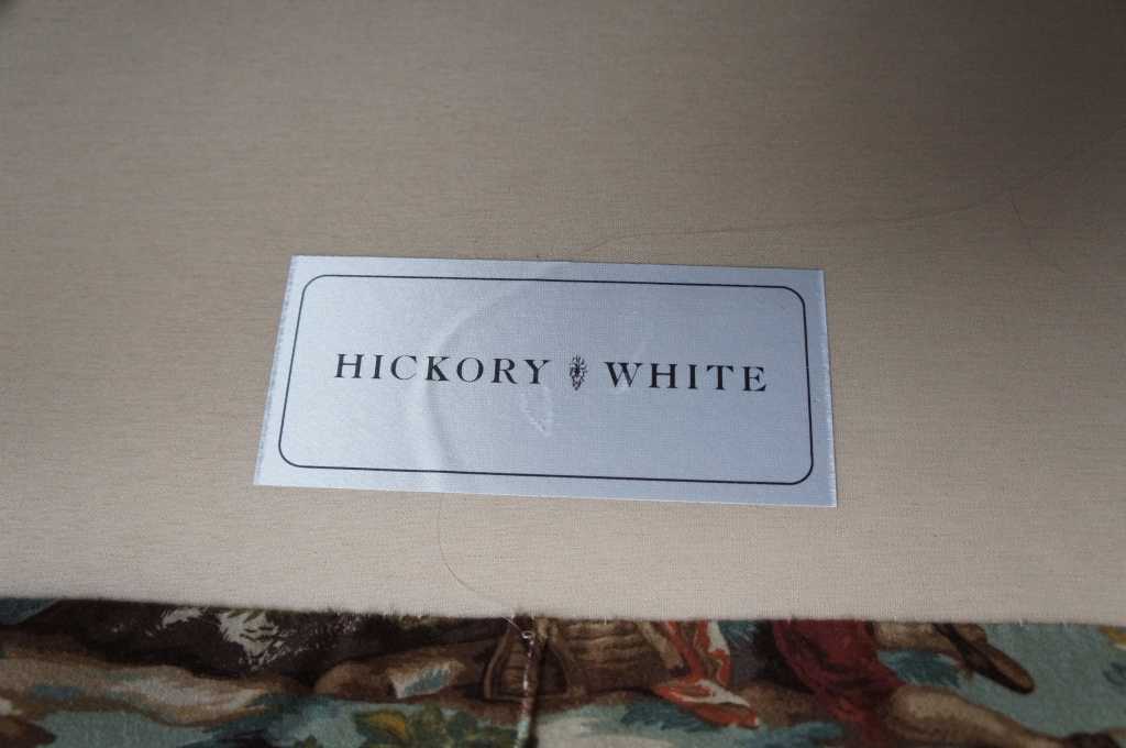 Up for consideration is a beautiful Hickory White camel back sofa. A stately accommodation in its traditional styling with rolled arms and cherry turned arrow feet with casters. Upholstered in a new age turquoise toile silk blend fabric with nail head trim.