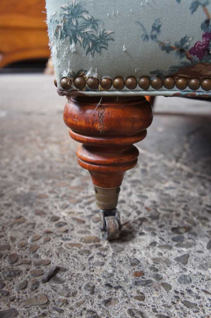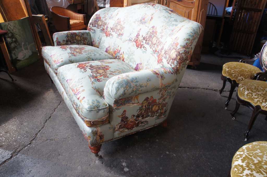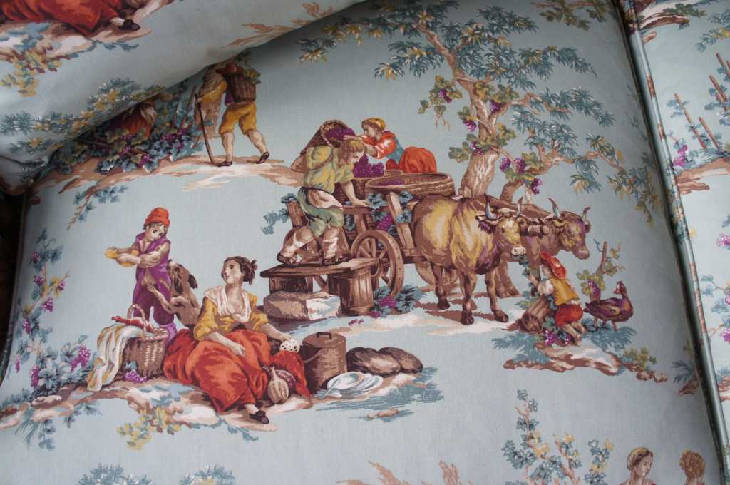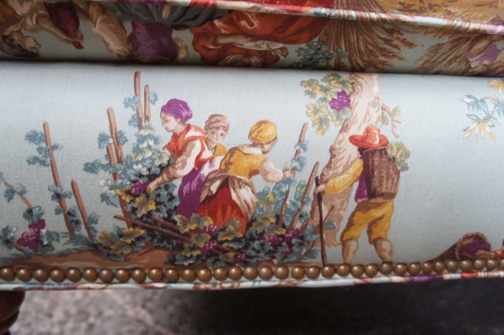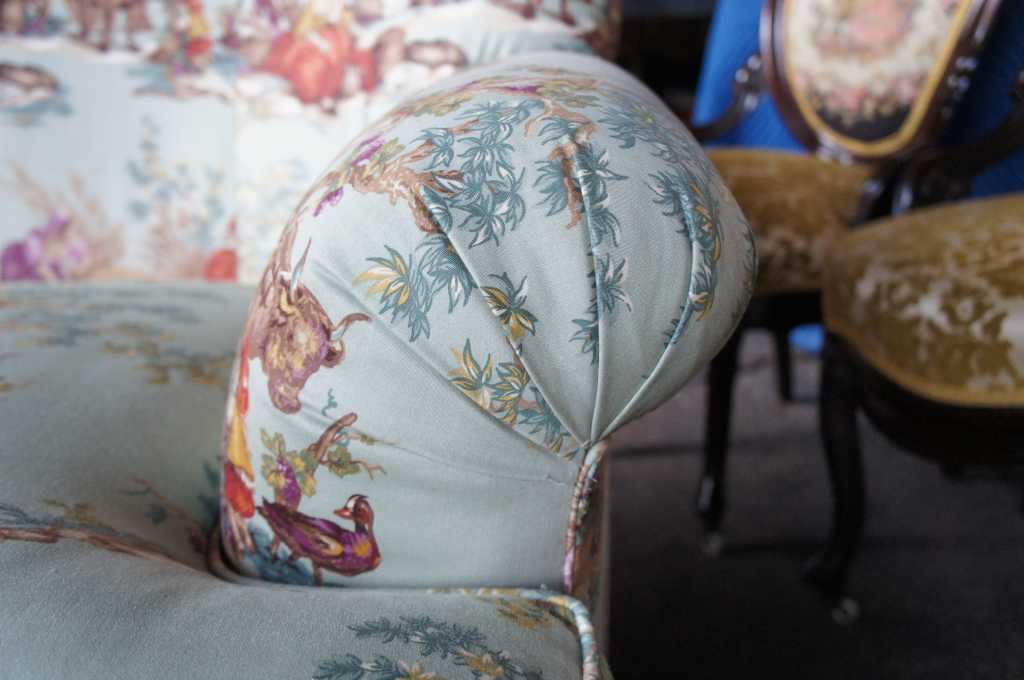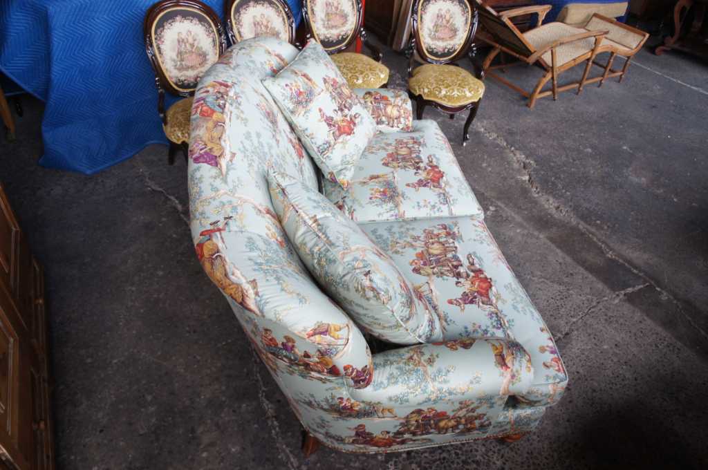 Up for consideration is a beautiful Hickory White camel back sofa. A stately accommodation in its traditional styling with rolled arms and cherry turned arrow feet with casters. Upholstered in a new age turquoise toile silk blend fabric with nail head trim.