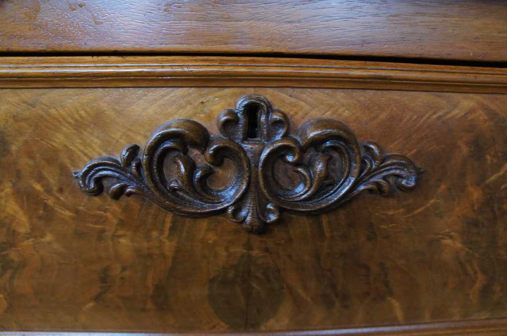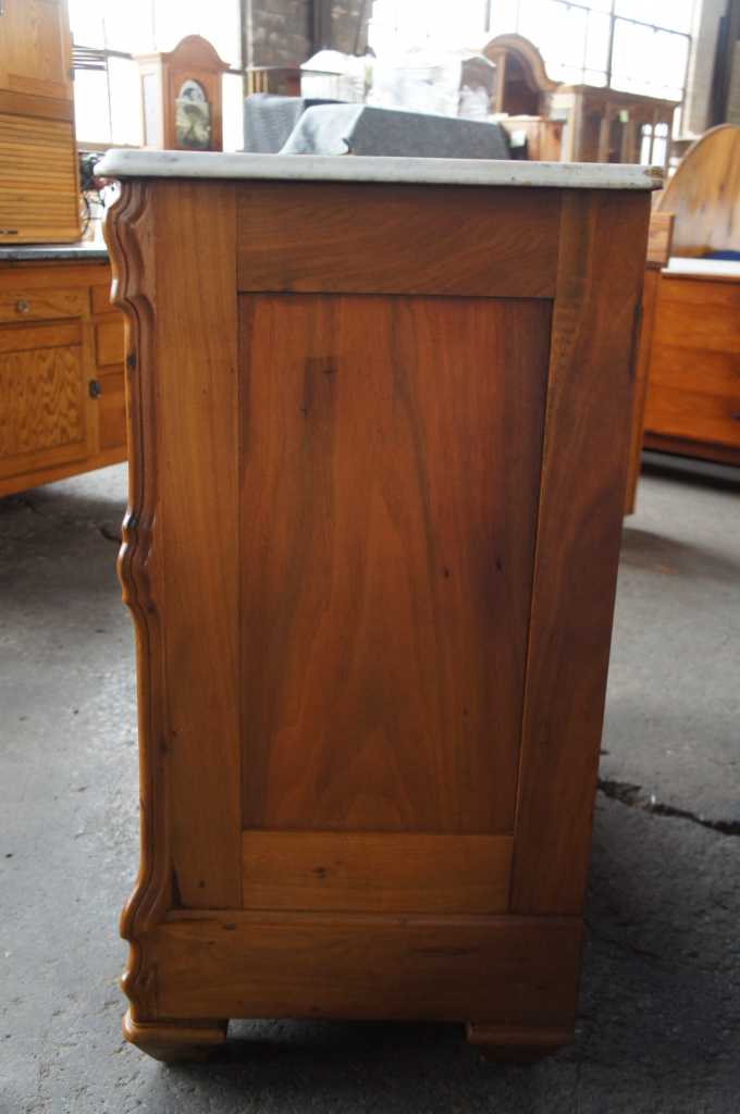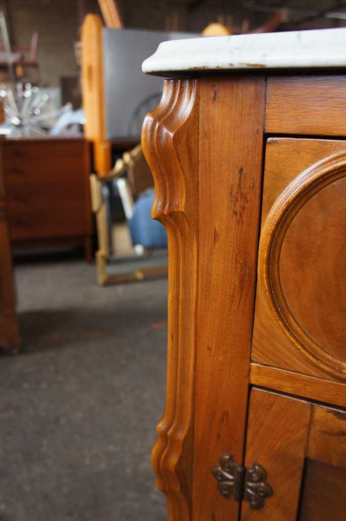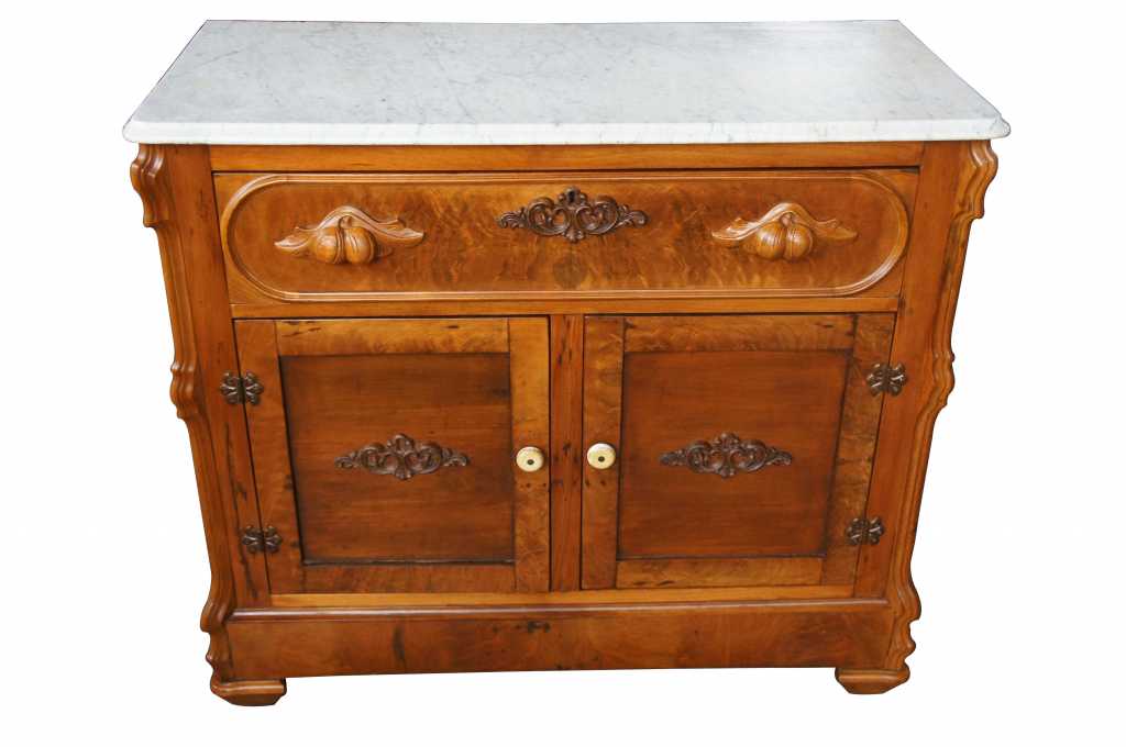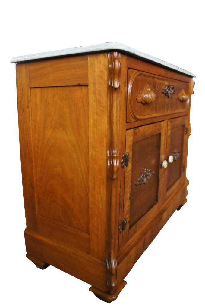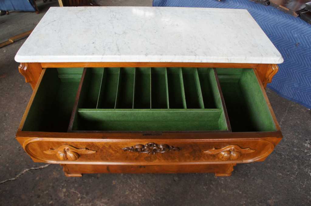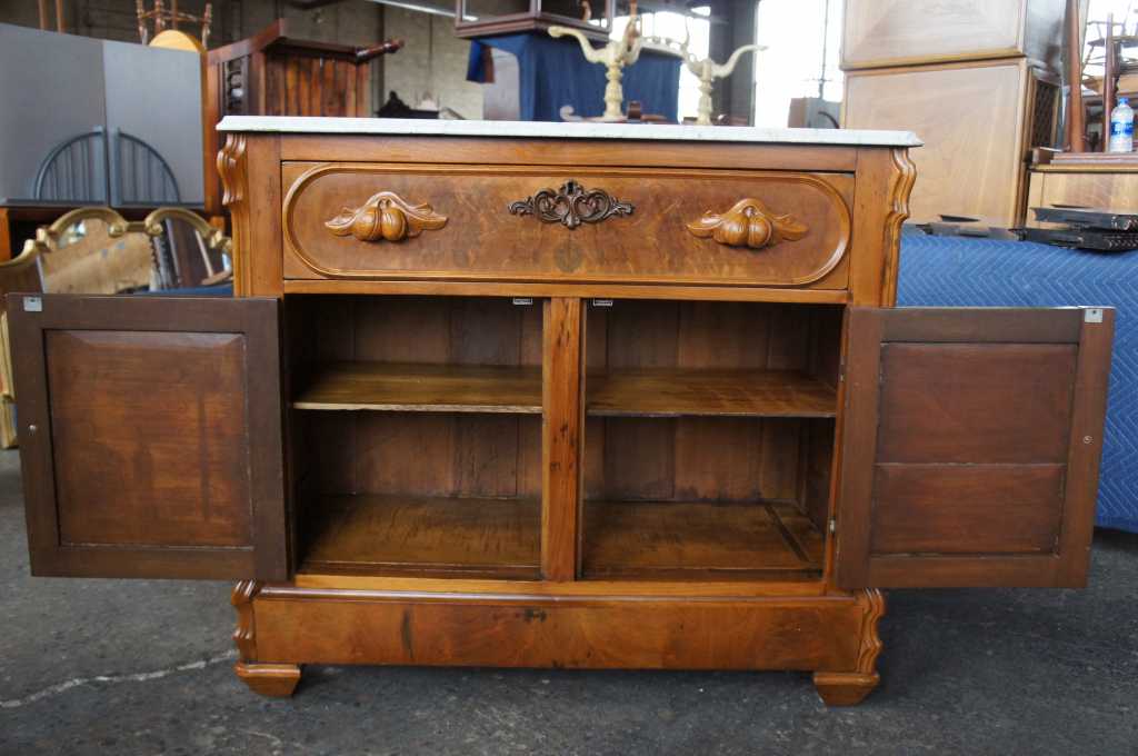 An immaculate mid 19th century American made Victorian buffet. Made from solid walnut with crotch front and marble top. The main drawer is hand dovetailed and felt lined with a sliding shelf for silverware. Drawer front shows hand carved fruit and walnut pulls. Lower cabinet features porcelain knobs and opens to an interior shelf.