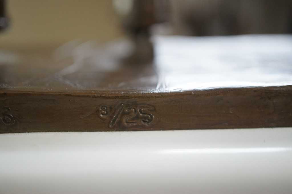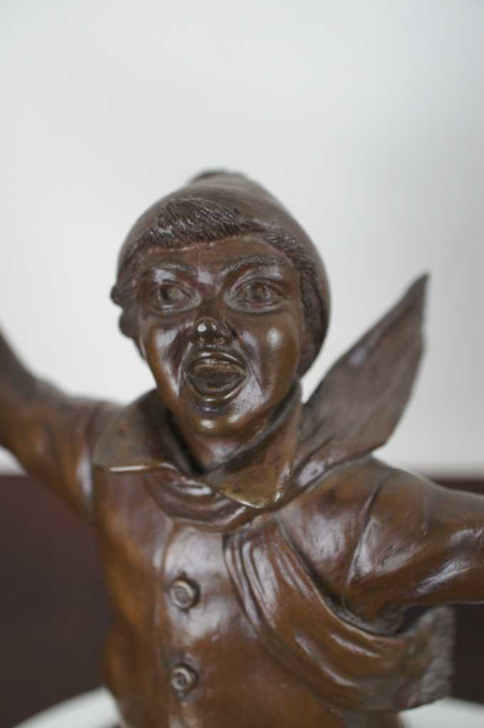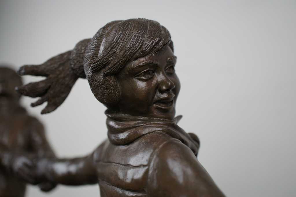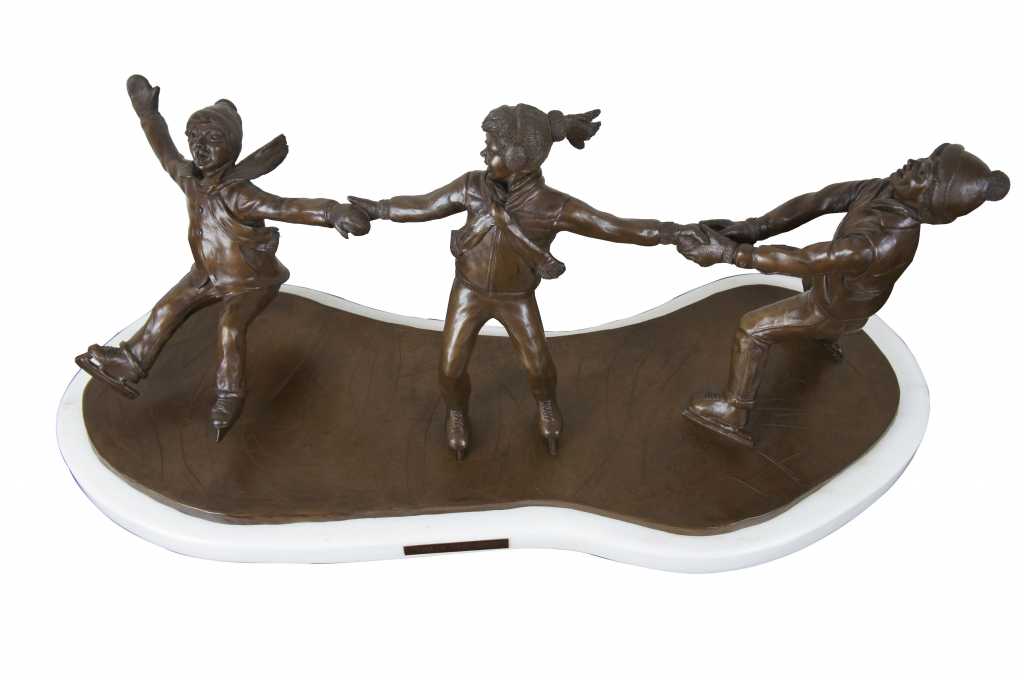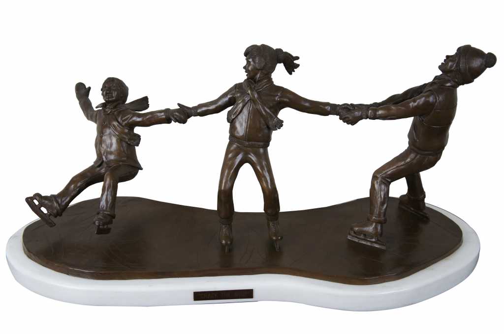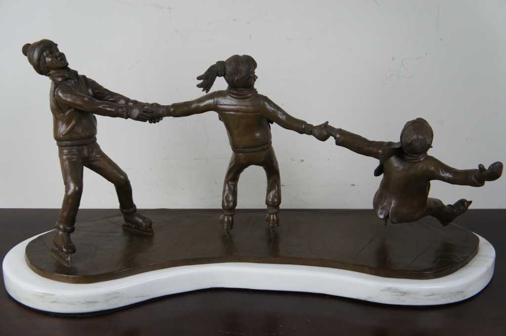 A gorgeous bronze portraying a group of 3 children playing crack the whip on ice. 3/25 on marble base.
