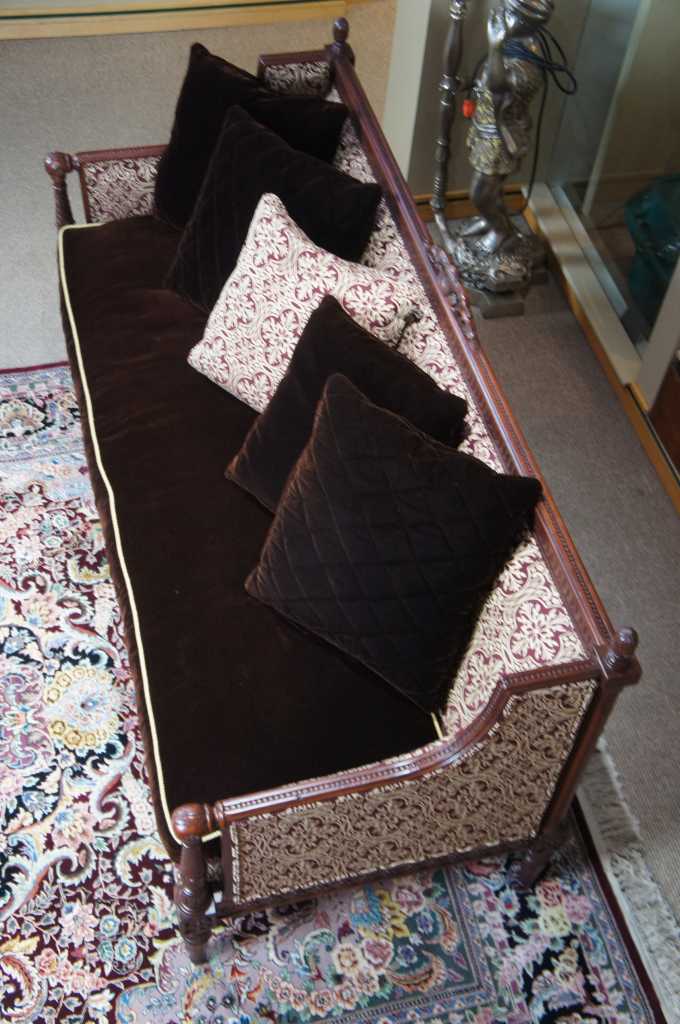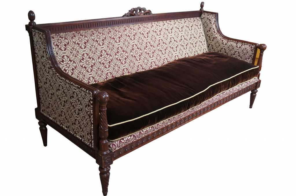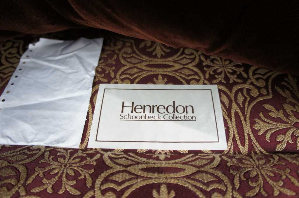 An exceptionally designed sofa from Henredon's Schoonbeck Collection. Features Louis XV inspired turned arms, dolphin cresting and acorn finials. Additional touches are gadrooning over arms, notches along the back and floral medallions trimming the base board. Upholstered in a maroon and gold brocade with dark burgundy cushions and back pillows. Matching Chairs available separately.