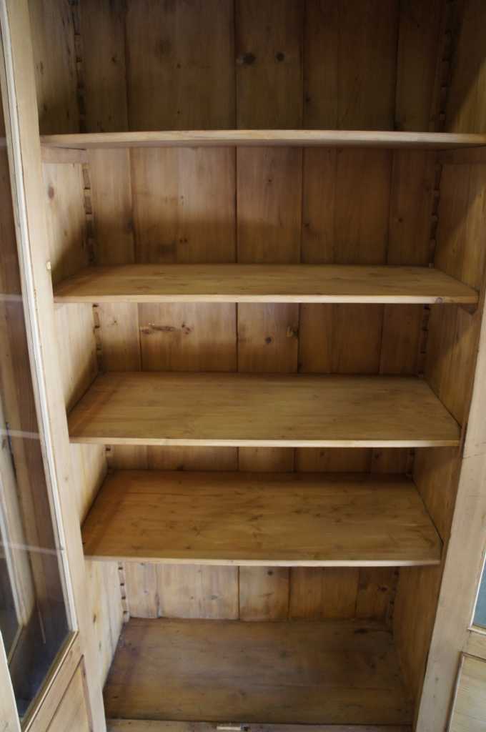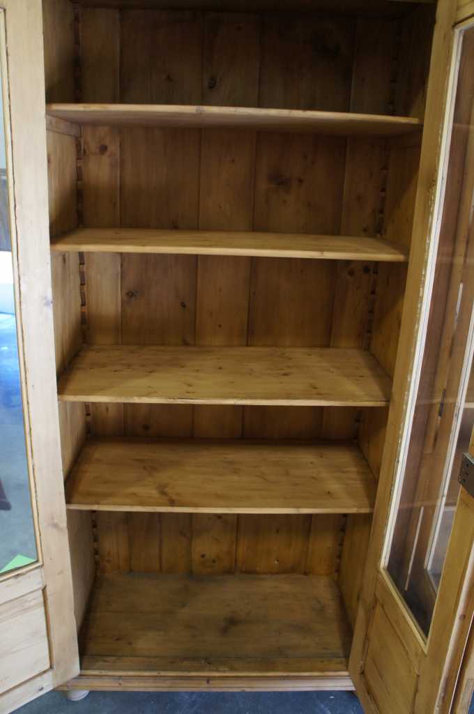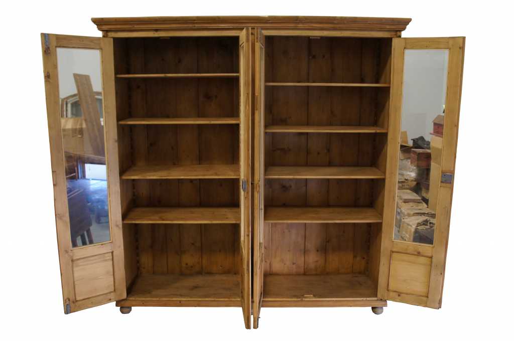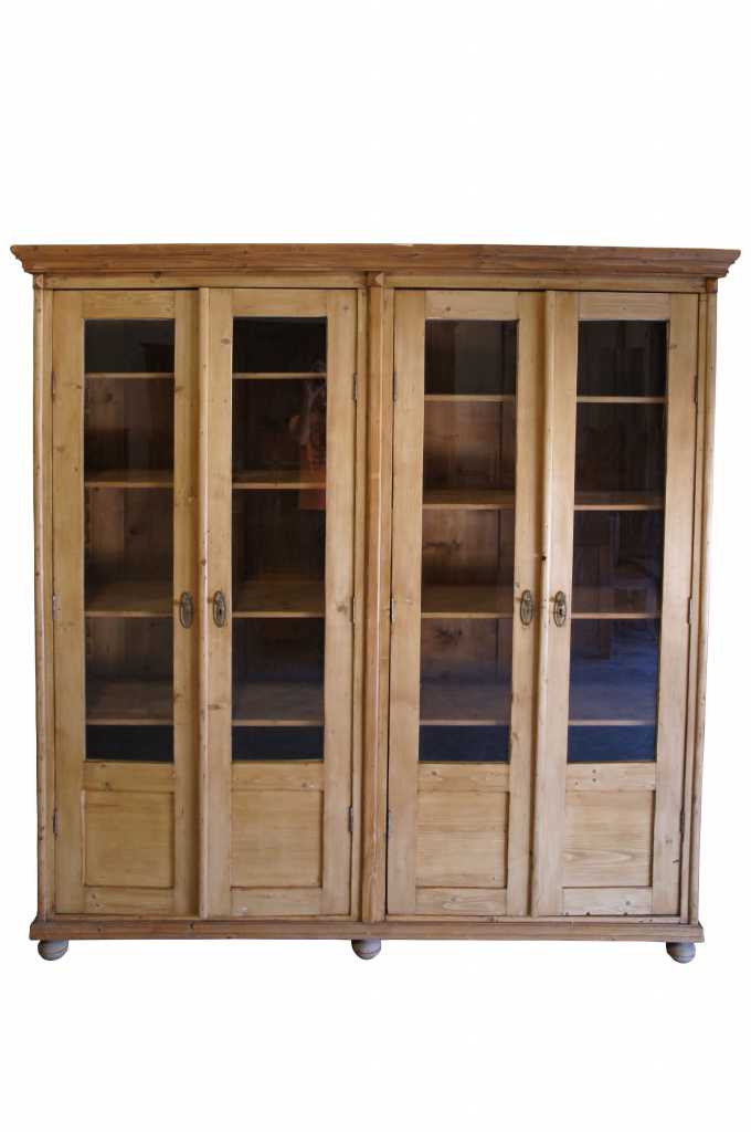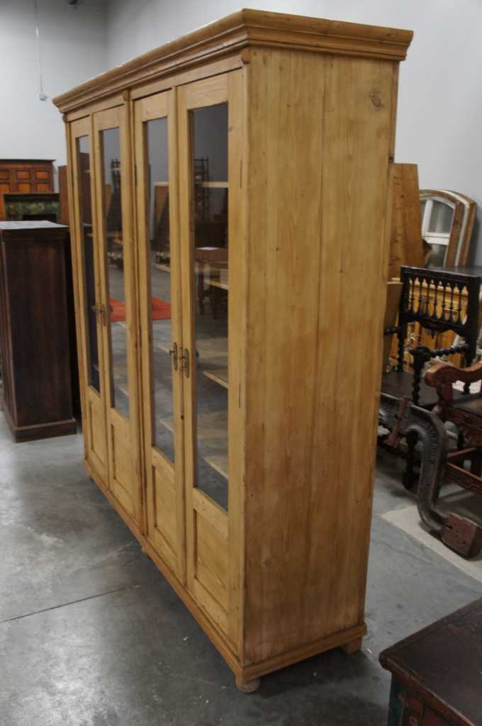 An antique 19th century European waxed pine bookcase. Features a glass front with two pairs of doors opening to four adjustable shelves on a saw-tooth system. The cabinet is mounted over bun feet. Doors include bronze hardware with a skeleton key for locking. A neat addition to any space.