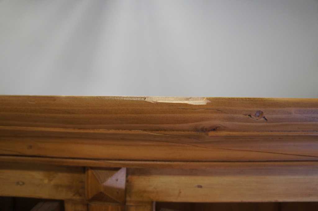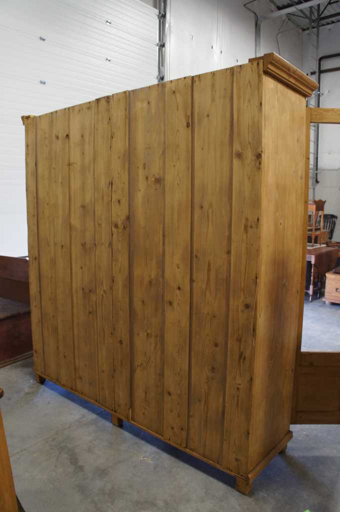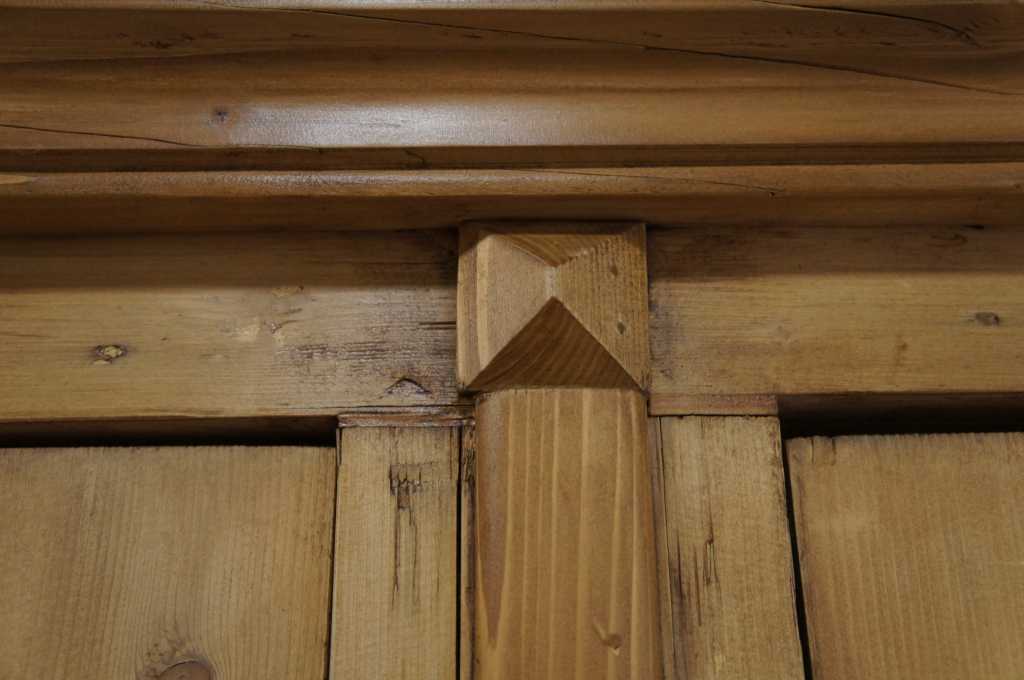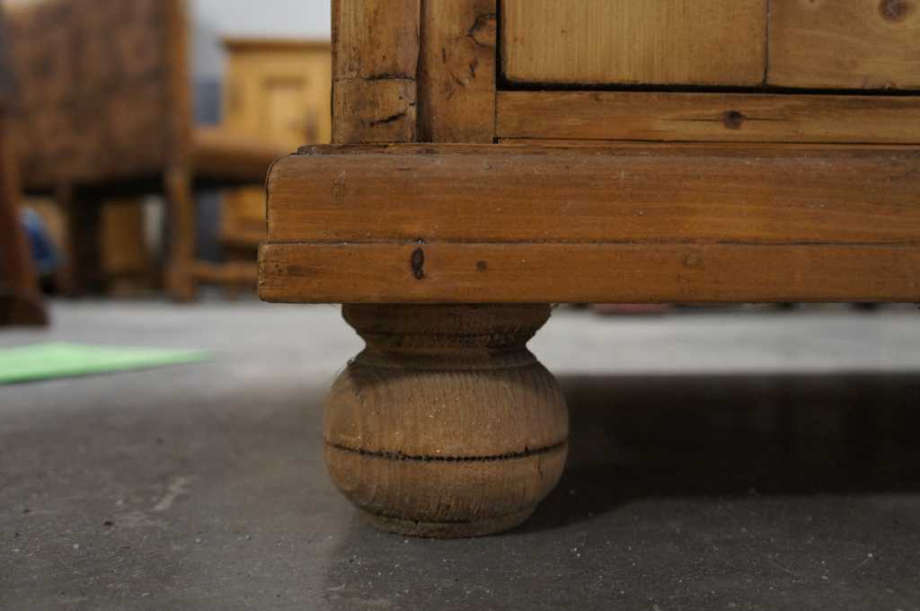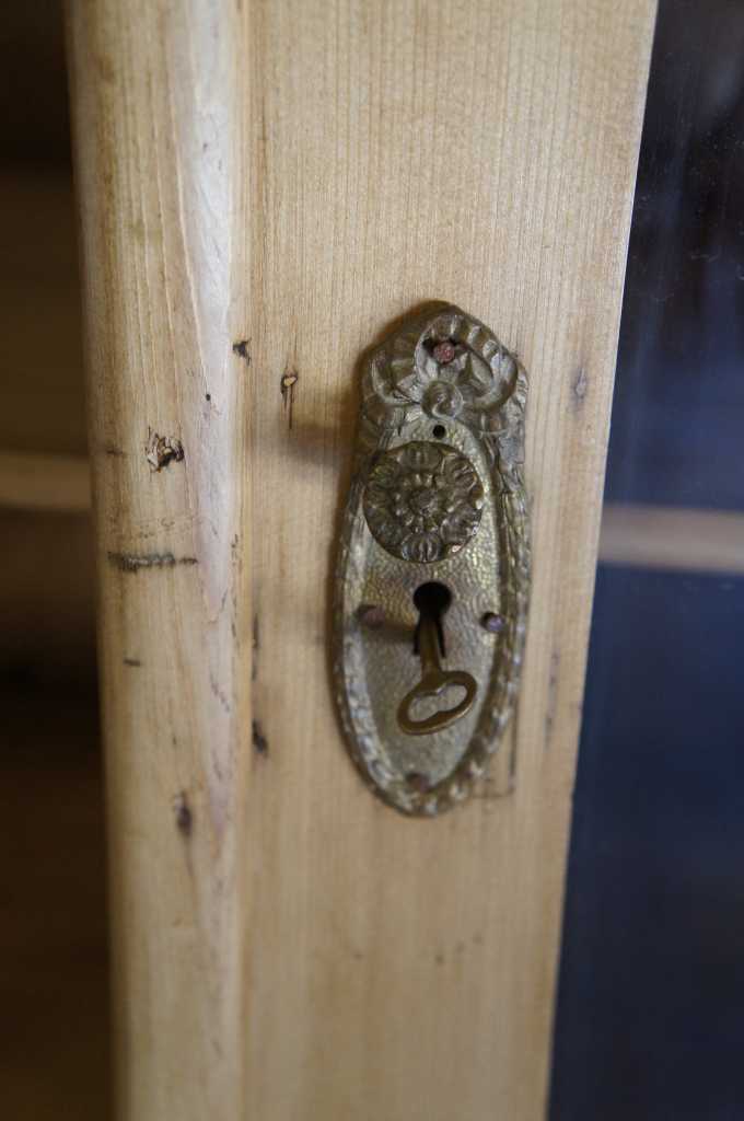 An antique 19th century European waxed pine bookcase. Features a glass front with two pairs of doors opening to four adjustable shelves on a saw-tooth system. The cabinet is mounted over bun feet. Doors include bronze hardware with a skeleton key for locking. A neat addition to any space.