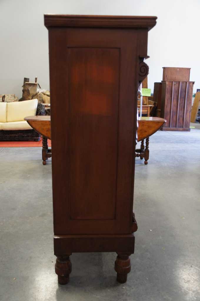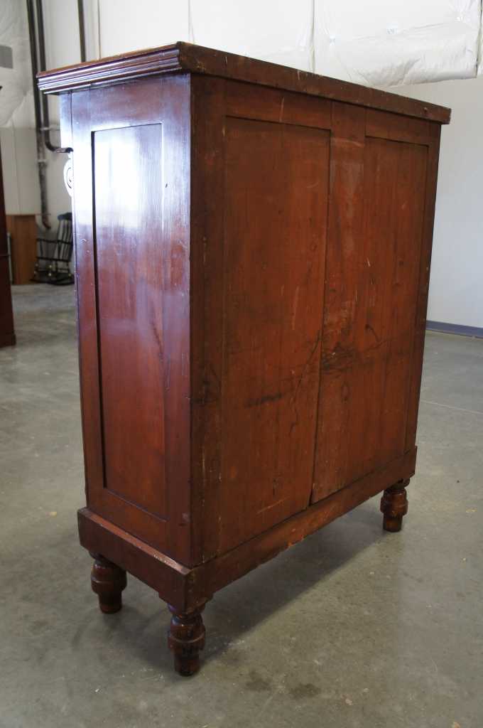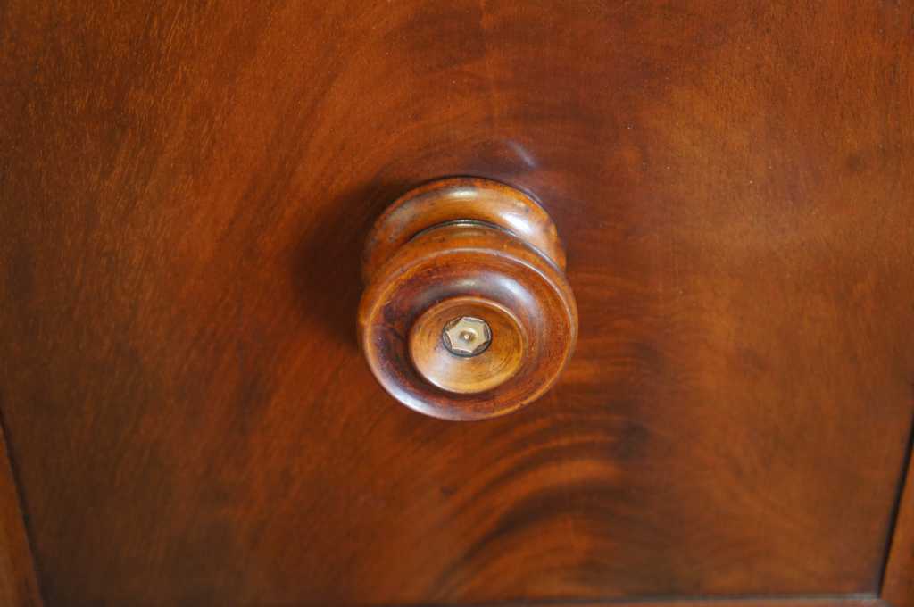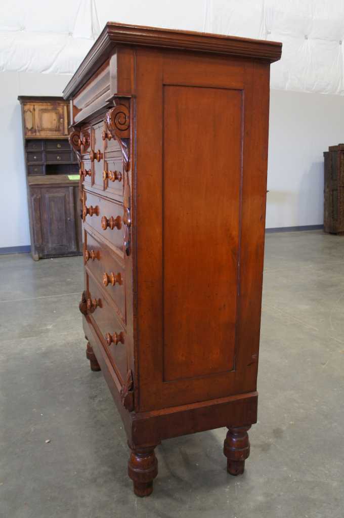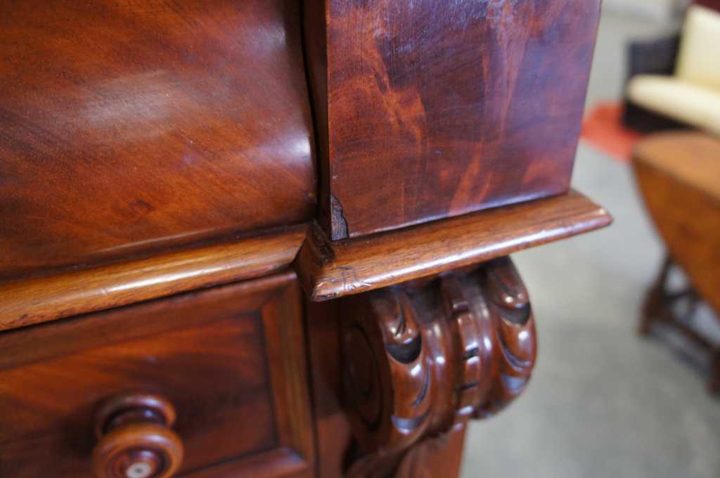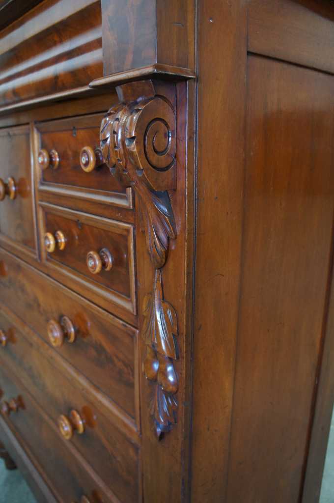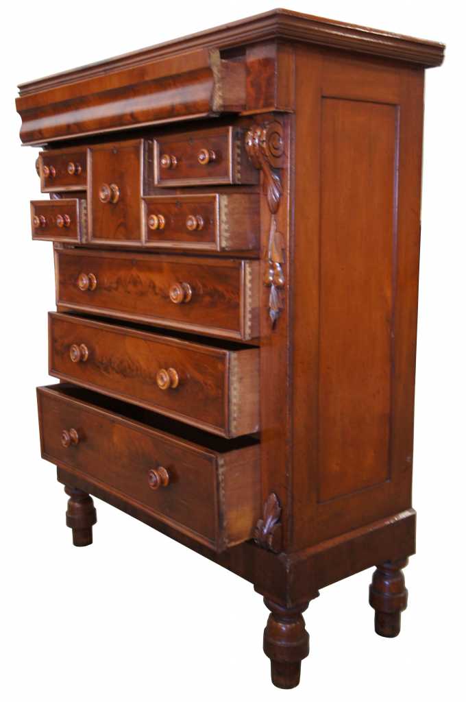 An exceptional example of Welsh craftsmanship. This monumental Empire chest of drawers draws you in again and again. Made from flame mahogany with extraordinary wood grain and beautifully scrolled acanthus carvings. There are 9 drawers offering sufficient storage including one towards the top made specifically for hats. The chest rests upon 4 turned legs. Circa 1850s. An astonishing piece of furniture that will add beauty and grandeur to any space.