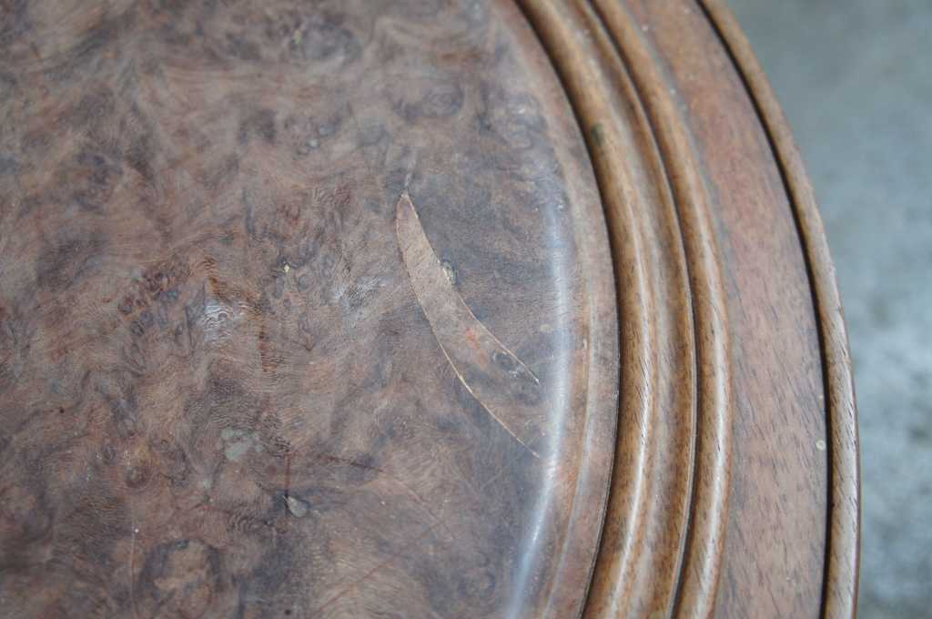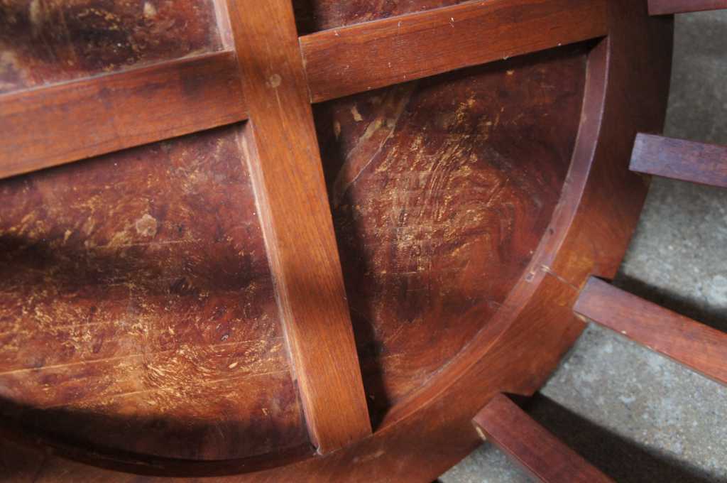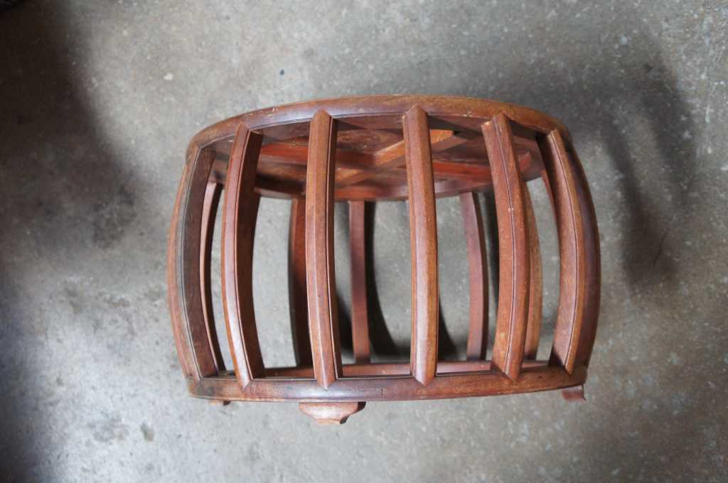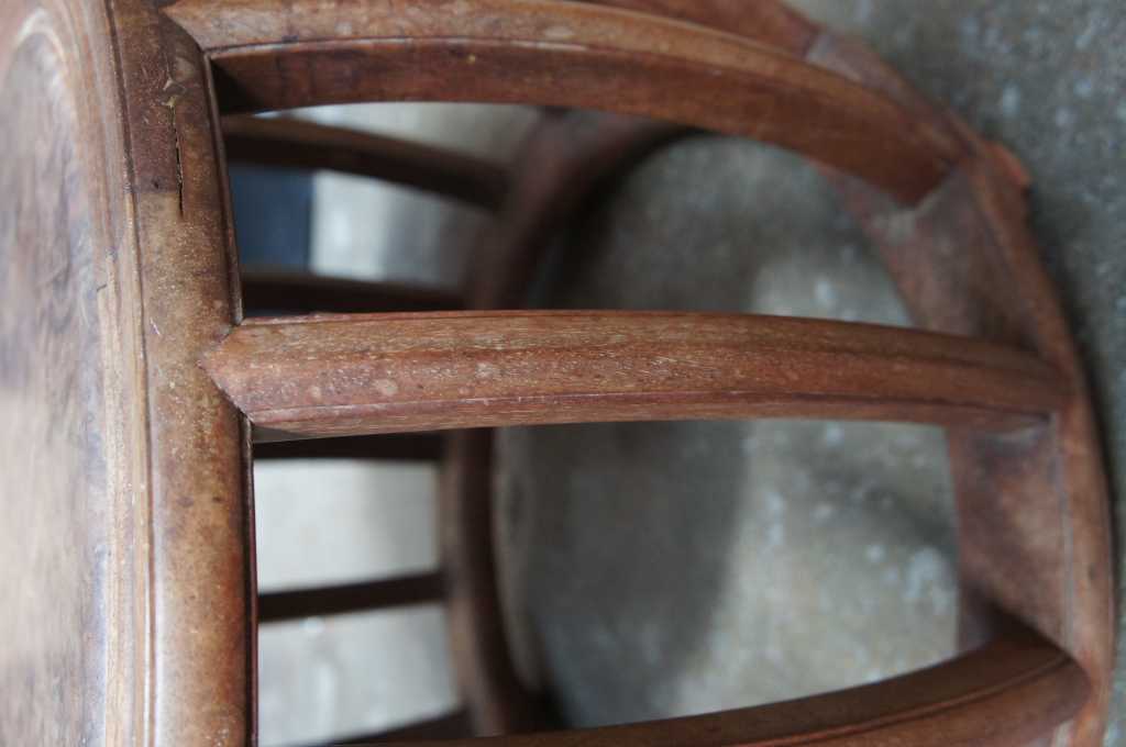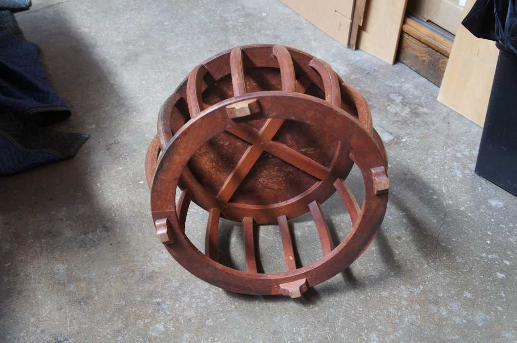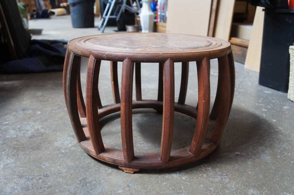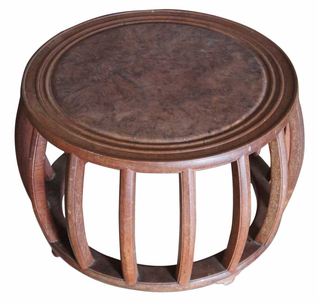 A beautiful natural elm barrel table. Features a burled top with two outer grooves adding dimensions. The base is slatted giving an open feel. Perfect for use a side, coffee table or foot rest. Circa 1960s.