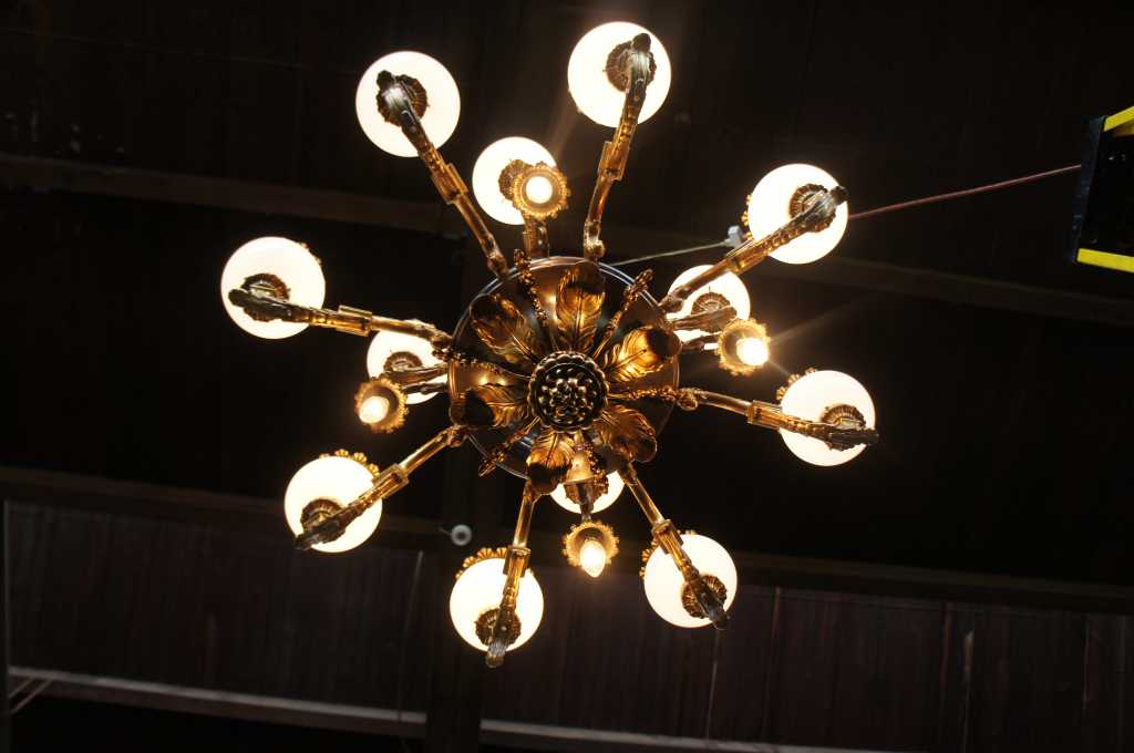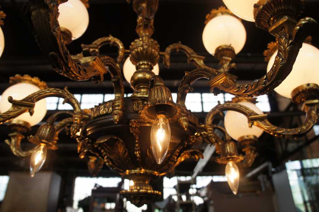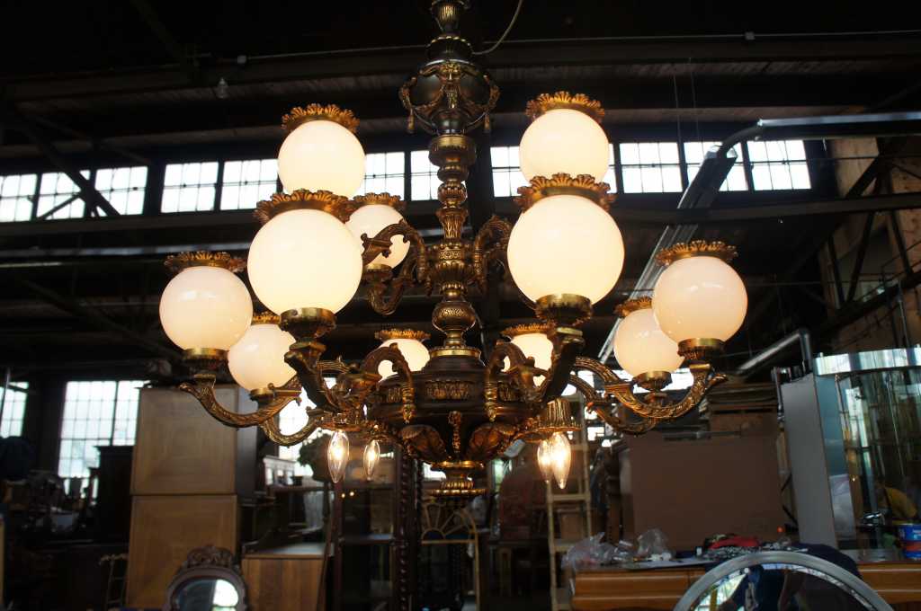 Monumental French Empire style 16 light, two tone bronze chandelier. Beautifully designed with twelve cast acanthus arms, acorn finials and globe lights. Northwind faces ordain the top and the bottom is perfectly illuminated by 4 down lights that glow upon an elaborate 6 petal flower. An irresistible light adding grandeur to any space.