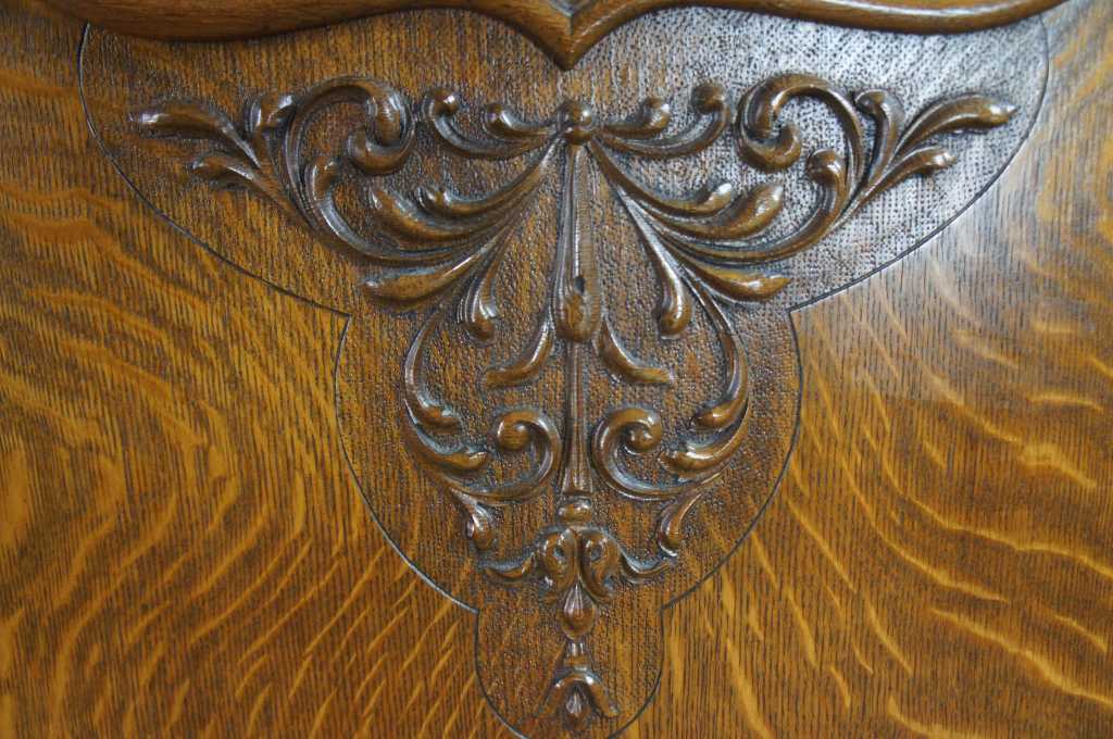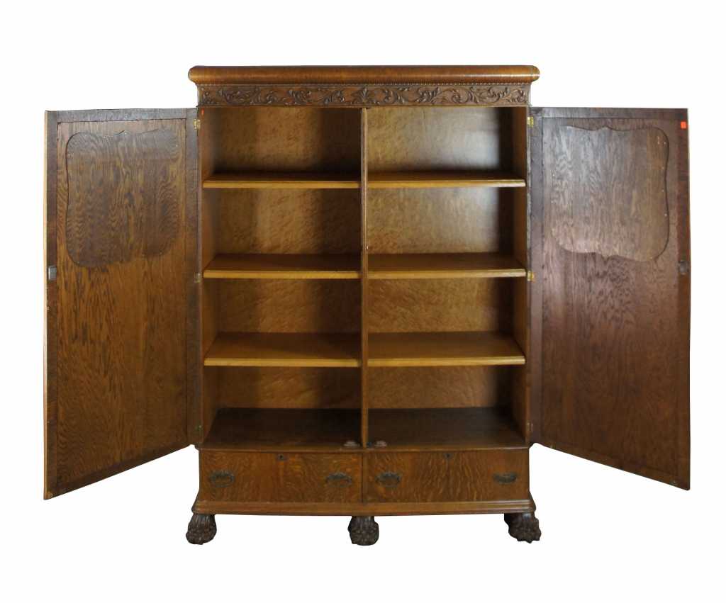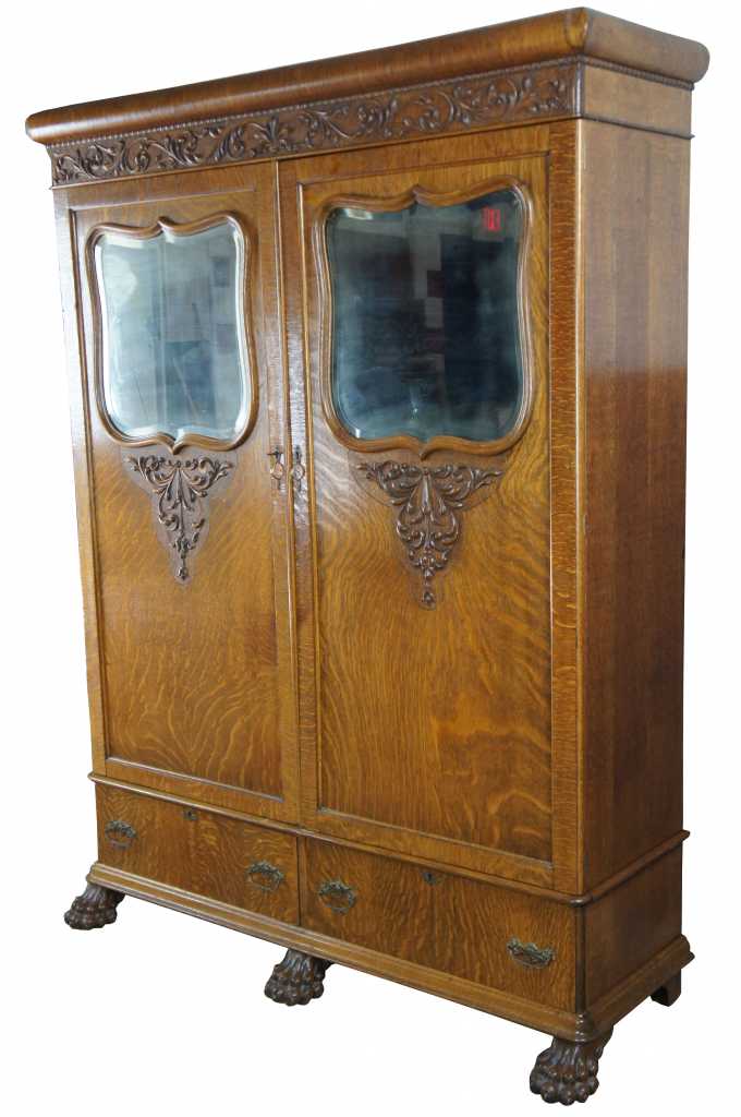 An exquisite circa 1900 Victorian wardrobe or linen closet. Empire inspired with large paw feet and a curved molding along the top. Features two beautifully carved and mirrored doors over large lower drawers. Made from Quartersawn oak with a magnificent wood grain. Opens to four shelves that can be removed in lieu of a hanging bar.