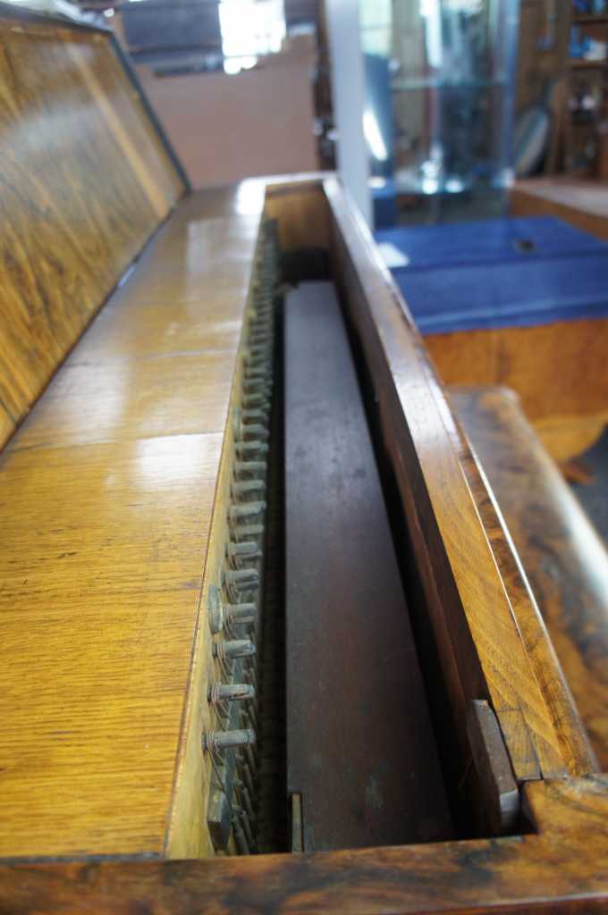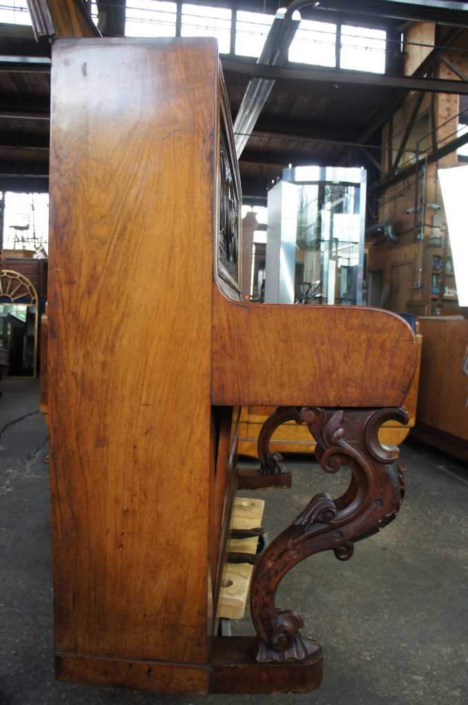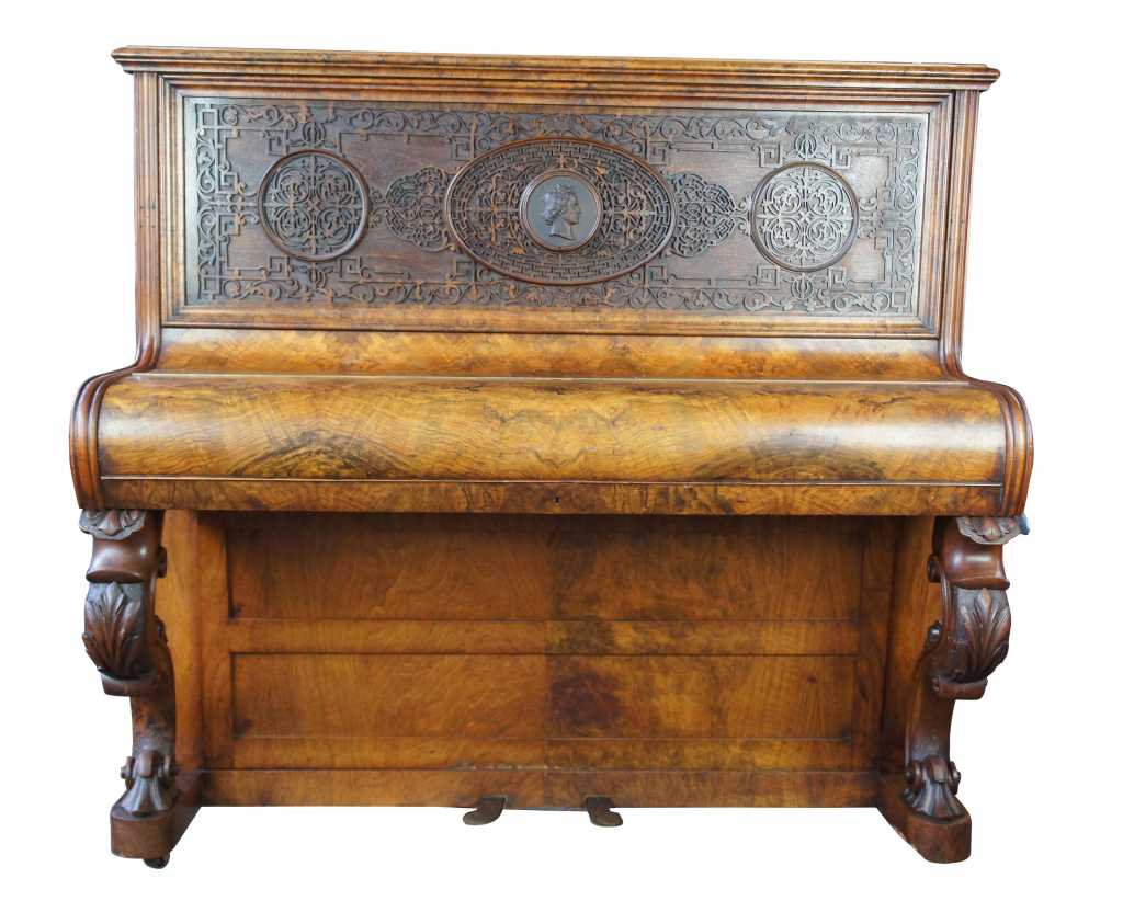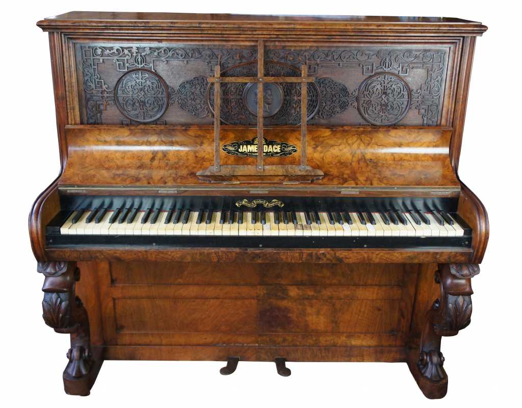 A gorgeous Victorian Upright Piano. Features a walnut burr case and ornate fretwork front panel with a Beethoven carved medallion along the center. Legs are cabriole in scrolling flare with meticulous carving. Marked James Dace, a piano shop that was founded in Chelmsford, Essed. Opening in 1852, they are still running as one of the oldest piano shops in the country.