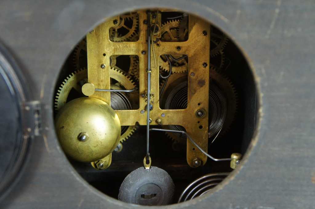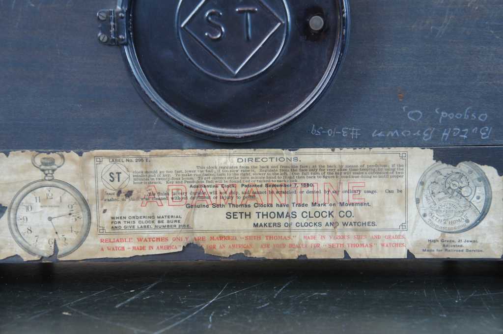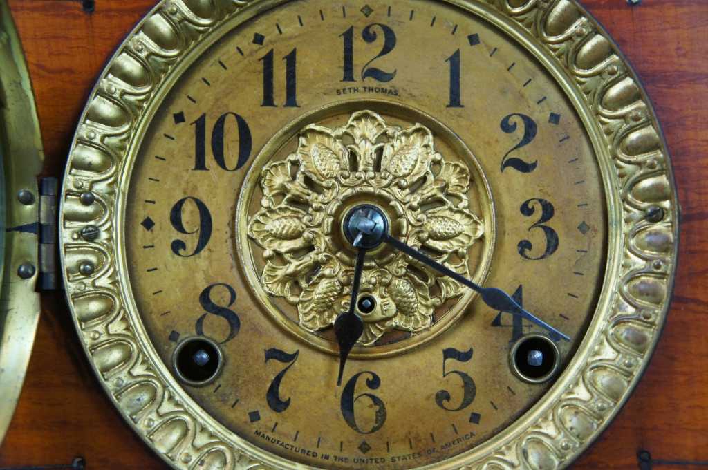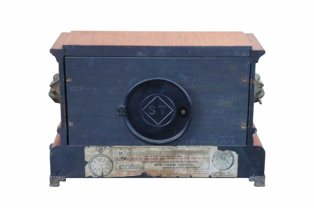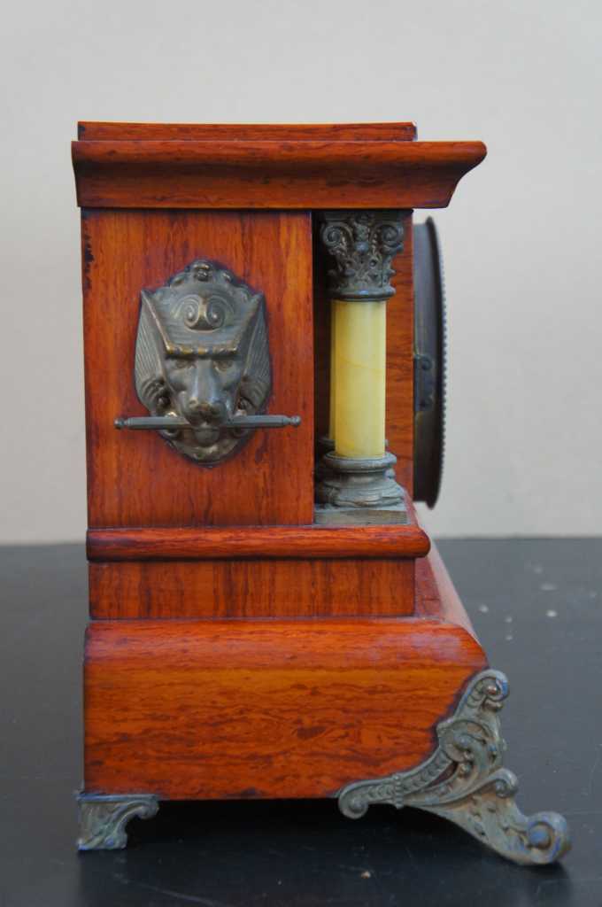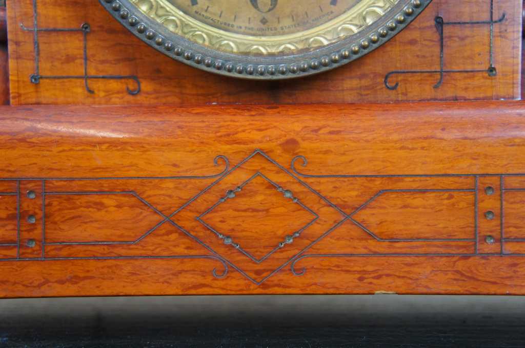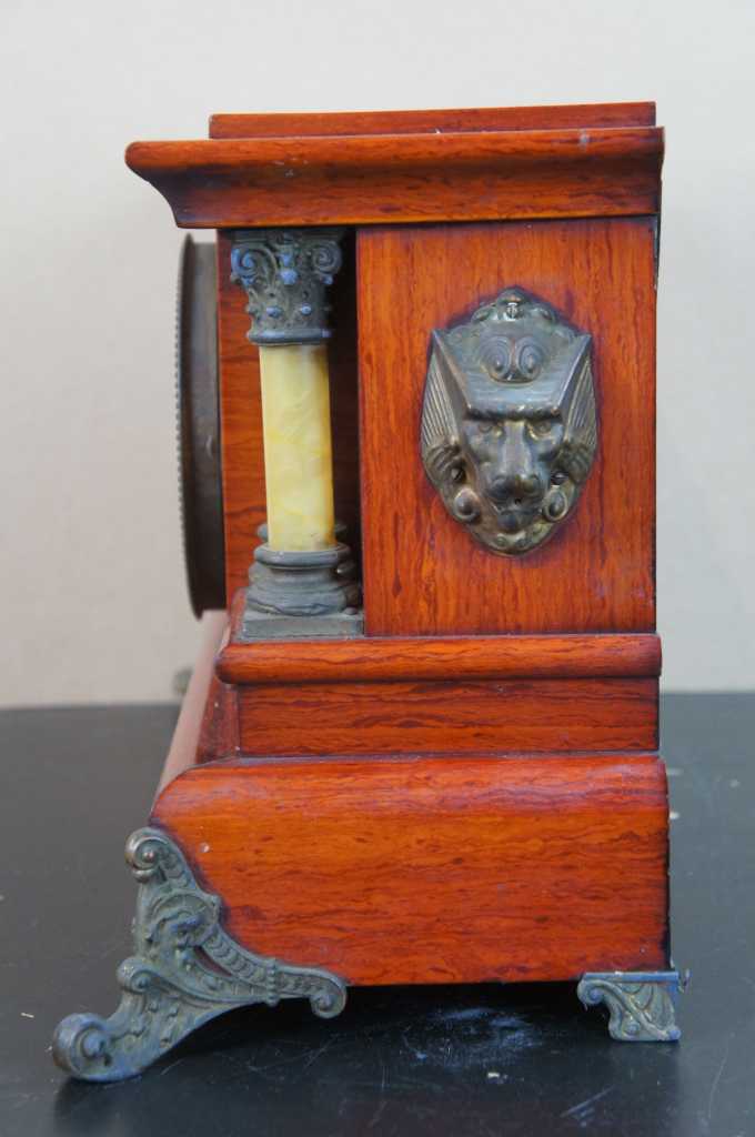 A gorgeous turn of the century mantel clock by Seth Thomas. Adamantine No 295 E. A light wood cherry finish with engraved detail. Features 4 amber colored pillars along the front, a brass face and lion heads along the sides.
