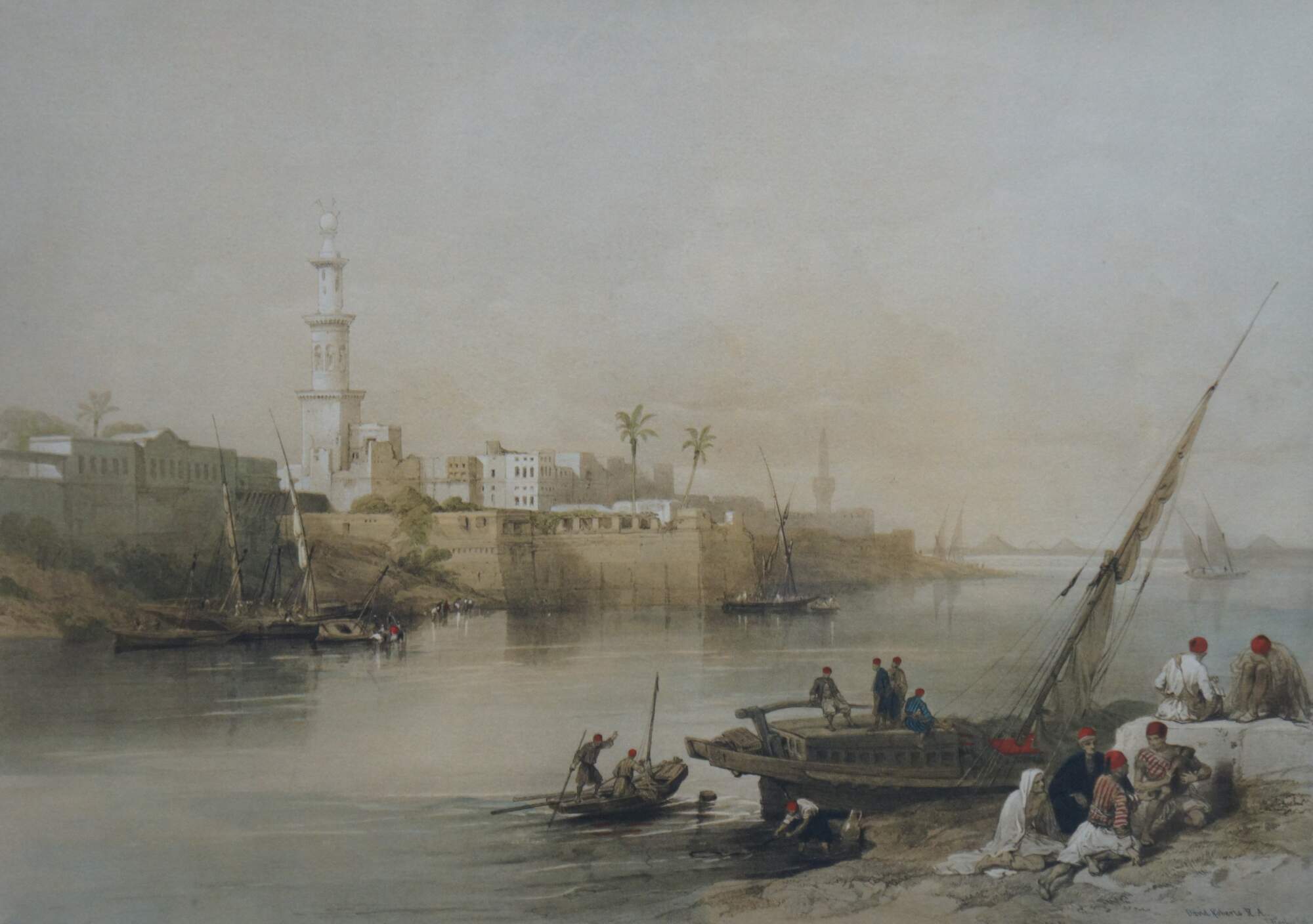 “David Roberts was born is Scotland in 1796. After moving to London, he achieved a respectable reputation as an artist prior to 1838 when he traveled to Egypt and the Holy Land to paint the monuments, architecture and people. Upon his return to England, his works were published (in conjunction with the lithographer Louis Haghe) in a six volume set, in which all 248 lithographs were hand colored. The first three volumes depicted Egypt and Nubia; the second three, the Holy Land. The set, which was sold by subscription, was an immediate success. Roberts was admitted to the Royal Academy and he continued to travel and paint until his death in 1864. After more than 150 years his paintings are still the most beloved and popular illustrations of Egypt and are highly sought after by collectors.”
