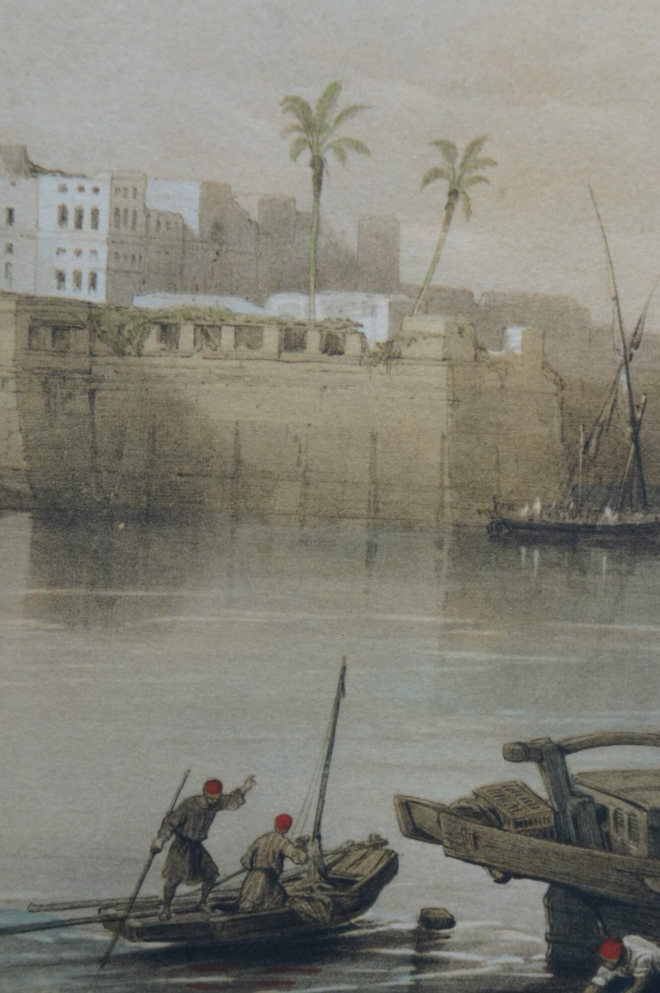 Pair of vintage hand colored lithograph prints by 19th century artist David Roberts, featuring Egyptian scenes, titled “Bazaar of the Silk Mercers, Cairo” and “View on the Nile Ferry to Gizeh"".