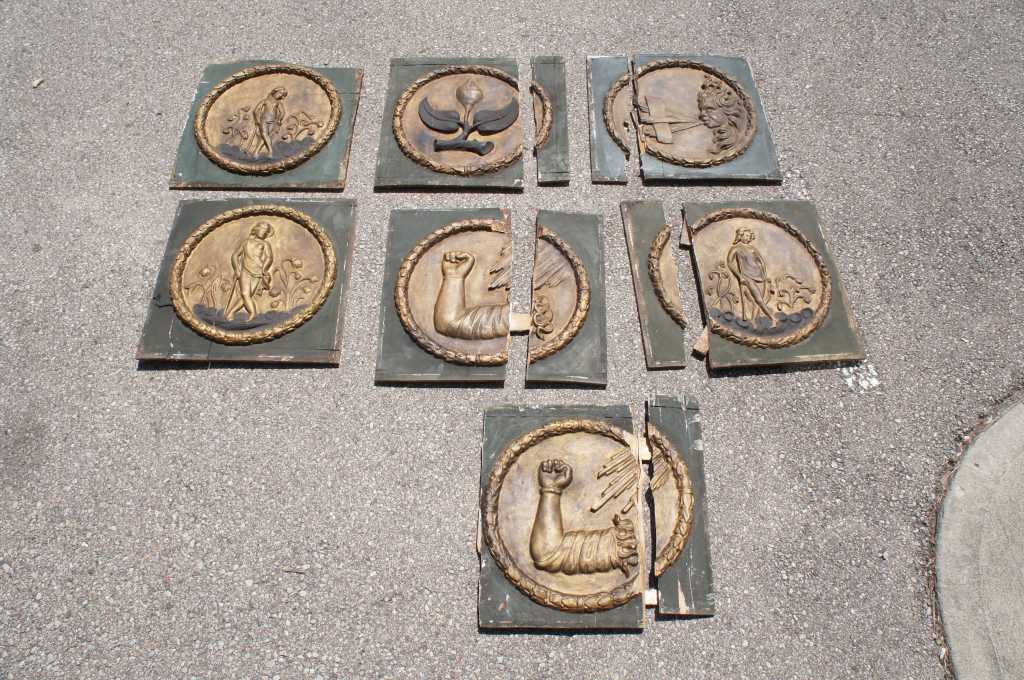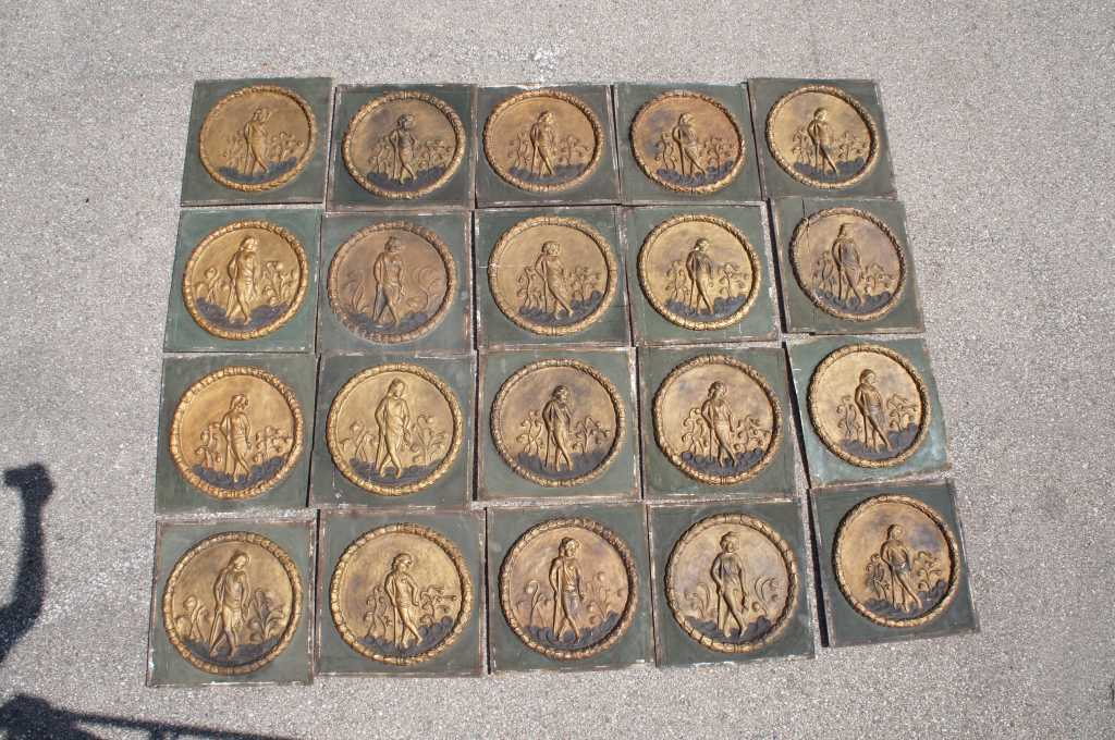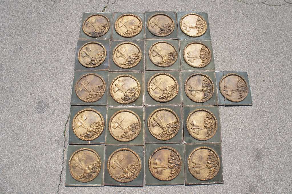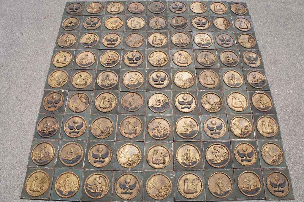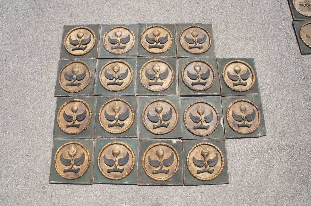 Up for consideration is a remarkable reclaimed early 20th century handmade ceiling. A reproduction made from the ceiling in the "Mantegna Chapel" of the Ca d'Oro Palace in Venice. Donated to the Dayton Art Institute in 1929. These beautiful tiles are made in a high relief polychrome design from wood with paint, gold leaf and gesso. 97 Tiles in total.
