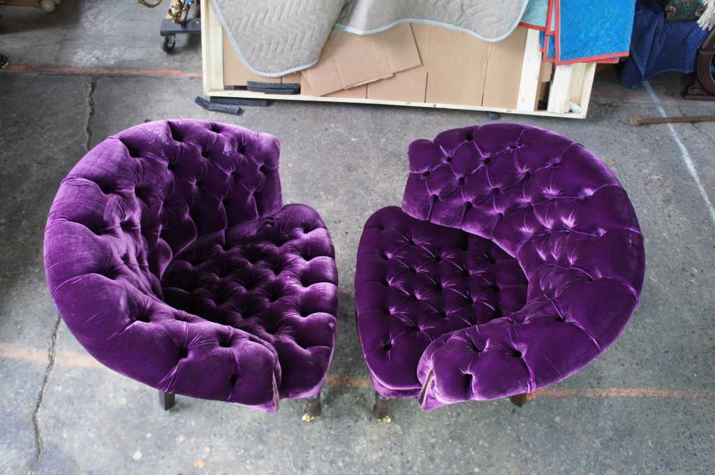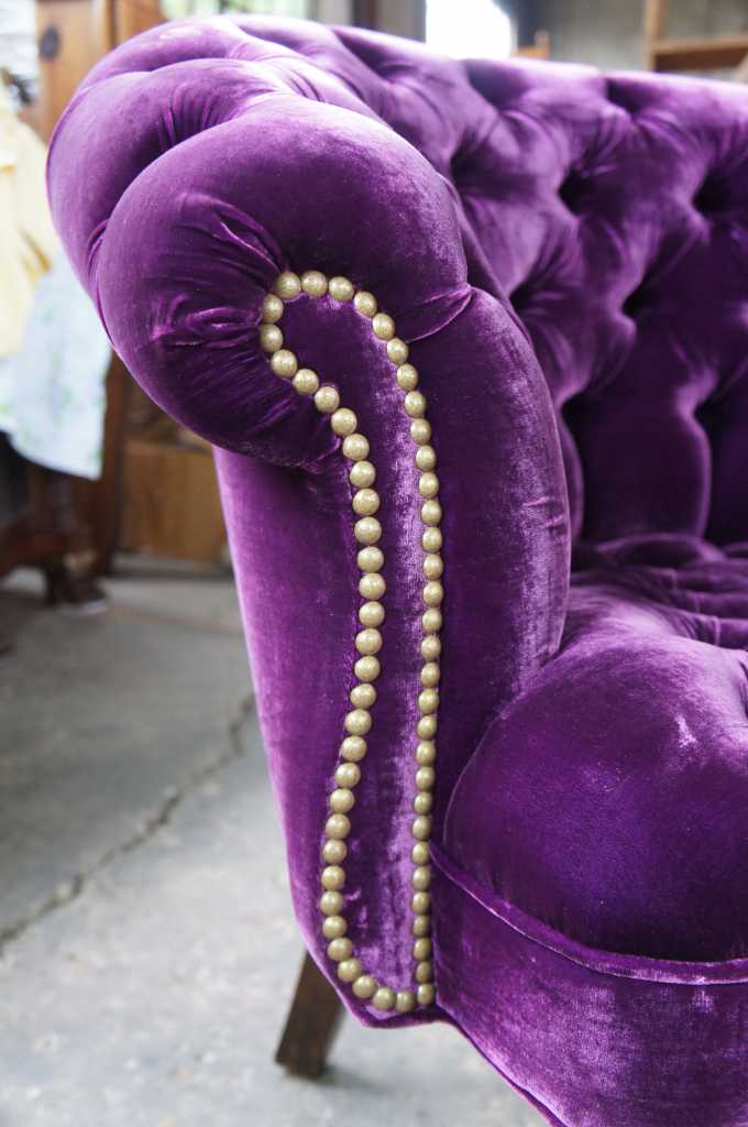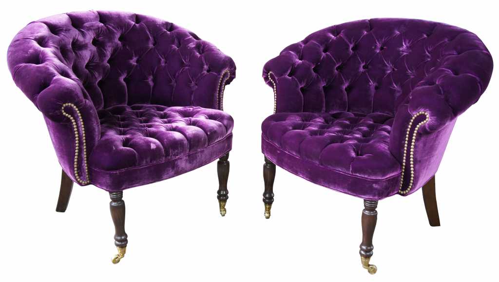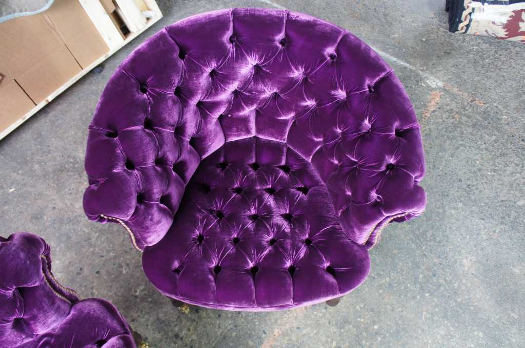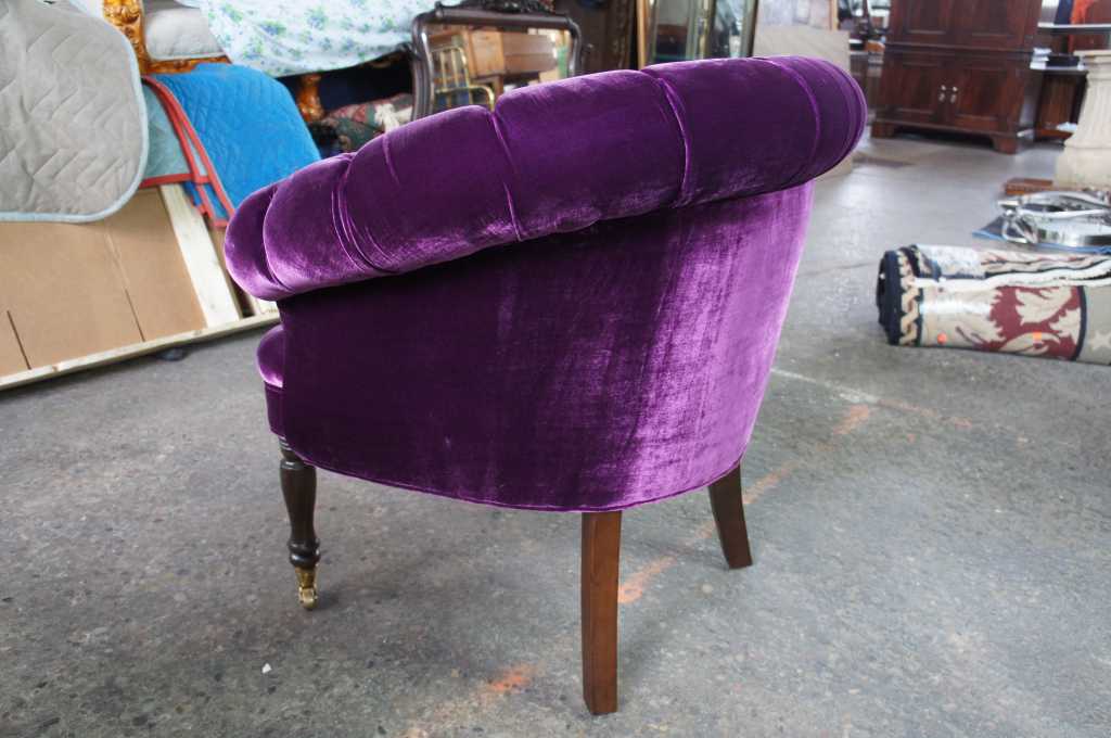 Handcrafted chair with contoured back, deep tufting, nailhead trim, and casters.