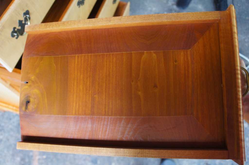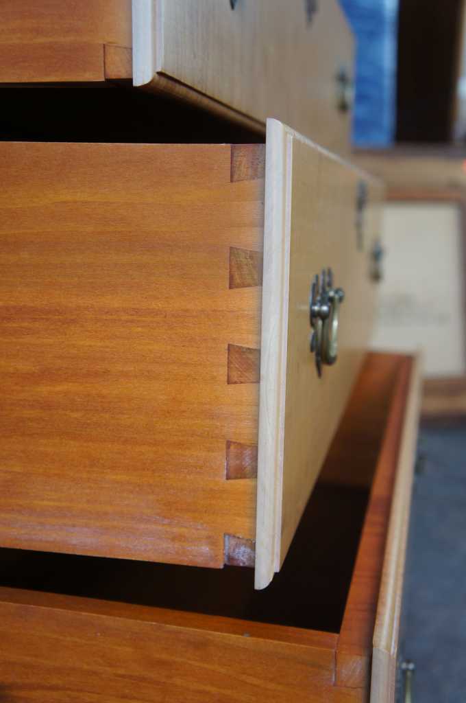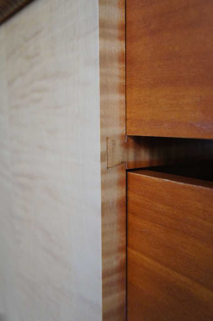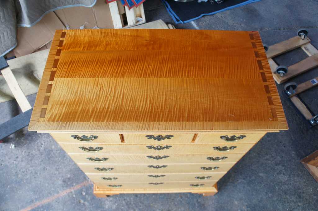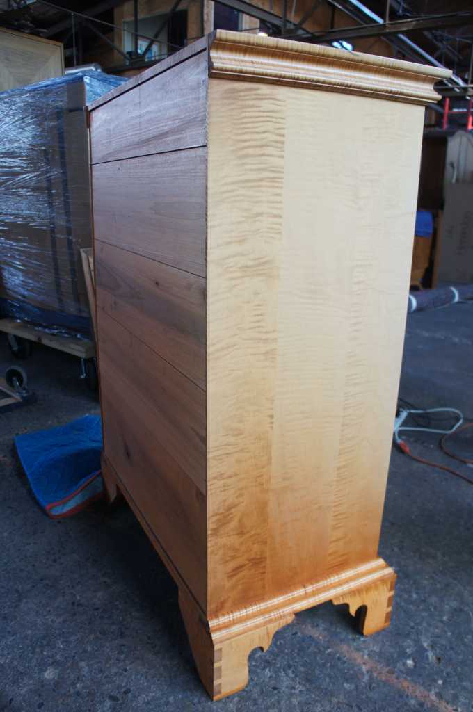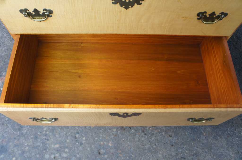 Early American style 8 drawer chest. A stunning 20th century reproduction handmade with curly maple and built using mortise and tenon. Features bracketed feet and Chippendale hardware.