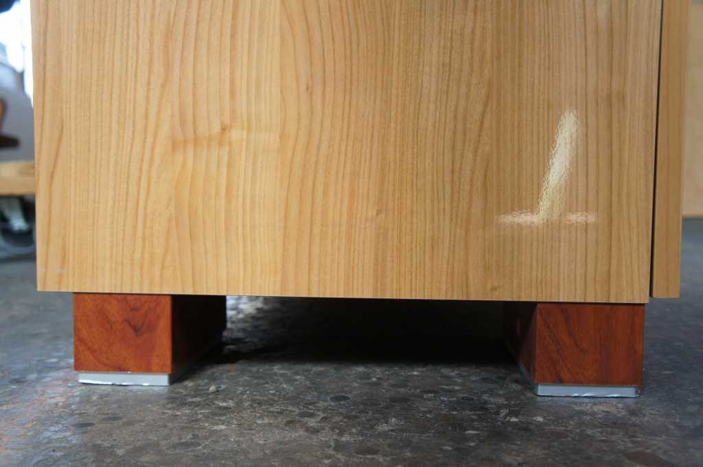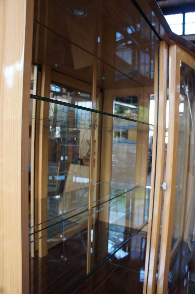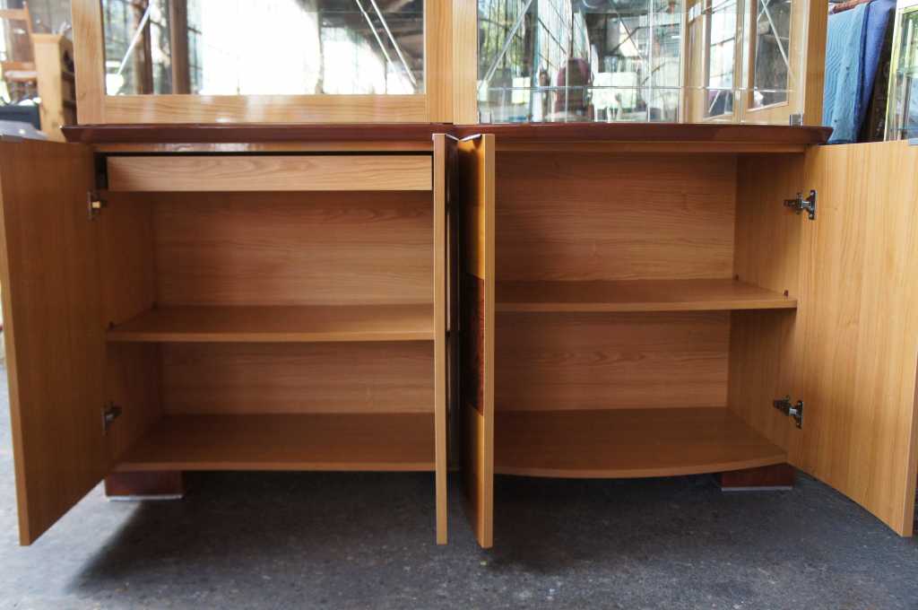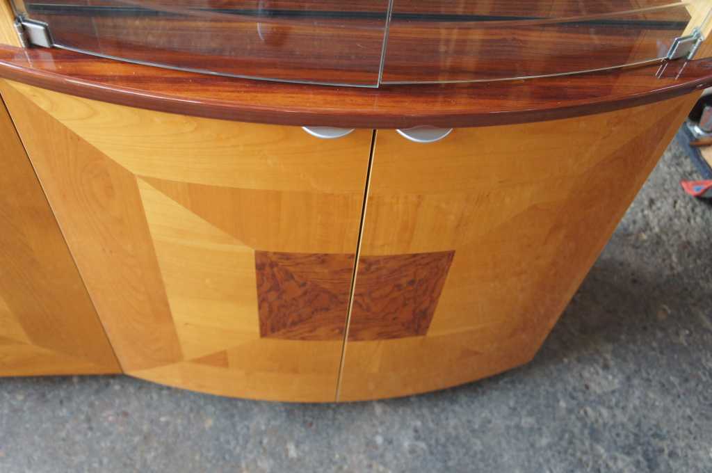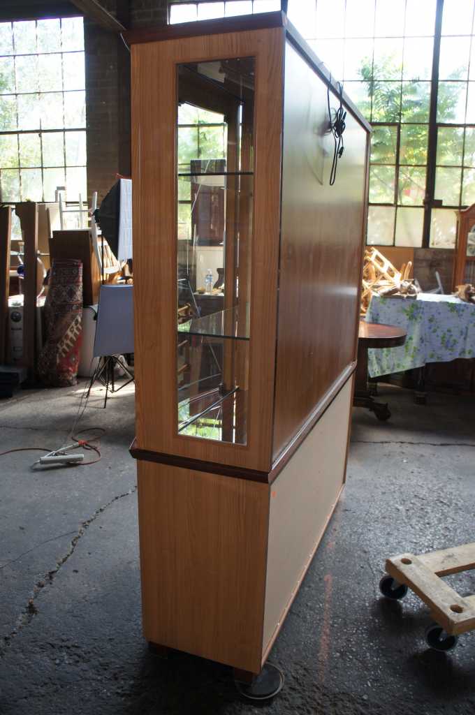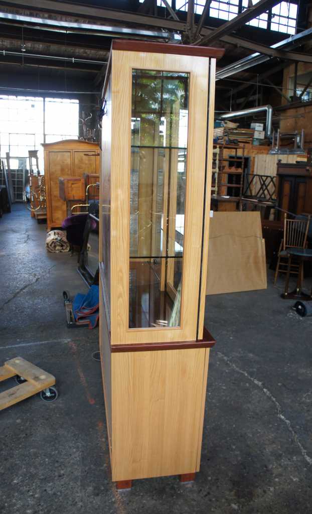 A gorgeous cabinet that can be used for display in any setting. Made from maple and walnut with a lacquered high-gloss finish. An illuminated top with mirrored backing over a cased bottom. Features a sliding door along the left and traditional doors to the right with etched glass.
