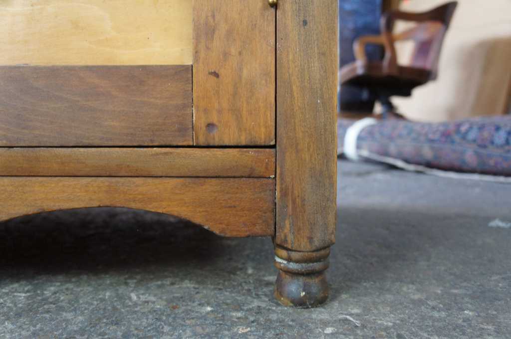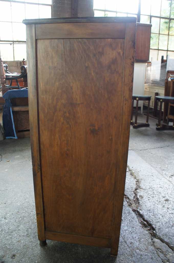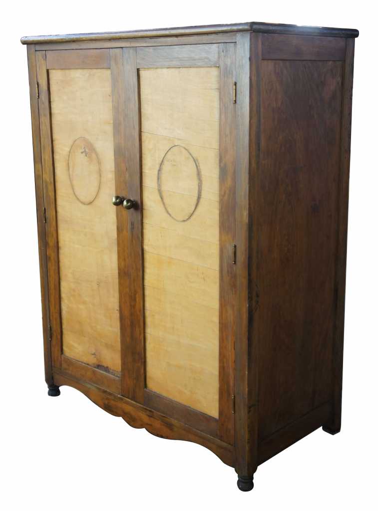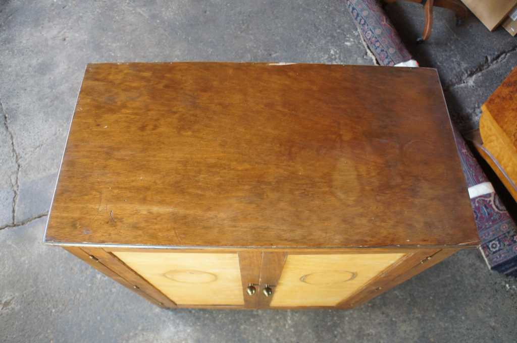 A lovely 1930s chifferobe. Made from walnut with a maple veneer inset along the front doors. Opens to drawers and shelves along the left and a hanging bar to the right.